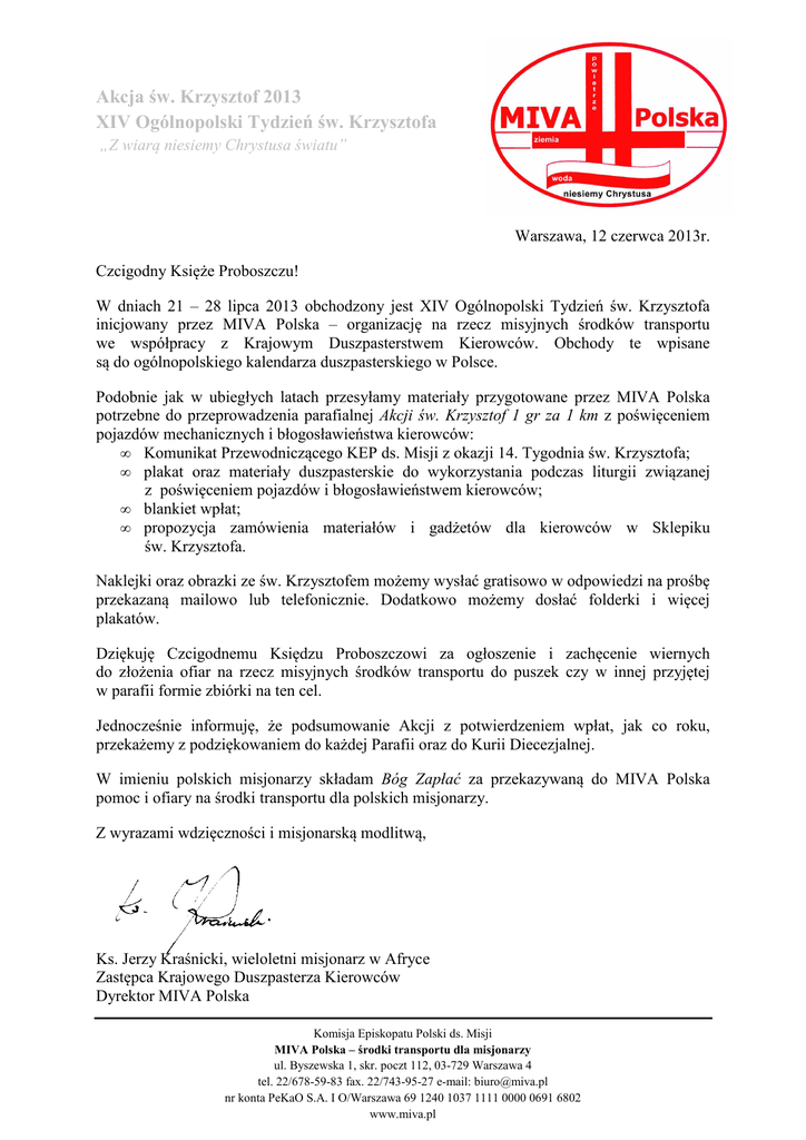 Akcja św. Krzysztof 2013 XIV Ogólnopolski Tydzień św. Krzysztofa „Z wiarą niesiemy Chrystusa światu” Warszawa, 12 czerwca 2013r. Czcigodny Księże Proboszczu! W dniach 21 – 28 lipca 2013 obchodzony jest XIV Ogólnopolski Tydzień św. Krzysztofa inicjowany przez MIVA Polska – organizację na rzecz misyjnych środków transportu we współpracy z Krajowym Duszpasterstwem Kierowców. Obchody te wpisane są do ogólnopolskiego kalendarza duszpasterskiego w Polsce. Podobnie jak w ubiegłych latach przesyłamy materiały przygotowane przez MIVA Polska potrzebne do przeprowadzenia parafialnej Akcji św. Krzysztof 1 gr za 1 km z poświęceniem pojazdów mechanicznych i błogosławieństwa kierowców: • Komunikat Przewodniczącego KEP ds. Misji z okazji 14. Tygodnia św. Krzysztofa; • plakat oraz materiały duszpasterskie do wykorzystania podczas liturgii związanej z poświęceniem pojazdów i błogosławieństwem kierowców; • blankiet wpłat; • propozycja zamówienia materiałów i gadżetów dla kierowców w Sklepiku św. Krzysztofa. Naklejki oraz obrazki ze św. Krzysztofem możemy wysłać gratisowo w odpowiedzi na prośbę przekazaną mailowo lub telefonicznie. Dodatkowo możemy dosłać folderki i więcej plakatów. Dziękuję Czcigodnemu Księdzu Proboszczowi za ogłoszenie i zachęcenie wiernych do złożenia ofiar na rzecz misyjnych środków transportu do puszek czy w innej przyjętej w parafii formie zbiórki na ten cel. Jednocześnie informuję, że podsumowanie Akcji z potwierdzeniem wpłat, jak co roku, przekażemy z podziękowaniem do każdej Parafii oraz do Kurii Diecezjalnej. W imieniu polskich misjonarzy składam Bóg Zapłać za przekazywaną do MIVA Polska pomoc i ofiary na środki transportu dla polskich misjonarzy. Z wyrazami wdzięczności i misjonarską modlitwą, Ks. Jerzy Kraśnicki, wieloletni misjonarz w Afryce Zastępca Krajowego Duszpasterza Kierowców Dyrektor MIVA Polska Komisja Episkopatu Polski ds. Misji MIVA Polska – środki transportu dla misjonarzy ul. Byszewska 1, skr. poczt 112, 03-729 Warszawa 4 tel. 22/678-59-83 fax. 22/743-95-27 e-mail: [email protected] nr konta PeKaO S.A. I O/Warszawa 69 1240 1037 1111 0000 0691 6802 www.miva.pl