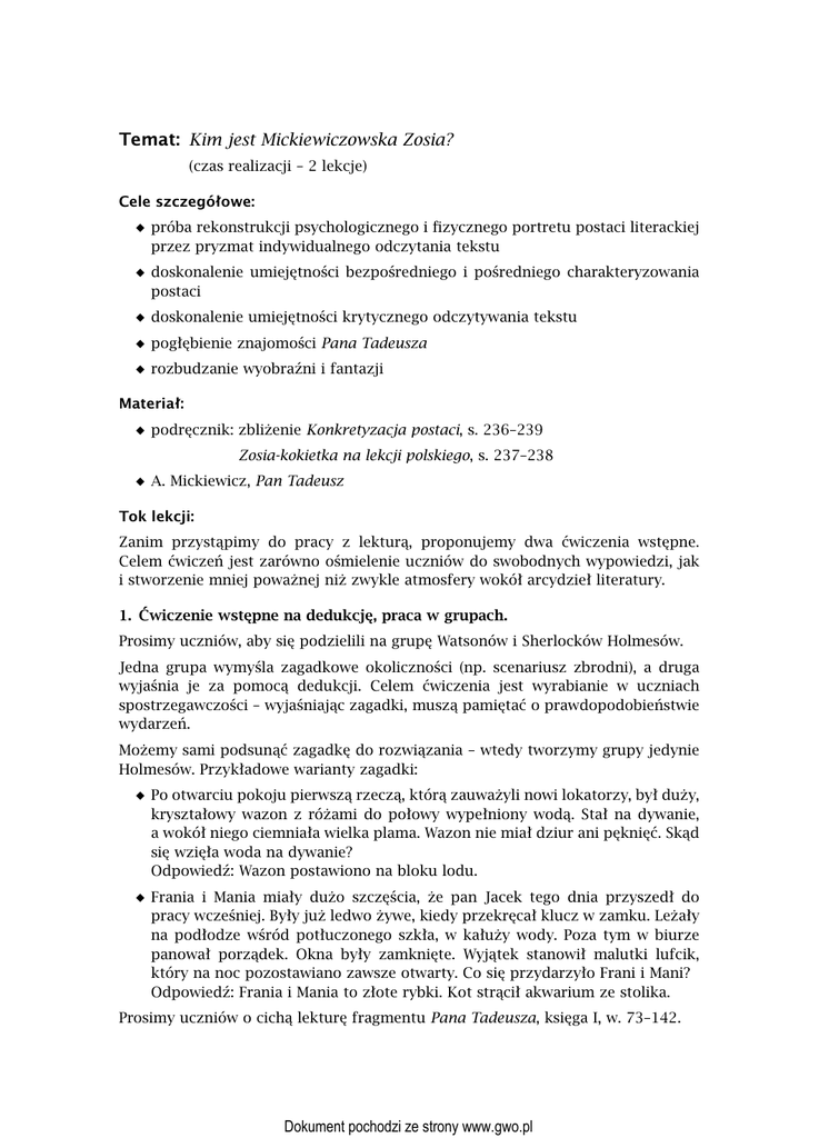 Temat: Kim jest Mickiewiczowska Zosia? (czas realizacji – 2 lekcje) Cele szczegółowe: próba rekonstrukcji psychologicznego i fizycznego portretu postaci literackiej przez pryzmat indywidualnego odczytania tekstu doskonalenie umiejętności bezpośredniego i pośredniego charakteryzowania postaci doskonalenie umiejętności krytycznego odczytywania tekstu pogłębienie znajomości Pana Tadeusza rozbudzanie wyobraźni i fantazji Materiał: podręcznik: zbliżenie Konkretyzacja postaci, s. 236–239 Zosia-kokietka na lekcji polskiego, s. 237–238 A. Mickiewicz, Pan Tadeusz Tok lekcji: Zanim przystąpimy do pracy z lekturą, proponujemy dwa ćwiczenia wstępne. Celem ćwiczeń jest zarówno ośmielenie uczniów do swobodnych wypowiedzi, jak i stworzenie mniej poważnej niż zwykle atmosfery wokół arcydzieł literatury. 1. Ćwiczenie wstępne na dedukcję, praca w grupach. Prosimy uczniów, aby się podzielili na grupę Watsonów i Sherlocków Holmesów. Jedna grupa wymyśla zagadkowe okoliczności (np. scenariusz zbrodni), a druga wyjaśnia je za pomocą dedukcji. Celem ćwiczenia jest wyrabianie w uczniach spostrzegawczości – wyjaśniając zagadki, muszą pamiętać o prawdopodobieństwie wydarzeń. Możemy sami podsunąć zagadkę do rozwiązania – wtedy tworzymy grupy jedynie Holmesów. Przykładowe warianty zagadki: Po otwarciu pokoju pierwszą rzeczą, którą zauważyli nowi lokatorzy, był duży, kryształowy wazon z różami do połowy wypełniony wodą. Stał na dywanie, a wokół niego ciemniała wielka plama. Wazon nie miał dziur ani pęknięć. Skąd się wzięła woda na dywanie? Odpowiedź: Wazon postawiono na bloku lodu. Frania i Mania miały dużo szczęścia, że pan Jacek tego dnia przyszedł do pracy wcześniej. Były już ledwo żywe, kiedy przekręcał klucz w zamku. Leżały na podłodze wśród potłuczonego szkła, w kałuży wody. Poza tym w biurze panował porządek. Okna były zamknięte. Wyjątek stanowił malutki lufcik, który na noc pozostawiano zawsze otwarty. Co się przydarzyło Frani i Mani? Odpowiedź: Frania i Mania to złote rybki. Kot strącił akwarium ze stolika. Prosimy uczniów o cichą lekturę fragmentu Pana Tadeusza, księga I, w. 73–142. Dokument pochodzi ze strony www.gwo.pl 2. Odnajdywanie w tekście szczegółów dotyczących Zosi, konfrontowanie własnych wniosków z opinią narratora (Tadeusza) – ćwiczenie w grupach czteroosobowych. Uczniowie znajdują w tekście charakterystyczne szczegóły dotyczące Zosi i metodą dedukcji analizują je i formułują wnioski. Warto zbadać, czy obserwacje i wnioski uczniowskie pokrywają się z sugestiami narratora. Jeśli się różnią, należy je przedyskutować, ustalić, na ile są możliwe, a na ile uczniów poniosła fantazja. Warto zwrócić uwagę na to, że zanim Tadeusz po raz pierwszy zobaczył Zosię, ujrzał odcisk jej stopy na piasku. Czego się dowiadujemy z badania śladu stopy i czy ustalenia Tadeusza są prawdopodobne? 3. Wizualizacja – ćwiczenie w grupach. Nadawanie znaczeń i konstruowanie dzięki skojarzeniom mapy rzeczywistości jest jedną z najpotężniejszych sił naszego umysłu. Świat jest taki, jakim czyni go nasza myśl. Aby sprawdzić tę oczywistą prawdę, proponujemy jedno z ćwiczeń wizualizujących. Można w tym celu na przykład pokazać uczniom abstrakcyjny rysunek i poprosić o opisanie go w paru zdaniach. Inną możliwością jest pokazanie fotografii przedstawiającej człowieka lub grupę osób i poproszenie o „psychologiczny portret” bohatera fotografii lub o opis stosunków panujących między sfotografowanymi osobami. Oczywiście nie sposób opisać wszystkich pomysłów, za pomocą których można uświadomić uczniom, że nasza wyobraźnia tworzy rzeczywistość. Ważne jest, aby uczniowie wyjaśnili, z czego wynikają ich wnioski, w jaki sposób analizowali znaki, na podstawie których stworzyli swój obraz rzeczywistości, oraz by porównali swoje spostrzeżenia. 4. Tworzenie portretu Zosi na podstawie różnych fragmentów tekstu – ćwiczenie w czteroosobowych zespołach badawczych. Tworzymy dziewięć grup, np. czteroosobowych, w zależności od liczby uczniów w klasie, które czytają następujące fragmenty tekstu: I grupa – w. 1–79 ks. III II grupa – w. 163–196 ks. III III grupa – w. 111–147 ks. IV IV grupa – w. 103–183 ks. V V grupa – w. 314–339 ks. X VI grupa – w. 422–472 ks. XI VII grupa – w. 583–640 ks. XI VIII grupa – w. 513–533 ks. XII IX grupa – w. 827–842 ks. XII Prosimy, aby uczniowie zwrócili uwagę nie tylko na wygląd Zosi, ale także na jej zachowanie. Przedstawiciele grup referują wyniki swojej pracy. Badamy, czy portret Zosi jest jednolity. Czy Zosia jest nieśmiała, czy raczej sprytna? Podsłuchuje rozmowę Tadeusza ze stryjem i daje odjeżdżającemu pamiątkę, aby o niej nie zapomniał – czy tak się zachowuje nieśmiała dziewczyna? A może Zosia jest pojętną wychowanką Telimeny, która świetnie wie, kiedy zniknąć, a kiedy przejąć inicjatywę (np. wybór stroju litewskiego wbrew radom Telimeny zapewnił Zosi duże powodzenie wśród wojskowych ruszających na bój o Polskę)? Telimena poucza Zosię, że dziewczyna, która nie dorasta na oczach tłumów, wydaje się Dokument pochodzi ze strony www.gwo.pl wszystkim piękniejsza i jest bardziej pożądana przez mężczyzn. Ale czy Zosia o tym nie wie? Niech uczniowie policzą, ile razy Zosia znika, widzimy tylko jej ślady, potrącone liście i snujemy domysły, kim jest. Być może uczniowie stworzą jednolity portret Zosi, ale jest także duże prawdopodobieństwo, że będą się różnili w swoich opiniach. 5. Praca domowa. Przeczytaj tekst Zosia-kokietka na lekcji polskiego oraz zbliżenie Konkretyzacja postaci (podręcznik, s. 236–239). Biorąc pod uwagę własne wnioski z lekcji, napisz charakterystykę Zosi. W swojej pracy wykorzystaj cytaty. Temat: Co nam z romantyzmu dzisiaj? (czas realizacji 