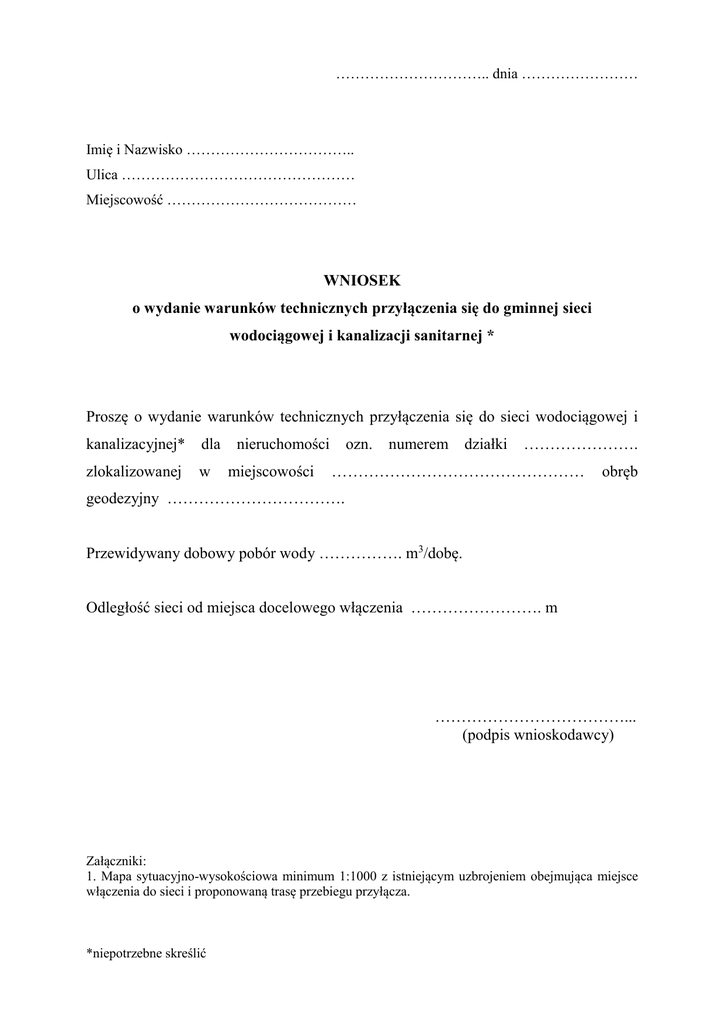 ………………………….. dnia …………………… Imię i Nazwisko …………………………….. Ulica ………………………………………… Miejscowość ………………………………… WNIOSEK o wydanie warunków technicznych przyłączenia się do gminnej sieci wodociągowej i kanalizacji sanitarnej * Proszę o wydanie warunków technicznych przyłączenia się do sieci wodociągowej i kanalizacyjnej* dla zlokalizowanej w nieruchomości miejscowości ozn. numerem działki …………………. ………………………………………… obręb geodezyjny ……………………………. Przewidywany dobowy pobór wody ……………. m3/dobę. Odległość sieci od miejsca docelowego włączenia ……………………. m ………………………………... (podpis wnioskodawcy) Załączniki: 1. Mapa sytuacyjno-wysokościowa minimum 1:1000 z istniejącym uzbrojeniem obejmująca miejsce włączenia do sieci i proponowaną trasę przebiegu przyłącza. *niepotrzebne skreślić