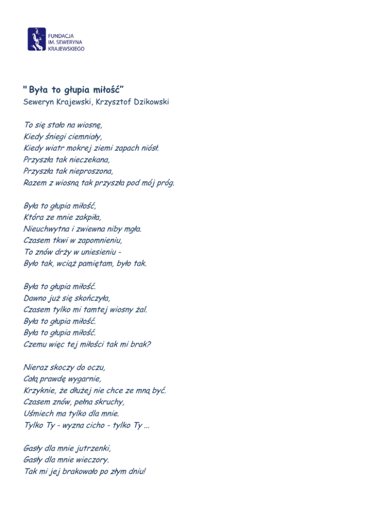 " Była to głupia miłość” Seweryn Krajewski, Krzysztof Dzikowski To się stało na wiosnę, Kiedy śniegi ciemniały, Kiedy wiatr mokrej ziemi zapach niósł. Przyszła tak nieczekana, Przyszła tak nieproszona, Razem z wiosną tak przyszła pod mój próg. Była to głupia miłość, Która ze mnie zakpiła, Nieuchwytna i zwiewna niby mgła. Czasem tkwi w zapomnieniu, To znów drży w uniesieniu Było tak, wciąż pamiętam, było tak. Była to głupia miłość. Dawno już się skończyła, Czasem tylko mi tamtej wiosny żal. Była to głupia miłość. Była to głupia miłość. Czemu więc tej miłości tak mi brak? Nieraz skoczy do oczu, Całą prawdę wygarnie, Krzyknie, że dłużej nie chce ze mną być. Czasem znów, pełna skruchy, Uśmiech ma tylko dla mnie. Tylko Ty - wyzna cicho - tylko Ty ... Gasły dla mnie jutrzenki, Gasły dla mnie wieczory. Tak mi jej brakowało po złym dniu! I czekałem, by przyszła, Żeby we mnie rozbłysła, Żeby mnie we władanie wzięła znów. Była to głupia miłość. Dawno już się skończyła, Czasem tylko mi tamtej wiosny żal. Była to głupia miłość. Była to głupia miłość. Czemu więc tej miłości tak mi brak? Było w niej coś lekkiego, Było w niej coś zwiewnego, Była wciąż jak wiosenny, ciepły wiatr. Pełna życia, szalona, Pełnią wiosny natchniona. Chciałem z nią fruwać w chmurach niby ptak Była to głupia miłość. Dawno już się skończyła, Czasem tylko mi tamtej wiosny żal. Była to głupia miłość. Była to głupia miłość. Czemu więc tej miłości tak mi brak?