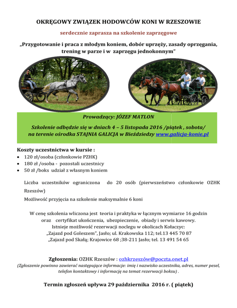 OKRĘGOWY ZWIĄZEK HODOWCÓW KONI W RZESZOWIE serdecznie zaprasza na szkolenie zaprzęgowe „Przygotowanie Przygotowanie i praca z młodym koniem, dobór uprzęży, zasady oprzęgania, trening w parze i w zaprzęgu jednokonnym” jednokonnym Prowadzący JÓZEF MATLON Prowadzący: Szkolenie odbędzie się w dniach 4 – 5 listopada 2016 /piątek , sobota/ na terenie ośrodka STAJNIA GALICJA w Bieździedzy www.galicja-konie.pl www.galicja Koszty uczestnictwa w kursie : • 120 zł/osoba (członkowie PZHK) P • 180 zł /osoba - pozostali uczestnicy • 50 zł /boks udział z własnym koniem Liczba uczestników ograniczona do 20 osób (pierwszeństwo członkowie OZHK Rzeszów) Możliwość przyjęcia na szkolenie maksymalnie 6 koni W cenę szkolenia wliczona wliczon jest teoria i praktyka w łącznym wymiarze 16 godzin oraz certyfikat ukończenia, ukończenia ubezpieczenie, obiady i serwis kawowy. Istnieje możliwość rezerwacji noclegu w okolicach Kołaczyc: „Zajazd pod Goleszem”, Jasło; ul. Krakowska 112; tel.13 445 70 87 „Zajazd ajazd pod Skałą; Krajowice 68 ;38-211 ;38 Jasło; tel. 13 491 54 65 Zgłoszenia: OZHK Rzeszów : ozhkrzeszó[email protected] (Zgłoszenie powinno zawierać następujące informacje: imię i nazwisko uczestnika, adres, numer pesel, telefon kontaktowy i informację na temat rezerwacji boksu) . Termin zgłoszeń upływa 29 października 2016 r. ( piątek) Szczegółowy program szkolenia dostępny w OZHK Rzeszów