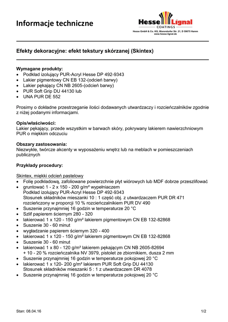Informacje techniczne Hesse GmbH & Co. KG, Warendorfer Str. 21, D 59075 Hamm www.hesse-lignal.de Efekty dekoracyjne: efekt tekstury skórzanej (Skintex) Wymagane produkty: Podkład izolujący PUR-Acryl Hesse DP 492-9343 Lakier pigmentowy CN EB 132-(odcień barwy) Lakier pękający CN NB 2605-(odcień barwy) PUR Soft Grip DU 44130 lub UNA PUR DE 552 Prosimy o dokładne przestrzeganie ilości dodawanych utwardzaczy i rozcieńczalników zgodnie z niżej podanymi informacjami. Opis/właściwości: Lakier pękający, przede wszystkim w barwach skóry, pokrywany lakierem nawierzchniowym PUR o miękkim odczuciu Obszary zastosowania: Niezwykłe, twórcze akcenty w wyposażeniu wnętrz lub na meblach w pomieszczeniach publicznych Przykłady procedury: Skintex, miękki odcień pastelowy Folię podkładową, zafoliowane powierzchnie płyt wiórowych lub MDF dobrze przeszlifować gruntować 1 - 2 x 150 - 200 g/m² wypełniaczem Podkład izolujący PUR-Acryl Hesse DP 492-9343 Stosunek składników mieszanki 10 : 1 część obj. z utwardzaczem PUR DR 471 rozcieńczony w proporcji 10 % rozcieńczalnikiem PUR DV 490 Suszenie przynajmniej 16 godzin w temperaturze 20 °C Szlif papierem ściernym 280 - 320 lakierować 1 x 120 - 150 g/m² lakierem pigmentowym CN EB 132-82868 Suszenie 30 - 60 minut wygładzanie papierem ściernym 320 - 400 lakierować 1 x 120 - 150 g/m² lakierem pigmentowym CN EB 132-82868 Suszenie 30 - 60 minut lakierować 1 x 80 - 120 g/m² lakierem pękającym CN NB 2605-82694 + 10 - 20 % rozcieńczalnika NV 3979, pistolet ze zbiornikiem, dusza 2 mm Suszenie przynajmniej 16 godzin w temperaturze pokojowej 20 °C lakierować 1 x 120- 200 g/m² lakierem PUR Soft Grip DU 44130 Stosunek składników mieszanki 5 : 1 z utwardzaczem DR 4078 Suszenie przynajmniej 16 godzin w temperaturze pokojowej 20 °C Stan: 08.04.16 1/2 Informacje techniczne Hesse GmbH & Co. KG, Warendorfer Str. 21, D 59075 Hamm www.hesse-lignal.de Efekty dekoracyjne: efekt tekstury skórzanej (Skintex) Skintex brązowy, gładki Folię podkładową, zafoliowane powierzchnie płyt wiórowych lub MDF dobrze przeszlifować gruntować 1 - 2 x 150 - 200 g/m² wypełniaczem izolującym Hesse PUR-Acryl DP 492-9343 Stosunek składników mieszanki 10 : 1 część obj. z utwardzaczem PUR DR 471 rozcieńczony w proporcji 10 % rozcieńczalnikiem PUR DV 490 Suszenie przynajmniej 16 godzin w temperaturze 20 °C Szlif papierem ściernym 280 - 320 lakierować 1 x 120 - 150 g/m² lakierem pigmentowym CN EB 132-8017 Suszenie 30 - 60 minut wygładzanie papierem ściernym 320 - 400 lakierować 1 x 120 - 150 g/m² lakierem pigmentowym CN EB 132-8017 Suszenie 30 - 60 minut lakierować 1 x 80 - 120 g/m² lakierem pękającym CN NB 2605-82959 + 10 - 20 % rozcieńczalnika NV 3979, pistolet ze zbiornikiem, dysza 2 mm Suszenie przynajmniej 2 - 3 godziny w temperaturze pokojowej 20 °C lakierować 1 x 100-120 g/m² lakierem UNA PUR DE 552 Stosunek składników mieszanki 10 : 1 z utwardzaczem PUR DR 470 Suszenie przynajmniej 16 godzin w temperaturze pokojowej 20 °C Wskazówki specjalne: Ciśnienie natrysku, wielkość dyszy i lepkość robocza wpływają na efekt lakieru pękającego. Utwardzone powłoki spełniają wymagania normy DIN 68861-1C (Powierzchnie mebli; właściwości przy obciążeniu chemicznym), normy DIN EN 71-3 (Bezpieczeństwo zabawek), jak również wcześniejszej normy DIN 53160 (Badanie odporności na ślinę i pot) i nie zawierają formaldehydu. Prosimy przeprowadzić lakierowanie próbne w warunkach praktycznych. Wskazówki odnośnie czyszczenie i pielęgnacji powierzchni pokrytych lakierami SoftGrip: Stosować wilgotne, miękkie szmatki, na przykład z mikrofibry. Działanie odtłuszczające można wzmocnić przez dodanie dostępnych w handlu, łagodnych środków czyszczących, stosowanych w gospodarstwie domowym. Podczas czyszczenia nanosić środek tylko w postaci mgiełki, nie wylewać większych ilości na powierzchnię. Płyny i substancje farbujące, takie jak czerwone wino, kawa, herbata, musztarda itp. należy natychmiast zmyć wodą, aby uniknąć trwałych odbarwień. Uwaga: Przedstawione informacje mają charakter doradczy, opierają się na najlepszej wiedzy i starannych badaniach, zgodnie z aktualnym stanem techniki. Informacje te nie mają charakteru prawnie wiążącego. Oprócz tego odsyłamy Państwa do naszych warunków handlowych. Karta charakterystyki zgodnie z dyrektywą 91/155/EWG zostanie udostępniona. Stan: 08.04.16 2/2