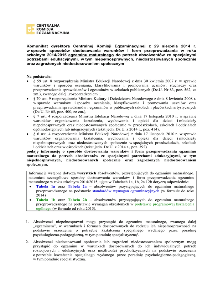 Komunikat dyrektora Centralnej Komisji Egzaminacyjnej z 29 sierpnia 2014 r. w sprawie sposobów dostosowania warunków i form przeprowadzania w roku szkolnym 2014/2015 egzaminu maturalnego do potrzeb absolwentów ze specjalnymi potrzebami edukacyjnymi, w tym niepełnosprawnych, niedostosowanych społecznie oraz zagrożonych niedostosowaniem społecznym Na podstawie: § 59 ust. 8 rozporządzenia Ministra Edukacji Narodowej z dnia 30 kwietnia 2007 r. w sprawie warunków i sposobu oceniania, klasyfikowania i promowania uczniów, słuchaczy oraz przeprowadzania sprawdzianów i egzaminów w szkołach publicznych (Dz.U. Nr 83, poz. 562, ze zm.), zwanego dalej „rozporządzeniem”, § 70 ust. 9 rozporządzenia Ministra Kultury i Dziedzictwa Narodowego z dnia 8 kwietnia 2008 r. w sprawie warunków i sposobu oceniania, klasyfikowania i promowania uczniów oraz przeprowadzania sprawdzianów i egzaminów w publicznych szkołach i placówkach artystycznych (Dz.U. Nr 65, poz. 400, ze zm.), § 7 ust. 4 rozporządzenia Ministra Edukacji Narodowej z dnia 17 listopada 2010 r. w sprawie warunków organizowania kształcenia, wychowania i opieki dla dzieci i młodzieży niepełnosprawnych oraz niedostosowanych społecznie w przedszkolach, szkołach i oddziałach ogólnodostępnych lub integracyjnych (tekst jedn. Dz.U. z 2014 r., poz. 414), § 6 ust. 4 rozporządzenia Ministra Edukacji Narodowej z dnia 17 listopada 2010 r. w sprawie warunków organizowania kształcenia, wychowania i opieki dla dzieci i młodzieży niepełnosprawnych oraz niedostosowanych społecznie w specjalnych przedszkolach, szkołach i oddziałach oraz w ośrodkach (tekst jedn. Dz.U. z 2014 r., poz. 392) podaję informację o sposobie dostosowania warunków i form przeprowadzania egzaminu maturalnego do potrzeb absolwentów ze specjalnymi potrzebami edukacyjnymi, w tym niepełnosprawnych, niedostosowanych społecznie oraz zagrożonych niedostosowaniem społecznym. Informacje wstępne dotyczą wszystkich absolwentów, przystępujących do egzaminu maturalnego, natomiast szczegółowe sposoby dostosowania warunków i form przeprowadzania egzaminu maturalnego w roku szkolnym 2014/2015, ujęte w Tabelach 1a, 1b, 2a i 2b dotyczą odpowiednio: Tabela 1a oraz Tabela 2a – absolwentów przystępujących do egzaminu maturalnego przeprowadzanego na podstawie standardów wymagań egzaminacyjnych (w formule do roku 2014) Tabela 1b oraz Tabela 2b – absolwentów przystępujących do egzaminu maturalnego przeprowadzanego na podstawie wymagań określonych w podstawie programowej kształcenia ogólnego (w formule od roku 2015). 1. Absolwenci niepełnosprawni mogą przystąpić do egzaminu maturalnego, zwanego dalej „egzaminem”, w warunkach i formach dostosowanych do rodzaju ich niepełnosprawności na podstawie orzeczenia o potrzebie kształcenia specjalnego wydanego przez poradnię psychologiczno-pedagogiczną, w tym poradnię specjalistyczną1. 2. Absolwenci niedostosowani społecznie lub zagrożeni niedostosowaniem społecznym mogą przystąpić do egzaminu w warunkach dostosowanych do ich indywidualnych potrzeb rozwojowych i edukacyjnych oraz możliwości psychofizycznych na podstawie orzeczenia o potrzebie kształcenia specjalnego wydanego przez poradnię psychologiczno-pedagogiczną, w tym poradnię specjalistyczną. 3. Absolwenci posiadający orzeczenie o potrzebie indywidualnego nauczania wydane przez poradnię psychologiczno-pedagogiczną, w tym poradnię specjalistyczną, mogą przystąpić do egzaminu w warunkach dostosowanych do ich indywidualnych potrzeb edukacyjnych i możliwości psychofizycznych na podstawie tego orzeczenia. 4. Absolwenci chorzy lub niesprawni czasowo mogą przystąpić do egzaminu w warunkach odpowiednich ze względu na ich stan zdrowia na podstawie zaświadczenia o stanie zdrowia wydanego przez lekarza. 5. Absolwenci ze specyficznymi trudnościami w uczeniu się, w tym: z dysleksją, dysgrafią, dysortografią, dyskalkulią, mają prawo przystąpić do egzaminu w warunkach dostosowanych do ich indywidualnych potrzeb edukacyjnych i możliwości psychofizycznych na podstawie opinii poradni psychologiczno-pedagogicznej, w tym poradni specjalistycznej. 6. Absolwenci, którzy w roku szkolnym 2014/2015 byli objęci pomocą psychologicznopedagogiczną w szkole ze względu na trudności adaptacyjne związane z wcześniejszym kształceniem za granicą, zaburzenia komunikacji językowej lub ze względu na sytuację kryzysową lub traumatyczną, mogą przystąpić do egzaminu w warunkach dostosowanych do ich indywidualnych potrzeb edukacyjnych i możliwości psychofizycznych, na podstawie pozytywnej opinii rady pedagogicznej wydanej zgodnie z trybem określonym w § 59 ust. 4 i 5 rozporządzenia. 7. Za dostosowanie warunków i form przeprowadzania egzaminu odpowiada dyrektor szkoły jako przewodniczący zespołu egzaminacyjnego w danej szkole. 8. Dyrektor szkoły dostosowuje odpowiednio warunki i formy przeprowadzania egzaminu na podstawie wskazań rady pedagogicznej po uzyskaniu stanowiska zdającego. 9. Rada pedagogiczna wskazuje sposób lub sposoby dostosowania warunków i form przeprowadzania egzaminu do potrzeb i możliwości uczniów, o których mowa w pkt 1–6, wybierając spośród możliwych sposobów dostosowania warunków i form przeprowadzania egzaminu określonych w Tabeli 1a oraz Tabeli 1b na podstawie: orzeczenia o potrzebie kształcenia specjalnego orzeczenia o potrzebie indywidualnego nauczania opinii poradni psychologiczno-pedagogicznej, w tym poradni specjalistycznej, o specyficznych trudnościach w uczeniu się 2 zaświadczenia o stanie zdrowia wydanego przez lekarza pozytywnej opinii rady pedagogicznej – wydanej na wniosek (a) nauczyciela lub (b) specjalisty wykonującego w szkole zadania z zakresu pomocy psychologiczno-pedagogicznej, prowadzących zajęcia z uczniem (słuchaczem) objętym pomocą psychologicznopedagogiczną ze względu na trudności adaptacyjne związane z wcześniejszym kształc