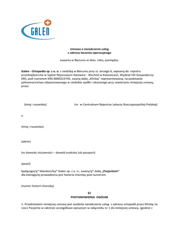 Umowa o świadczenie usług z zakresu leczenia operacyjnego zawarta w Bieruniu w dniu roku, pomiędzy: Galen - Ortopedia sp. z o. o. z siedzibą w Bieruniu przy ul. Jerzego 6, wpisaną do rejestru przedsiębiorców w Sądzie Rejonowym Katowice - Wschód w Katowicach, Wydział VIII Gospodarczy KRS, pod numerem KRS 0000223745, zwaną dalej „Kliniką” reprezentowaną, na podstawie pełnomocnictwa zdeponowanego w siedzibie spółki i okazanego przy zawieraniu niniejszej umowy, przez: (imię i nazwisko) (nr w Centralnym Rejestrze Lekarzy Rzeczypospolitej Polskiej) a (imię i nazwisko) (adres) (nr dowodu tożsamości – dowód osobisty lub paszport) (pesel) będącego/ą* klientem/ką* Galen sp. z o. o., zwany/ą* dalej „Pacjentem” dla którego/ej prowadzona jest historia choroby pod numerem (numer historii choroby) §1 POSTANOWIENIA OGÓLNE 1. Przedmiotem niniejszej umowy jest osobiste świadczenie usług z zakresu ortopedii przez Klinikę na rzecz Pacjenta w zakresie szczegółowo opisanym w załączniku nr 1 do niniejszej umowy, zgodnie z art. 32-35 ustawy z dnia 5 grudnia 1996r. o zawodach lekarza i dentysty z czym pacjent według złożonego oświadczenia zapoznał się i wyraża zgodę poprzez złożenie swego podpisu. 2. Miejscem świadczenia usług na rzecz Pacjenta są obiekty Galen Ortopedii sp. z o. o. 3. Za usługi określone w ust. 1, Pacjent zapłaci wynagrodzenie Galen Ortopedii sp. z o. o. w kwocie: zł słownie: złotych, na co składa się: 3.1 Pobyt w oddziale szpitalnym: wizyta kwalifikacyjna (anestezjologiczna), opieka: lekarska, anestezjologiczna, pielęgniarska, pobyt w oddziale na czas wykonania procedury medycznej. 3.2 Opieka ambulatoryjna: 1 wizyta kontrolna (usunięcie szwów). 4. Należność zostanie zapłacona w kasie kliniki lub na konto ING Bank Śląski (nr konta): 15 1050 1214 1000 0022 9350 3146 najpóźniej do dnia zabiegu/operacji. 5. W przypadku zaburzeń w przebiegu leczenia lub ewentualnymi powikłaniami istnieje możliwość kontaktu z lekarzem dyżurnym pod numerem telefonu: 887-705-070. §2 LEKARZ 1. . 2. W ramach świadczonych usług Lekarz uprawniony jest do przeprowadzenia konsultacji medycznych w zakresie chirurgii. 3. Lekarz zobowiązany jest do przeprowadzenia operacji i zabiegów, zgodnie ze wskazaniami medycznymi ustalonymi w wyniku przeprowadzonych przez siebie oraz przez anestezjologa konsultacjami. 4. Operacje, zabiegi, konsultacje będą przeprowadzane w pomieszczeniach obiektów Galen – Ortopedia sp. z o. o., zgodnie z harmonogramem ustalonym przez Lekarza. 5. Lekarz jest zobowiązany do świadczenia usług określonych w niniejszej umowie zgodnie z zasadami etyki zawodowej oraz z należytą starannością, wymaganą w związku z wykonywaniem zawodu lekarza. 6. Lekarz jest zobowiązany do prowadzenia indywidualnej dokumentacji medycznej Pacjenta, zgodnie z obowiązującymi przepisami. 7. Lekarz ma prawo do odwołania operacji/zabiegu lub jej przełożenia, może też zlecić wykonanie kontroli innemu specjaliście. §3 ZACHOWANIE TAJEMNICY Lekarz jest zobowiązany do zachowania w tajemnicy informacji o stanie zdrowia Pacjenta a także informacji uzyskanych podczas konsultacji, zabiegów, operacji. §4 PACJENT Pacjent oświadcza, że: 1. Nie jest /jest ubezpieczony* w Narodowym Funduszu Zdrowia oddział...................... 2. Będąc świadomy podjętej decyzji, wyraża zgodę na przeprowadzenie przez Klinikę operacji/ zabiegu określonego w § 1 ust. 1 niniejszej umowy. 3. Został w sposób wyczerpujący poinformowany przez lekarza o wskazaniach do operacji/zabiegu, jak i innych możliwościach i sposobach leczenia, jak również o zakresie i rodzaju operacji/zabiegu, przewidywanym wyniku, okresie leczenia i wszelkich możliwych powikłaniach miejscowych i ogólnych, jak i warunkach, w których operacja/zabieg będzie wykonywany. 4. Wyraża zgodę na zaproponowane znieczulenie ogólne / przewodowe / miejscowe*. Zgadza się na uzasadnione medyczne zmiany, rozszerzenie postępowania anestezjologicznego oraz zmianę rodzaju znieczulenia o ile zaszłaby taka konieczność. Jednocześnie oświadcza, że w pełni zrozumiał treść zaleceń przed i po znieczuleniu, a informacje przez niego podane w rozmowie oraz w załączniku nr 2 są zgodne z prawdą. 5. Wyraża/nie wyraża* zgody na przetoczenia krwi, o ile wystąpi taka konieczność. 6. Jest świadomy faktu, iż zatajenie powyższych informacji może być przyczyną powikłań. Podał wszystkie dane na temat przebytych operacji i chorób oraz leków aktualnie przyjmowanych. Wie, że w przypadku zatajenia powyższych informacji, przyjmuje na siebie ryzyko ewentualnych powikłań. 7. Został poinformowany o trybie sprawowania opieki pooperacyjnej i wyraża na to zgodę. W trakcie rozmowy z Lekarzem zadał wszystkie interesujące go pytania, na które uzyskał wyczerpujące, zrozumiałe dla niego odpowiedzi. 8. Będzie przestrzegać wszystkich zaleceń lekarskich. 9. Został poinformowany że nieodzowną częścią zabiegu/operacji jest rehabilitacja i że bez jej przeprowadzenia nie zostanie osiągnięty cel zabiegu/operacji. 10. Przyjął do wiadomości, że medycyna nie jest nauką ścisłą i w związku z tym mimo najlepszej wiedzy i chęci można nie osiągnąć zaplanowanego rezultatu. Mogą pojawić się także nieprzewidziane powikłania. W związku z tym wynik operacji/zabiegu nie może być gwarantowany i podczas wykonywania czynności mogą wystąpić okoliczności wymagające zmiany lub rozszerzenia wstępnie proponowanej operacji/zabiegu , na co wyraża zgodę, jeśli kwota o którą wzrośnie koszt zabiegu nie przekroczy.................................złotych……......................................................................... .(słownie), by nie było konieczności przerywania i ponownego powtarzania zabiegu/operacji w celu uzyskania jego zgody. 11. Zgadza się na przeniesienie go do właściwego oddziału stacjonarnego zgodnie z decyzją lekarza operu