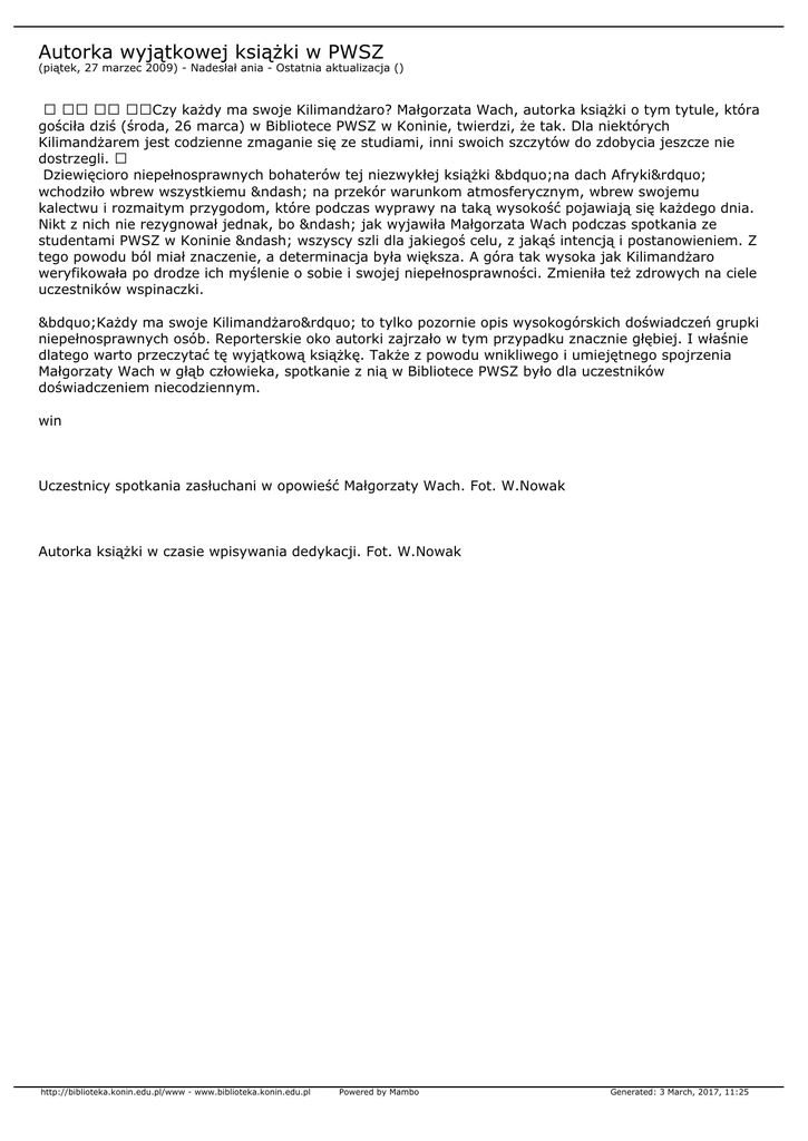 Autorka wyjątkowej książki w PWSZ (piątek, 27 marzec 2009) - Nadesłał ania - Ostatnia aktualizacja () Czy każdy ma swoje Kilimandżaro? Małgorzata Wach, autorka książki o tym tytule, która gościła dziś (środa, 26 marca) w Bibliotece PWSZ w Koninie, twierdzi, że tak. Dla niektórych Kilimandżarem jest codzienne zmaganie się ze studiami, inni swoich szczytów do zdobycia jeszcze nie dostrzegli. Dziewięcioro niepełnosprawnych bohaterów tej niezwykłej książki „na dach Afryki” wchodziło wbrew wszystkiemu – na przekór warunkom atmosferycznym, wbrew swojemu kalectwu i rozmaitym przygodom, które podczas wyprawy na taką wysokość pojawiają się każdego dnia. Nikt z nich nie rezygnował jednak, bo – jak wyjawiła Małgorzata Wach podczas spotkania ze studentami PWSZ w Koninie – wszyscy szli dla jakiegoś celu, z jakąś intencją i postanowieniem. Z tego powodu ból miał znaczenie, a determinacja była większa. A góra tak wysoka jak Kilimandżaro weryfikowała po drodze ich myślenie o sobie i swojej niepełnosprawności. Zmieniła też zdrowych na ciele uczestników wspinaczki. „Każdy ma swoje Kilimandżaro” to tylko pozornie opis wysokogórskich doświadczeń grupki niepełnosprawnych osób. Reporterskie oko autorki zajrzało w tym przypadku znacznie głębiej. I właśnie dlatego warto przeczytać tę wyjątkową książkę. Także z powodu wnikliwego i umiejętnego spojrzenia Małgorzaty Wach w głąb człowieka, spotkanie z nią w Bibliotece PWSZ było dla uczestników doświadczeniem niecodziennym. win Uczestnicy spotkania zasłuchani w opowieść Małgorzaty Wach. Fot. W.Nowak Autorka książki w czasie wpisywania dedykacji. Fot. W.Nowak http://biblioteka.konin.edu.pl/www - www.biblioteka.konin.edu.pl Powered by Mambo Generated: 3 March, 2017, 11:25
