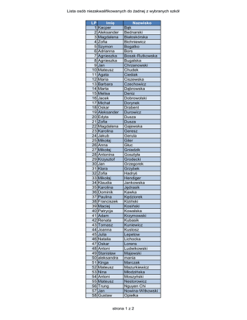 Lista osób niezakwalifikowanych do żadnej z wybranych szkół LP 1 2 3 4 5 6 7 8 9 10 11 12 13 14 15 16 17 18 19 20 21 22 23 24 25 26 27 28 29 30 31 32 33 34 35 36 37 38 39 40 41 42 43 44 45 46 47 48 49 50 51 52 53 54 55 56 57 58 Imię Kacper Aleksander Magdalena Zofia Szymon Adrianna Agnieszka Agnieszka Jan Mateusz Agata Maria Barbara Marta Melisa Jacek Michał Oskar Aleksander Edyta Zofia Magdalena Karolina Jakub Mikołaj Anna Mikołaj Antonina Krzysztof Jan Klara Zofia Mikołaj Klaudia Karolina Dominik Paulina Franciszek Maciej Patrycja Adam Renata Tomasz Joanna Julia Natalia Oskar Antoni Stanisław aleksandra Kinga Mateusz Nina Antoni Mateusz Trung Jan Gustaw Nazwisko Bąk Bednarski Białoskórska Bichniewicz Bogatko Bors Bosak-Rutkowska Bugalska Chrzanowski Chudek Cieślak Ciszewska Czechowicz Dąbrowska Deniz Dobrowolski Dorynek Drabent Durowicz Dusza Dusza Gajewska Geresz Gerula Giler Głuc Gniadzik Gosztyła Grodecki Grzegorek Grzybek Hadryś Hendiger Jankowska Jędrasik Kawka Kędziorek Kiziński Kosiński Kowalska Krzymowski Kubasik Kuniewicz Kustosz Lepetow Lichocka Lorens Ludwikowski Majewski mania Marczak Mazurkiewicz Młodzińska Moszyński Nestorowicz Nguyen Chi Nowina-Witkowski Opiełka strona 1 z 2 Lista osób niezakwalifikowanych do żadnej z wybranych szkół LP 59 60 61 62 63 64 65 66 67 68 69 70 71 72 73 74 75 76 77 78 79 80 81 82 83 84 85 86 87 88 89 90 91 92 93 94 95 96 97 98 99 100 101 102 103 104 Imię Magdalena Olga Michał Aleksandra Klaudia Julia Łukasz Małgorzata Jakub Katarzyna Ignacy Jan Piotr Joanna Łukasz Grzegorz Michał Katarina Sebastian Ewa Szymon Patrycja Karol Michalina Karolina Weronika Kinga Weronika Zofia Maksymilian Paulina Michał Kamil Aleksandra Antonina Michał Julia Weronika Aleksandra Jakub Anita Mateusz Piotr Julia Małgorzata Kacper Nazwisko Orłowska Pajowska Panasiuk Pardo Pawłowska Piniewicz Piwko Popek Prochorec Rogulska Roliński Romanowski Rudniak Rurka Rzeczkowski Sentkowski Sękowski Šimeková Sitek Skowrońska Socha Sołtysiak Stanisz Starzyńska Strzyga Suszyńska Syta Szewczyk Szlachcikowska Świderski Tarsalewska Teodorczyk Tyborowski Tyczyńska Wagiel Wasilewski Węcławik Węgrzyn Witkowska Wojciechowski Wolska Wrzesiński Zadura Zatorska Zawadzka Zdzieborski strona 2 z 2