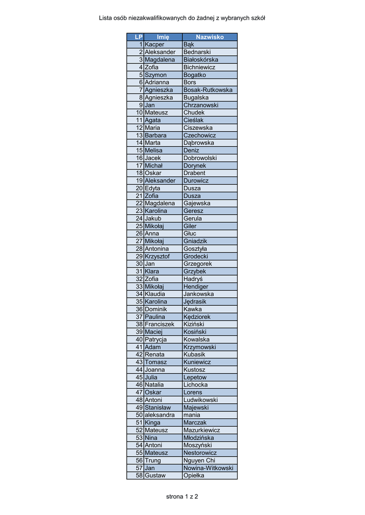 Kandydaci nie zakwalifikowani do żadnej z wybranych szkół
