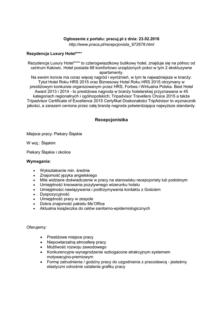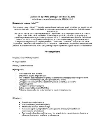 Ogłoszenie z portalu: pracuj.pl z dnia: 23.02.2016 http://www.praca.pl/recepcjonista_972678.html Rezydencja Luxury Hotel**** Rezydencja Luxury Hotel**** to czterogwiazdkowy butikowy hotel, znajduje się na północ od centrum Katowic. Hotel posiada 68 komfortowo urządzonych pokoi w tym 2 ekskluzywne apartamenty. Na swoim koncie ma coraz więcej nagród i wyróżnień, w tym te najważniejsze w branży: Tytuł Hotel Roku HRS 2015 oraz Biznesowy Hotel Roku HRS 2015 otrzymany w prestiżowym konkursie organizowanym przez HRS, Forbes i Wirtualna Polska. Best Hotel Award 2013 i 2014 - to prestiżowa nagroda w branży hotelarskiej przyznawana w 45 kategoriach regionalnych i ogólnopolskich; Tripadvisor Travellers Choice 2015 a także Tripadvisor Certificate of Excellence 2015 Certyfikat Doskonałości TripAdvisor to wyznacznik jakości, a zarazem ceniona przez całą branżę nagroda potwierdzająca najwyższe standardy. Recepcjonistka Miejsce pracy: Piekary Śląskie W woj.: Śląskim Piekary Śląskie i okolice Wymagania: Wykształcenie min. średnie Znajomość języka angielskiego Mile widziane doświadczenie w pracy na stanowisku recepcjonisty lub podobnym Umiejętność kreowania pozytywnego wizerunku hotelu Umiejętności nawiązywania i podtrzymywania kontaktu z Gościem Dyspozycyjność Umiejętność pracy w zespole Dobra znajomość pakietu Ms’Office Aktualna książeczka do celów sanitarno-epidemiologicznych Oferujemy: Prestiżowe miejsce pracy Niepowtarzalną atmosferę pracy Możliwość rozwoju zawodowego Konkurencyjne wynagrodzenie wzbogacone atrakcyjnym systemem motywacyjno-premiowym Formę zatrudnienia / godziny pracy do uzgodnienia z pracodawcą - jesteśmy elastyczni odnośnie ustalania grafiku pracy Prosimy o dołączenie zgody na przetwarzanie danych osobowych przez Rezydencja Luxury Hotel**** celu przeprowadzenia procesu rekrutacji. Uprzejmie informujemy, że skontaktujemy się tylko z wybranymi osobami. Aplikuj na stronie: https://www.praca.pl/aplikuj_recepcjonista_972678.html