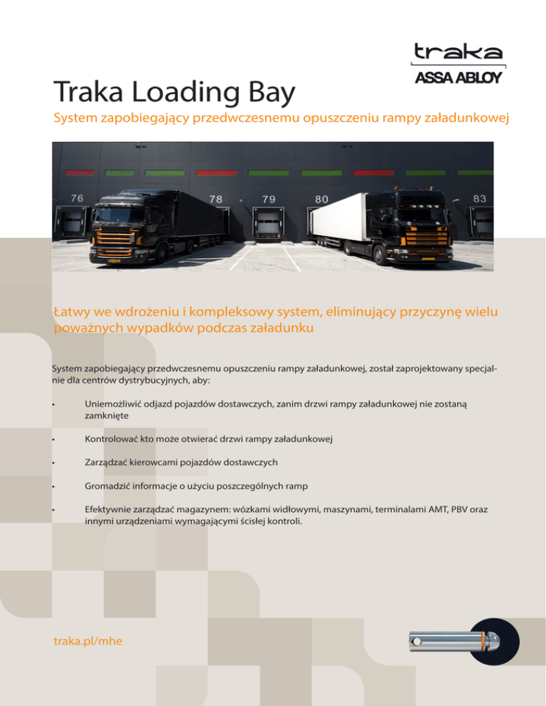 Traka Loading Bay System zapobiegający przedwczesnemu opuszczeniu rampy załadunkowej Łatwy we wdrożeniu i kompleksowy system, eliminujący przyczynę wielu poważnych wypadków podczas załadunku System zapobiegający przedwczesnemu opuszczeniu rampy załadunkowej, został zaprojektowany specjalnie dla centrów dystrybucyjnych, aby: • Uniemożliwić odjazd pojazdów dostawczych, zanim drzwi rampy załadunkowej nie zostaną zamknięte • Kontrolować kto może otwierać drzwi rampy załadunkowej • Zarządzać kierowcami pojazdów dostawczych • Gromadzić informacje o użyciu poszczególnych ramp • Efektywnie zarządzać magazynem: wózkami widłowymi, maszynami, terminalami AMT, PBV oraz innymi urządzeniami wymagającymi ścisłej kontroli. traka.pl/mhe System zapobiegający przedwczesnemu opuszczeniu rampy Elementy systemu Rozwiązanie składa się z dwóch po wcześniejszej identyfikacji kodem PIN lub Otwarcie drzwi może nastąpić tylko kartą, pobrać dowolne klucze z depozytora. i wyłącznie po zakończeniu całej procedury, oraz tylko poprzez iFoba z połączonych ze sobą elementów: Mechanizm otwierający drzwi rampy • • odpowiednimi do tego uprawnieniami. Depozytor kluczy Traka, wraz z załadunkowej zadziała tylko wtedy, kiedy iFobami iFob z kluczami kierowcy będzie włożony Po zakończeniu rozładunku, drzwi Drzwi rampy załadunkowej oraz w odpowiednie gniazdo a sparowany z mogą zostać zamknięte, po czym powiązane urządzenia sterujące nim drugi iFob zostanie wydany kierowcy. odpowiedni sygnał w depozytorze w Bezpieczne zaparkowanie pojazdu trans- biurze sygnalizuje możliwość pobra- Wszystkie drzwi ramp załadunkowych portowego, zostaje zasygnalizowane nia kluczy kierowcy - oczywiście po są połączone kaskadowo z depozy- włączeniem zielonej diody LED przy uprzednim zwróceniu “potwierdzenia” torem kluczy Traka, pozwalając na mechaniźmie drzwi. Drzwi mogą zostać przez kierowcę. inteligentną kontrolę dostępu. otwarte. System minimalizuje wszelkie Rozwiązanie może być łatwo dopa- niejasności oraz element błędu ludz- sowane do istniejącej infrastruktury, kiego. jak również zaistalowane w nowo Jakie są zalety? powstałych obiektach. • Zapewnienie, że kierowca nie opuści rampy załadunkowej przed zakończeniem załadunku Jak to działa? Kierowca przyjeżdżający do magazynu parkuje przed rampą załadunkową, po Otwarcie drzwi wymaga włożenia czym kieruje się do biura. Jego klucze do gniazda iFoba z odpowiednimi zostają zabrane oraz tymczasowo uprawnieniami. przymocowane do iFoba, który zostaje umieszczony w depozytorze, Zaletą korzystania z autoryzowanego iFoba w gnieździe odpowiadającym numer- w celu otwarcia drzwi rampy załadunkowej owi rampy załadunkowej. jest to, że rejestruje on cały proces (podobnie jak w przypadku zarządzania wóz- Po włożeniu iFoba, depozytor odblo- kami widłowymi) zachowując informacje kowuje sparowany z nim egzemplarz, dotyczące otwarcia drzwi i powiązanych który zostaje przekazany kierowcy. użytkowników. Informacje te są przeka- Zostaje on w jego posiadaniu pełniąc zywane do bazy danych po uprzednim rolę “potwierdzenia”, bez którego nie sczytaniu ich z pomocą stacji downloadu. jest w stanie odebrać swoich kluczy. Zamknięcie drzwi nie wymaga autoryzacji iFobem. Kiedy klucze samochodowe pozostają • Określenie użytkowników mających prawo otworzyć drzwi • Zwiększenie poziomu bezpieczeństwa • Redukcja strat magazynowych • Minimalizacja błędu ludzkiego • Zintegrowany system zarządzania • Kontrola nad drzwiami ramp łącznie z rejestracją ilości użyć • Planowanie serwisów i napraw na swoim miejscu, tylko uprawniona do tego osoba np. menadżer, może Techniserv Sp. z o.o. (autoryzowany dystrybutor Traka) Boya-Żeleńskiego 6/8, 42-217 Częstochowa Polska An ASSA ABLOY Group brand