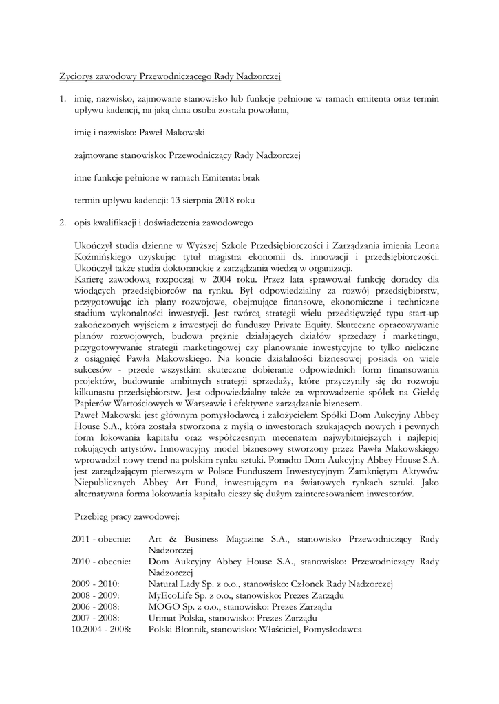 Życiorys zawodowy Przewodniczącego Rady Nadzorczej 1. imię, nazwisko, zajmowane stanowisko lub funkcje pełnione w ramach emitenta oraz termin upływu kadencji, na jaką dana osoba została powołana, imię i nazwisko: Paweł Makowski zajmowane stanowisko: Przewodniczący Rady Nadzorczej inne funkcje pełnione w ramach Emitenta: brak termin upływu kadencji: 13 sierpnia 2018 roku 2. opis kwalifikacji i doświadczenia zawodowego Ukończył studia dzienne w Wyższej Szkole Przedsiębiorczości i Zarządzania imienia Leona Koźmińskiego uzyskując tytuł magistra ekonomii ds. innowacji i przedsiębiorczości. Ukończył także studia doktoranckie z zarządzania wiedzą w organizacji. Karierę zawodową rozpoczął w 2004 roku. Przez lata sprawował funkcję doradcy dla wiodących przedsiębiorców na rynku. Był odpowiedzialny za rozwój przedsiębiorstw, przygotowując ich plany rozwojowe, obejmujące finansowe, ekonomiczne i techniczne stadium wykonalności inwestycji. Jest twórcą strategii wielu przedsięwzięć typu start-up zakończonych wyjściem z inwestycji do funduszy Private Equity. Skuteczne opracowywanie planów rozwojowych, budowa prężnie działających działów sprzedaży i marketingu, przygotowywanie strategii marketingowej czy planowanie inwestycyjne to tylko nieliczne z osiągnięć Pawła Makowskiego. Na koncie działalności biznesowej posiada on wiele sukcesów - przede wszystkim skuteczne dobieranie odpowiednich form finansowania projektów, budowanie ambitnych strategii sprzedaży, które przyczyniły się do rozwoju kilkunastu przedsiębiorstw. Jest odpowiedzialny także za wprowadzenie spółek na Giełdę Papierów Wartościowych w Warszawie i efektywne zarządzanie biznesem. Paweł Makowski jest głównym pomysłodawcą i założycielem Spółki Dom Aukcyjny Abbey House S.A., która została stworzona z myślą o inwestorach szukających nowych i pewnych form lokowania kapitału oraz współczesnym mecenatem najwybitniejszych i najlepiej rokujących artystów. Innowacyjny model biznesowy stworzony przez Pawła Makowskiego wprowadził nowy trend na polskim rynku sztuki. Ponadto Dom Aukcyjny Abbey House S.A. jest zarządzającym pierwszym w Polsce Funduszem Inwestycyjnym Zamkniętym Aktywów Niepublicznych Abbey Art Fund, inwestującym na światowych rynkach sztuki. Jako alternatywna forma lokowania kapitału cieszy się dużym zainteresowaniem inwestorów. Przebieg pracy zawodowej: 2011 - obecnie: 2010 - obecnie: 2009 - 2010: 2008 - 2009: 2006 - 2008: 2007 - 2008: 10.2004 - 2008: Art & Business Magazine S.A., stanowisko Przewodniczący Rady Nadzorczej Dom Aukcyjny Abbey House S.A., stanowisko: Przewodniczący Rady Nadzorczej Natural Lady Sp. z o.o., stanowisko: Członek Rady Nadzorczej MyEcoLife Sp. z o.o., stanowisko: Prezes Zarządu MOGO Sp. z o.o., stanowisko: Prezes Zarządu Urimat Polska, stanowisko: Prezes Zarządu Polski Błonnik, stanowisko: Właściciel, Pomysłodawca 10.2004 - obecnie: SEKWENCJA Mariusz Gajowiak, stanowisko: Konsultant 01.2003-09.2004: Makowski International, stanowisko: Kierownik Projektu 3. wskazanie działalności wykonywanej przez daną osobę poza emitentem, gdy działalność ta ma istotne znaczenie dla emitenta Pan Paweł Makowski nie prowadzi działalności mającej istotne znaczenie dla Emitenta. 4. wskazanie wszystkich spółek prawa handlowego, w których, w okresie co najmniej ostatnich trzech lat, dana osoba była członkiem organów zarządzających lub nadzorczych albo wspólnikiem, ze wskazaniem, czy dana osoba nadal pełni funkcje w organach lub jest nadal wspólnikiem, nazwa spółki: Art & Business Magazine S.A. funkcja: Przewodniczący Rady Nadzorczej nazwa spółki: Natural Lady sp. z o.o. funkcja: Członek Rady Nadzorczej 5. informacje na temat prawomocnych wyroków, na mocy których dana osoba została skazana za przestępstwa oszustwa w okresie co najmniej ostatnich pięciu lat oraz wskazanie, czy w okresie co najmniej ostatnich pięciu lat osoba taka otrzymała sądowy zakaz działania jako członek organów zarządzających lub nadzorczych w spółkach prawa handlowego W okresie ostatnich pięciu lat Pan Paweł Makowski nie został skazany za przestępstwo oszustwa. W okresie ostatnich pięciu lat Pan Paweł Makowski nie otrzymał sądowego zakazu działania jako członek organów zarządzających lub nadzorczych w spółkach prawa handlowego. 6. szczegóły wszystkich przypadków upadłości, zarządu komisarycznego lub likwidacji, w okresie co najmniej ostatnich pięciu lat, w odniesieniu do podmiotów, w których dana osoba pełniła funkcje członka organu zarządzającego lub nadzorczego W okresie ostatnich pięciu lat nie miała miejsce upadłość, zarząd komisaryczny lub likwidacja podmiotu, w którym Pan Paweł Makowski pełnił funkcje członka organu zarządzającego lub nadzorczego. 7. informacje, czy dana osoba prowadzi działalność, która jest konkurencyjna w stosunku do działalności emitenta, oraz czy jest wspólnikiem konkurencyjnej spółki cywilnej lub osobowej albo członkiem organu spółki kapitałowej lub członkiem organu jakiejkolwiek konkurencyjnej osoby prawnej, Pan Paweł Makowski nie prowadzi konkurencyjnej działalności w stosunku do działalności Emitenta, ani nie jest wspólnikiem konkurencyjnej spółki cywilnej lub osobowej albo członkiem organu spółki kapitałowej lub członkiem organu jakiejkolwiek konkurencyjnej osoby prawnej. 8. informacje, czy dana osoba figuruje w rejestrze dłużników niewypłacalnych, prowadzonym na podstawie ustawy z dnia 20 sierpnia 1997 r. o Krajowym Rejestrze Sądowym; Pan Paweł Makowski nie figuruje w rejestrze dłużników niewypłacalnych prowadzonym na podstawie ustawy z dnia 20 sierpnia 1997 r. o Krajowym Rejestrze Sądowym. Podstawa prawna: § 3 ust. 2 pkt. 11) Załącznika nr 3 Regulaminu Alternatywnego Systemu Obrotu "Informacje bieżące i okresowe przekazywane w alternatywnym systemie obrotu na rynku NewConnect".