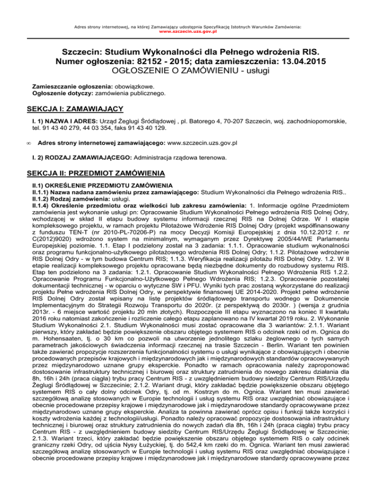 Adres strony internetowej, na której Zamawiający udostępnia Specyfikację Istotnych Warunków Zamówienia: www.szczecin.uzs.gov.pl Szczecin: Studium Wykonalności dla Pełnego wdrożenia RIS. Numer ogłoszenia: 82152 - 2015; data zamieszczenia: 13.04.2015 OGŁOSZENIE O ZAMÓWIENIU - usługi Zamieszczanie ogłoszenia: obowiązkowe. Ogłoszenie dotyczy: zamówienia publicznego. SEKCJA I: ZAMAWIAJĄCY I. 1) NAZWA I ADRES: Urząd Żeglugi Śródlądowej , pl. Batorego 4, 70-207 Szczecin, woj. zachodniopomorskie, tel. 91 43 40 279, 44 03 354, faks 91 43 40 129. • Adres strony internetowej zamawiającego: www.szczecin.uzs.gov.pl I. 2) RODZAJ ZAMAWIAJĄCEGO: Administracja rządowa terenowa. SEKCJA II: PRZEDMIOT ZAMÓWIENIA II.1) OKREŚLENIE PRZEDMIOTU ZAMÓWIENIA II.1.1) Nazwa nadana zamówieniu przez zamawiającego: Studium Wykonalności dla Pełnego wdrożenia RIS.. II.1.2) Rodzaj zamówienia: usługi. II.1.4) Określenie przedmiotu oraz wielkości lub zakresu zamówienia: 1. Informacje ogólne Przedmiotem zamówienia jest wykonanie usługi pn: Opracowanie Studium Wykonalności Pełnego wdrożenia RIS Dolnej Odry, wchodzącej w skład II etapu budowy systemu informacji rzecznej RIS na Dolnej Odrze. W I etapie kompleksowego projektu, w ramach projektu Pilotażowe Wdrożenie RIS Dolnej Odry (projekt współfinansowany z funduszu TEN-T (nr 2010-PL-70206-P) na mocy Decyzji Komisji Europejskiej z dnia 10.12.2012 r. nr C(2012)9020) wdrożono system na minimalnym, wymaganym przez Dyrektywę 2005/44/WE Parlamentu Europejskiej poziomie. 1.1. Etap I podzielony został na 3 zadania: 1.1.1. Opracowanie studium wykonalności oraz programu funkcjonalno-użytkowego pilotażowego wdrożenia RIS Dolnej Odry; 1.1.2. Pilotażowe wdrożenie RIS Dolnej Odry - w tym budowa Centrum RIS; 1.1.3. Weryfikacja realizacji pilotażu RIS Dolnej Odry. 1.2. W II etapie realizacji kompleksowego projektu opracowane będą niezbędne dokumenty do rozbudowy systemu RIS. Etap ten podzielono na 3 zadania: 1.2.1. Opracowanie Studium Wykonalności Pełnego Wdrożenia RIS 1.2.2. Opracowanie Programu Funkcjonalno-Użytkowego Pełnego Wdrożenia RIS; 1.2.3. Opracowanie pozostałej dokumentacji technicznej - w oparciu o wytyczne SW i PFU. Wyniki tych prac zostaną wykorzystane do realizacji projektu Pełne wdrożenia RIS Dolnej Odry, w perspektywie finansowej UE 2014-2020. Projekt pełne wdrożenie RIS Dolnej Odry został wpisany na listę projektów śródlądowego transportu wodnego w Dokumencie Implementacyjnym do Strategii Rozwoju Transportu do 2020r. (z perspektywą do 2030r. ) (wersja z grudnia 2013r. - 6 miejsce wartość projektu 20 mln złotych). Rozpoczęcie III etapu wyznaczono na koniec II kwartału 2016 roku natomiast zakończenie i rozliczenie całego etapu zaplanowano na IV kwartał 2019 roku. 2. Wykonanie Studium Wykonalności 2.1. Studium Wykonalności musi zostać opracowane dla 3 wariantów: 2.1.1. Wariant pierwszy, który zakładać będzie powiększenie obszaru objętego systemem RIS o odcinek rzeki od m. Ognica do m. Hohensaaten, tj. o 30 km co pozwoli na utworzenie jednolitego szlaku żeglownego o tych samych parametrach jakościowych świadczenia informacji rzecznej na trasie Szczecin - Berlin. Wariant ten powinien także zawierać propozycje rozszerzenia funkcjonalności systemu o usługi wynikające z obowiązujących i obecnie procedowanych przepisów krajowych i międzynarodowych jak i międzynarodowych standardów opracowywanych przez międzynarodowo uznane grupy eksperckie. Ponadto w ramach opracowania należy zaproponować dostosowanie infrastruktury technicznej i biurowej oraz struktury zatrudnienia do nowego zakresu działania dla 8h, 16h i 24h (praca ciągła) trybu pracy Centrum RIS - z uwzględnieniem budowy siedziby Centrum RIS/Urzędu Żeglugi Śródlądowej w Szczecinie; 2.1.2. Wariant drugi, który zakładać będzie powiększenie obszaru objętego systemem RIS o cały dolny odcinek Odry, tj. od m. Kostrzyn do m. Ognica. Wariant ten musi zawierać szczegółową analizę stosowanych w Europie technologii i usług systemu RIS oraz uwzględniać obowiązujące i obecnie procedowane przepisy krajowe i międzynarodowe jak i międzynarodowe standardy opracowywane przez międzynarodowo uznane grupy eksperckie. Analiza ta powinna zawierać oprócz opisu i funkcji także korzyści i koszty wdrożenia każdej z technologii/usługi. Ponadto należy opracować propozycje dostosowania infrastruktury technicznej i biurowej oraz struktury zatrudnienia do nowych zadań dla 8h, 16h i 24h (praca ciągła) trybu pracy Centrum RIS - z uwzględnieniem budowy siedziby Centrum RIS/Urzędu Żeglugi Śródlądowej w Szczecinie; 2.1.3. Wariant trzeci, który zakładać będzie powiększenie obszaru objętego systemem RIS o cały odcinek graniczny rzeki Odry, od ujścia Nysy Łużyckiej, tj. do 542,4 km rzeki do m. Ognica. Wariant ten musi zawierać szczegółową analizę stosowanych w Europie technologii i usług systemu RIS oraz uwzględniać obowiązujące i obecnie procedowane przepisy krajowe i międzynarodowe jak i międzynarodowe standardy opracowywane przez międzynarodowo uznane grupy eksperckie. Analiza ta powinna zawierać oprócz opisu i funkcji zawierać także korzyści i koszty wdrożenia każdej z technologii/usługi oraz propozycje dostosowania infrastruktury technicznej i biurowej (w tym budowę nowej siedziby Centrum RIS) oraz struktury zatrudnienia do nowych zadań dla 8h, 16h i 24h (praca ciągła) trybu pracy Centrum RIS - z uwzględnieniem budowy siedziby Centrum RIS/Urzędu Żeglugi Śródlądowej w Szczecinie. 2.2. Realizacja przedmiotu zamówienia będzie wymagać przeprowadzenia procesu inwentaryzacji i oceny istniejącego stanu infrastruktury i innych uwarunkowań na badanym obszarze istotnych z punktu realizacji projektu. Inwentaryzacja powinna obejmować między innymi: 2.2.1. Analizę wyników pilotażowego wdrożenia RIS Dolnej Odry oraz innych projektów zrealizowanych lub w trakcie r