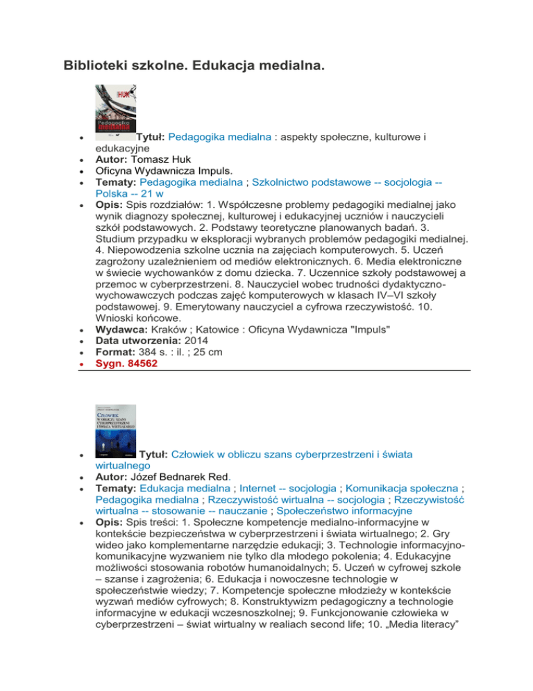 Biblioteki szkolne. Edukacja medialna. Tytuł: Pedagogika medialna : aspekty społeczne, kulturowe i edukacyjne Autor: Tomasz Huk Oficyna Wydawnicza Impuls. Tematy: Pedagogika medialna ; Szkolnictwo podstawowe -- socjologia -Polska -- 21 w Opis: Spis rozdziałów: 1. Współczesne problemy pedagogiki medialnej jako wynik diagnozy społecznej, kulturowej i edukacyjnej uczniów i nauczycieli szkół podstawowych. 2. Podstawy teoretyczne planowanych badań. 3. Studium przypadku w eksploracji wybranych problemów pedagogiki medialnej. 4. Niepowodzenia szkolne ucznia na zajęciach komputerowych. 5. Uczeń zagrożony uzależnieniem od mediów elektronicznych. 6. Media elektroniczne w świecie wychowanków z domu dziecka. 7. Uczennice szkoły podstawowej a przemoc w cyberprzestrzeni. 8. Nauczyciel wobec trudności dydaktycznowychowawczych podczas zajęć komputerowych w klasach IV–VI szkoły podstawowej. 9. Emerytowany nauczyciel a cyfrowa rzeczywistość. 10. Wnioski końcowe. Wydawca: Kraków ; Katowice : Oficyna Wydawnicza "Impuls" Data utworzenia: 2014 Format: 384 s. : il. ; 25 cm Sygn. 84562 Tytuł: Człowiek w obliczu szans cyberprzestrzeni i świata wirtualnego Autor: Józef Bednarek Red. Tematy: Edukacja medialna ; Internet -- socjologia ; Komunikacja społeczna ; Pedagogika medialna ; Rzeczywistość wirtualna -- socjologia ; Rzeczywistość wirtualna -- stosowanie -- nauczanie ; Społeczeństwo informacyjne Opis: Spis treści: 1. Społeczne kompetencje medialno-informacyjne w kontekście bezpieczeństwa w cyberprzestrzeni i świata wirtualnego; 2. Gry wideo jako komplementarne narzędzie edukacji; 3. Technologie informacyjnokomunikacyjne wyzwaniem nie tylko dla młodego pokolenia; 4. Edukacyjne możliwości stosowania robotów humanoidalnych; 5. Uczeń w cyfrowej szkole – szanse i zagrożenia; 6. Edukacja i nowoczesne technologie w społeczeństwie wiedzy; 7. Kompetencje społeczne młodzieży w kontekście wyzwań mediów cyfrowych; 8. Konstruktywizm pedagogiczny a technologie informacyjne w edukacji wczesnoszkolnej; 9. Funkcjonowanie człowieka w cyberprzestrzeni – świat wirtualny w realiach second life; 10. „Media literacy” jako odpowiedź na zagrożenia związane ze światem mediów; 11. Nowy wymiar piśmienności wizualnej generacji Digital Natives. Wyzwania edukacyjne; 12. Komunikacja społeczna w świecie realnym, w cyberprzestrzeni oraz w rzeczywistości wirtualnej. Tytuły pokrewne: Serie: Engram Wydawca: Warszawa : Difin Data utworzenia: 2014 Format: 223 s. : il. ; 23 cm Sygn. 84522 Tytuł: Zagrożenia cyberprzestrzeni i świata wirtualnego Autor: Józef Bednarek Red. ; Anna Andrzejewska (pedagogika). Red. Tematy: Cyberprzemoc ; Handel ludźmi ; Internet -- użytkowanie ; Pedagogika medialna ; Rzeczywistość wirtualna -- socjologia ; Społeczeństwo informacyjne Opis: Spis treści: Wprowadzenie. 1. Nowe kompetencje nauczycieli w zakresie możliwości i niebezpieczeństw cyberprzestrzeni. (Anna Andrzejewska) Wstęp. 1.1. Nowa rola nauczyciela w zmieniającej się rzeczywistości informatycznej. 1.2. Cyberprzestrzeń wyzwaniem dla współczesnego pedagoga. 1.3. Nowe kompetencje nauczyciela w obliczu rozwoju cyberprzestrzeni. Wnioski. 2. Nowe obszary zagrożenia niepełnosprawnością i wykluczeniem osób 45+ w społeczeństwie wiedzy (Jakub Jerzy Czarkowski) Wstęp. 2.1. Coraz nowsze technologie, coraz starsze społeczeństwo. 2.2. Wiedza w gospodarce i społeczeństwie wiedzy. 2.3. Nowe obszary zagrożenia wykluczeniem. 2.4. Szanse, jakie tworzy nowa technologia. 2.5. Propozycja komplementarna. 2.6. Czy pozostaniemy sobą? Wnioski. 3. Współczesne uwarunkowania handlu ludźmi (Marek Cendrowski) Wstęp. 3.1. Początki handlu ludźmi. 3.2. Prawo a handel ludźmi. 3.3. Ściganie handlu ludźmi w Polsce. 3.4. Nowe oblicza handlu ludźmi. 3.5. Handel ludźmi w Polsce. Wybrane statystyki. 3.6. Handel ludźmi a Internet. 3.7. Handel ludźmi jako obszar przestępstw okołoegzystencjalnych. Wnioski. 4. Ciemna strona sieci – zagrożenia internetowe oraz ich konsekwencje dla uczniów (Anna Wrona) Wstęp. 4.1. Istota zjawiska zagrożeń internetowych. 4.2. Przemoc w Internecie – zjawisko i przeciwdziałanie. 4.3. Pornografia internetowa zagrożeniem dla uczniów. 4.4. Seksting – upublicznianie nagich zdjęć. 4.5. Bezpieczeństwo w Internecie. Wnioski. Bibliografia. Spis treści cd.: 5. „Kop” i „odlot” w wirtualnym świecie (Jarosław Korczak) Wstęp. 5.1. Charakter informacji na stronach WWW. 5.2. Leki a narkotyki. 5.3. Leki działające pobudzająco wykorzystywane jako legalna alternatywa dla amfetaminy i kokainy. 5.4. Leki na kaszel o działaniu otępiającohalucynogennym wykorzystywane jako legalna alternatywa dla takich narkotyków, jak heroina, PCP czy LSD. 5.5. Przykłady najpopularniejszych leków na kaszel o działaniu dysocjano-euforyzującym, zawierających DXM. 5.6. Leki, narkotyki a Internet. Wnioski. 6. Prawne aspekty cyberprzestępczości (Krzysztof Zimny) Wstęp. 6.1. Cyberprzestępczość w Internecie. 6.2. Cyberprzestępczość według Interpolu. 6.3. Cyberprzestępczość według Rady Europy. 6.4. Definicja cyberprzestępczości wg Unii Europejskiej. 6.5. Definicja cyberprzestępczości w polskim prawodawstwie. 6.6. Charakterystyka wybranych przestępstw i metod działania sprawców. 6.7. Cyberprzestępczość w statystykach polskich. 6.8. Ochrona prawna przed cyberprzestępczością w Polsce. Wnioski. 7. Wolność słowa w świecie wirtualnym – wartość nadużywana (Dorota Marczuk, Kinga Kucała) Wstęp. 7.1. Obszary świata wirtualnego. 7.2. Wolność słowa jako wartość. 7.3. Internet i social media. 7.4. Postawa krytyczna wobec informacji zawartych w mediach. Wnioski. 8. Bezpieczeństwo człowieka w społeczeństwie nadzorowanym (Piotr Krawczyk) Wstęp. 8.1. Społeczeństwo nadzorowane jako nieuchronna konsekwencja zmiany społecznej. 8.2. Technologie w służbie kontroli. 8.3. Zagrożenia dla prywatności w perspektywie pedagogiczne