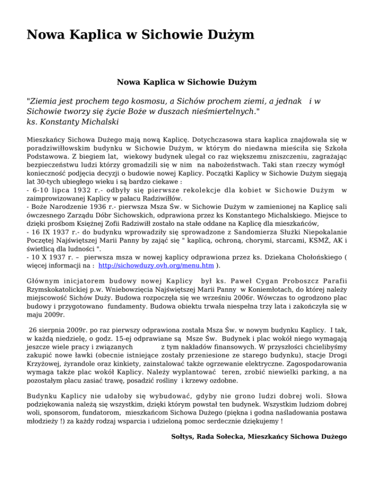Nowa Kaplica w Sichowie Dużym Nowa Kaplica w Sichowie Dużym "Ziemia jest prochem tego kosmosu, a Sichów prochem ziemi, a jednak i w Sichowie tworzy się życie Boże w duszach nieśmiertelnych." ks. Konstanty Michalski Mieszkańcy Sichowa Dużego mają nową Kaplicę. Dotychczasowa stara kaplica znajdowała się w poradziwiłłowskim budynku w Sichowie Dużym, w którym do niedawna mieściła się Szkoła Podstawowa. Z biegiem lat, wiekowy budynek ulegał co raz większemu zniszczeniu, zagrażając bezpieczeństwu ludzi którzy gromadzili się w nim na nabożeństwach. Taki stan rzeczy wymógł konieczność podjęcia decyzji o budowie nowej Kaplicy. Początki Kaplicy w Sichowie Dużym sięgają lat 30-tych ubiegłego wieku i są bardzo ciekawe : - 6-10 lipca 1932 r.- odbyły się pierwsze rekolekcje dla kobiet w Sichowie Dużym w zaimprowizowanej Kaplicy w pałacu Radziwiłłów. - Boże Narodzenie 1936 r.- pierwsza Msza Św. w Sichowie Dużym w zamienionej na Kaplicę sali ówczesnego Zarządu Dóbr Sichowskich, odprawiona przez ks Konstantego Michalskiego. Miejsce to dzięki prośbom Księżnej Zofii Radziwiłł zostało na stałe oddane na Kaplicę dla mieszkańców, - 16 IX 1937 r.- do budynku wprowadziły się sprowadzone z Sandomierza Służki Niepokalanie Poczętej Najświętszej Marii Panny by zająć się " kaplicą, ochroną, chorymi, starcami, KSMŻ, AK i świetlicą dla ludności ". - 10 X 1937 r. – pierwsza msza w nowej kaplicy odprawiona przez ks. Dziekana Chołońskiego ( więcej informacji na : http://sichowduzy.ovh.org/menu.htm ). Głównym inicjatorem budowy nowej Kaplicy był ks. Paweł Cygan Proboszcz Parafii Rzymskokatolickiej p.w. Wniebowzięcia Najświętszej Marii Panny w Koniemłotach, do której należy miejscowość Sichów Duży. Budowa rozpoczęła się we wrześniu 2006r. Wówczas to ogrodzono plac budowy i przygotowano fundamenty. Budowa obiektu trwała niespełna trzy lata i zakończyła się w maju 2009r. 26 sierpnia 2009r. po raz pierwszy odprawiona została Msza Św. w nowym budynku Kaplicy. I tak, w każdą niedzielę, o godz. 15-ej odprawiane są Msze Św. Budynek i plac wokół niego wymagają jeszcze wiele pracy i związanych z tym nakładów finansowych. W przyszłości chcielibyśmy zakupić nowe ławki (obecnie istniejące zostały przeniesione ze starego budynku), stacje Drogi Krzyżowej, żyrandole oraz kinkiety, zainstalować także ogrzewanie elektryczne. Zagospodarowania wymaga także plac wokół Kaplicy. Należy wyplantować teren, zrobić niewielki parking, a na pozostałym placu zasiać trawę, posadzić rośliny i krzewy ozdobne. Budynku Kaplicy nie udałoby się wybudować, gdyby nie grono ludzi dobrej woli. Słowa podziękowania należą się wszystkim, dzięki którym powstał ten budynek. Wszystkim ludziom dobrej woli, sponsorom, fundatorom, mieszkańcom Sichowa Dużego (piękna i godna naśladowania postawa młodzieży !) za każdy rodzaj wsparcia i udzieloną pomoc serdecznie dziękujemy ! Sołtys, Rada Sołecka, Mieszkańcy Sichowa Dużego Pierwsza uroczysta Msza Święta - 26 sierpień 2009r. Nowa Kaplica - widok ogólny. Wejście główne do nowej Kaplicy. Wnętrze kaplicy. Ołtarz główny. Budynki "poradziwiłłowskie", w których kiedyś mieściła się Szkoła Podstawowa i stara kaplica. Widok na budynek starej Szkoły Podstawowej w Sichowie Dużym. Gmina Rytwiany - www.rytwiany.com.pl