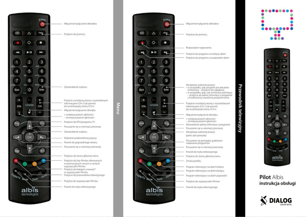 Włączenie/wyłączenie dekodera Włączenie/wyłączenie dekodera Przejście do pomocy Przejście do pomocy Rozpoczęcie nagrywania Przejście do programu na kolejny dzień Przejście do programu na poprzedni dzień Włączenie/wyłączenie dźwięku + zwiększa poziom głośności – zmniejsza poziom głośności Przejście do EPG/programu TV Poruszanie się w orientacji pionowej Zatwierdzenie wyboru Wybranie podświetlonej pozycji Menu Przejście na kolejną stronę z wyświetlanymi informacjami (CH–) lub powrót do wcześniejszej strony (CH+) Przejście na kolejną stronę z wyświetlanymi informacjami (CH–) lub powrót do wcześniejszej strony (CH+) Włączenie/wyłączenie dźwięku + zwiększa poziom głośności – zmniejsza poziom głośności Wyświetlanie pełnej informacji o programie Poruszanie się w orientacji pionowej Akceptacja wybranej pozycji (patrz opis powyżej) Powrót do poprzedniego ekranu Poruszanie się pomiędzy godzinami nadawania programów Poruszanie się w orientacji pionowej Poruszanie się w orientacji pionowej Przewodnik telewizyjny Akceptacja wybranej pozycji • w przypadku, gdy program jest aktualnie emitowany – przejście do oglądania • w przypadku, gdy czas emisji jest późniejszy – przejście do pełnej informacji o programie z możliwością ustawienia przypomnienia Zatwierdzenie wyboru Powrót do trybu telewizyjnego Przejście do strony głównej menu Przejście do strony głównej menu Przejście do listy filmów oferowanych w promocyjnych cenach w ramach wypożyczalni filmów Przejście do kategorii „nowości” w wypożyczalni filmów Przejście do przewodnika telewizyjnego Zmiana profilu Przejście do wypożyczalni filmów Przejście do wypożyczalni filmów Powrót do trybu telewizyjnego Powrót do trybu telewizyjnego Program telewizyjny na dzień kolejny Program telewizyjny na dzień bieżący Program telewizyjny na dzień poprzedni Pilot Albis instrukcja obsługi Włączenie/wyłączenie dekodera Włączenie/wyłączenie dekodera Przejście do pomocy Przejście do pomocy Zatrzymanie filmu Przewijanie do tyłu Rozpoczęcie nagrywania Przewijanie do przodu Pozwala na wprowadzenie odcinka czasu, o który użytkownik chce przewinąć film do przodu lub do tyłu. Po wprowadzeniu odcinka czasu należy wcisnąć w celu przewinięcia do przodu w celu przewinięcia filmu do tyłu. lub Wybór kanału Zatwierdzenie wyboru Włączenie/wyłączenie dźwięku + zwiększa poziom głośności – zmniejsza poziom głośności Informacja o aktualnie wyświetlanym programie. Po podwójnym naciśnięciu klawisza INFO na ekranie wyświetla się informacja zawierająca pełny opis pozycji. Poruszanie się pomiędzy kanałami i wyświetlanie informacji na temat oglądanych programów. Uzyskiwanie informacji o programach nadawanych o późniejszej lub wcześniejszej godzinie. Włączenie/wyłączenie dźwięku + zwiększa poziom głośności – zmniejsza poziom głośności Tryb wideo Zmiana kanału w dół (CH+) Zmiana kanału w górę (CH–) Tryb telewizyjny Powrót do poprzednio oglądanego kanału Powrót do wypożyczalni filmów Powrót na stronę główną menu Zatwierdzenie wyboru Powrót do poprzednio oglądanego kanału Wejście do menu Przejście do wypożyczalni filmów Powrót do trybu telewizyjnego Pilot Albis Przejście do wypożyczalni filmów Powrót do trybu telewizyjnego instrukcja obsługi