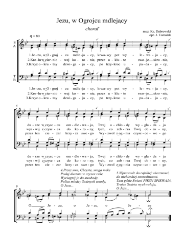 Jezu, w Ogrojcu mdlejacy , choral q = 80 S A muz. Ks. Dabrowski opr. J. Tomalak 1.Je - zu, w_O - groj - cu mdle - ja - cy, krwa - wy pot wy 2.Kro - lu w_cier - nio - wej ko - ro - nie, przez u - klu - te 3.Krzyz o - kru - tny dzwi - ga - ja - cy, po trzy - kroc u - le - wa - ja - cy, swo - je skro - nie, pa - da - ja - cy, T B 1.Je - zu, w_O - groj - cu mdle - ja - cy, krwa - wy pot wy 2.Kro - lu w_cier - nio - wej ko - ro - nie, przez u - klu - te 3.Krzyz o - kru - tny dzwi - ga - ja - cy, po trzy - kroc u 5 du - sze w_czysc - cu wyr - wij z_czysc - ca przez ten cie - zar om - dle - wa - ja, do ko - ro - ny, krzy - za swe - go du - sze w_czysc - cu wyr - wij z_czysc - ca przez ten cie - zar 9 O Je - zu, o Je - zu, o Twej o - chlo - dy wy - gla - da - ja tych, co zeb - rza Twej ob - ro - ny, Wy - zwol z_og - nia czysc - co - we - go Twej o - chlo - dy wy - gla - da - ja tych, co zeb - rza Twej ob - ro - ny, Wy - zwol z_og - nia czysc - co - we - go 4.Przez swa, Chryste, sroga meke Podaj duszom w czyscu reke, Wyciagnij je do swobody, Policz miedzy Swietych trzody, O Jezu... - le - wa - ja - cy, swo - je skro - nie, pa - da - ja - cy, om - dle - wa - ja, do ko - ro - ny, krzy - za swe - go - 5.Wprowadz do rajskiej wiecznosci, do niebieskiej szczesliwosci, Tam gdzie Swieci PIESN SPIEWAJA, Trojce Swieta wychwalaja, O Jezu... Je - zu