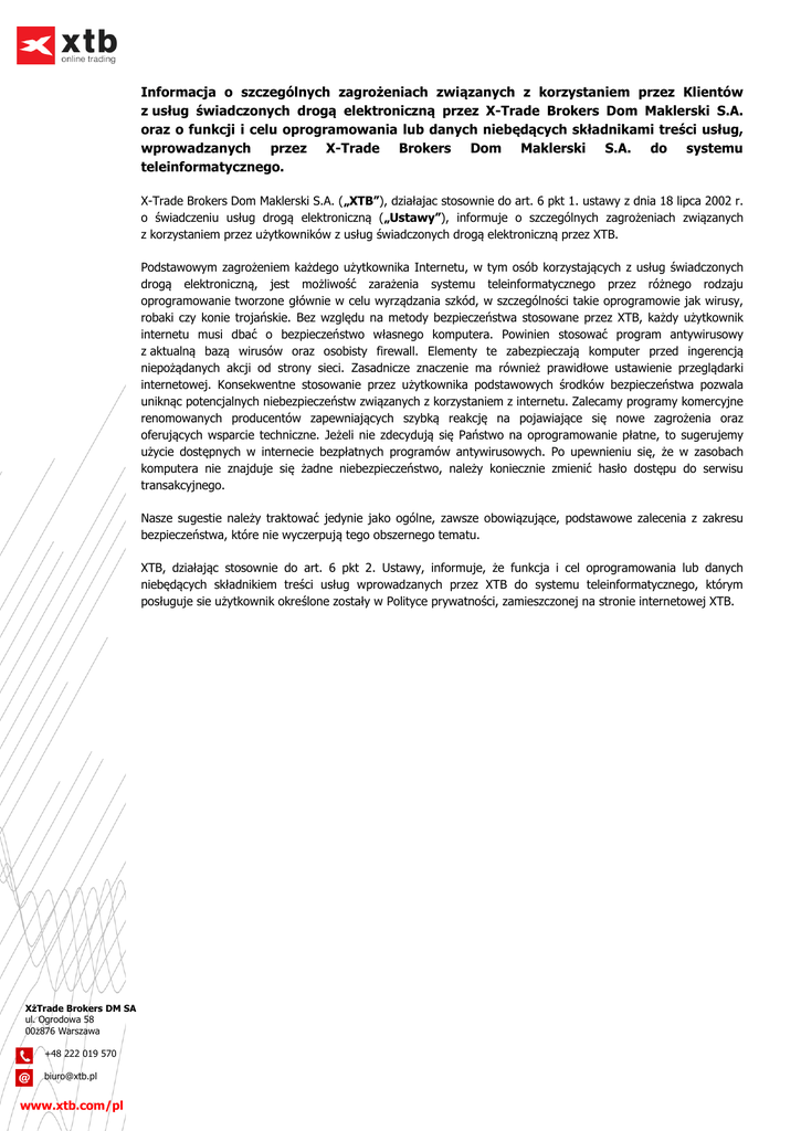 Informacja o szczególnych zagrożeniach związanych z korzystaniem przez Klientów z usług świadczonych drogą elektroniczną przez X-Trade Brokers Dom Maklerski S.A. oraz o funkcji i celu oprogramowania lub danych niebędących składnikami treści usług, wprowadzanych przez X-Trade Brokers Dom Maklerski S.A. do systemu teleinformatycznego. X-Trade Brokers Dom Maklerski S.A. („XTB”), działajac stosownie do art. 6 pkt 1. ustawy z dnia 18 lipca 2002 r. o świadczeniu usług drogą elektroniczną („Ustawy”), informuje o szczególnych zagrożeniach związanych z korzystaniem przez użytkowników z usług świadczonych drogą elektroniczną przez XTB. Podstawowym zagrożeniem każdego użytkownika Internetu, w tym osób korzystających z usług świadczonych drogą elektroniczną, jest możliwość zarażenia systemu teleinformatycznego przez różnego rodzaju oprogramowanie tworzone głównie w celu wyrządzania szkód, w szczególności takie oprogramowie jak wirusy, robaki czy konie trojańskie. Bez względu na metody bezpieczeństwa stosowane przez XTB, każdy użytkownik internetu musi dbać o bezpieczeństwo własnego komputera. Powinien stosować program antywirusowy z aktualną bazą wirusów oraz osobisty firewall. Elementy te zabezpieczają komputer przed ingerencją niepożądanych akcji od strony sieci. Zasadnicze znaczenie ma również prawidłowe ustawienie przeglądarki internetowej. Konsekwentne stosowanie przez użytkownika podstawowych środków bezpieczeństwa pozwala uniknąc potencjalnych niebezpieczeństw związanych z korzystaniem z internetu. Zalecamy programy komercyjne renomowanych producentów zapewniających szybką reakcję na pojawiające się nowe zagrożenia oraz oferujących wsparcie techniczne. Jeżeli nie zdecydują się Państwo na oprogramowanie płatne, to sugerujemy użycie dostępnych w internecie bezpłatnych programów antywirusowych. Po upewnieniu się, że w zasobach komputera nie znajduje się żadne niebezpieczeństwo, należy koniecznie zmienić hasło dostępu do serwisu transakcyjnego. Nasze sugestie należy traktować jedynie jako ogólne, zawsze obowiązujące, podstawowe zalecenia z zakresu bezpieczeństwa, które nie wyczerpują tego obszernego tematu. XTB, działając stosownie do art. 6 pkt 2. Ustawy, informuje, że funkcja i cel oprogramowania lub danych niebędących składnikiem treści usług wprowadzanych przez XTB do systemu teleinformatycznego, którym posługuje sie użytkownik określone zostały w Polityce prywatności, zamieszczonej na stronie internetowej XTB. XżTrade Brokers DM SA ul. Ogrodowa 58 00ż876 Warszawa +48 222 019 570 [email protected] www.xtb.com/pl