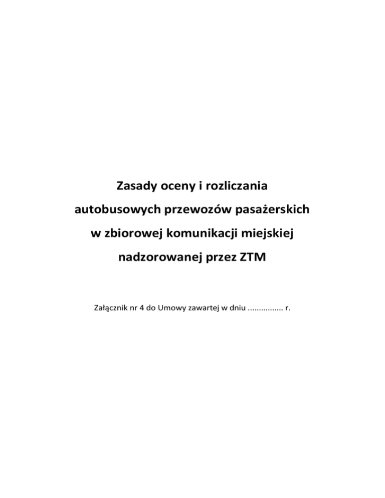 Zasady oceny i rozliczania autobusowych przewozów pasażerskich w zbiorowej komunikacji miejskiej nadzorowanej przez ZTM Załącznik nr 4 do Umowy zawartej w dniu ................ r. Zasady oceny i rozliczania autobusowych przewozów pasażerskich w zbiorowej komunikacji miejskiej nadzorowanej przez ZTM 1. Zasady dokonywania oceny jakości funkcjonowania linii komunikacji zbiorowej obsługiwanych przez Operatora oraz naliczania wynagrodzenia Operatora 1.1. Wynagrodzenie za usługi przewozowe realizowane na podstawie Umowy przysługuje Operatorowi wyłącznie za wozokilometry wykonane przez autobusy Operatora udostępnione dla pasażerów: a) w pełnych kursach bez przerw w ruchu, b) w częściach kursów wadliwych niezależnie od przyczyny wadliwości, pod warunkiem wykonania ich zgodnie z rozkładem, c) na odcinkach tras zleconych przez ZTM (realizowanych również jako PTR). Wynagrodzenie za wozokilometry autobusu naprawionego lub rezerwowego, albo włączonego do ruchu po przerwie spowodowanej np. niedyspozycją kierowcy przysługiwać będzie Operatorowi i dopiero od momentu włączenia się autobusu do ruchu w czasie i punkcie przewidzianym w rozkładzie jazdy. Dopuszczalną granicą opóźnienia jest nie wyprzedzenie autobusu przez następną brygadę. Wynagrodzenie Operatora za wozokilometry autobusowe wykonywane na stałych trasach rozkładowych oblicza się na podstawie przeprowadzanego przez ZTM obmiaru trasy zawartej w rozkładzie jazdy. W pozostałych przypadkach – na podstawie adnotacji w zleceniu ZTM lub adnotacji w dziennym wykazie zdarzeń w komunikacji autobusowej – podstawą dla obliczenia wynagrodzenia mogą być wskazania autobusowego licznika kilometrów. W przypadku wprowadzenia czasowych zmian w komunikacji miejskiej na wniosek jednostek zewnętrznych trwających: dłużej niż jeden miesiąc – wówczas Operator przekazuje do ZTM do 5. dnia każdego miesiąca następujące informacje dotyczące realizacji poszczególnych zleceń: a) liczbę wozokilometrów straconych na poszczególnych liniach w wyniku wprowadzonych danym zleceniem zmian w komunikacji miejskiej, b) liczbę wykonanych dodatkowo wozokilometrów w wyniku wprowadzonych danych zleceniem zmian w komunikacji miejskiej. krócej niż jeden miesiąc – wówczas Operator przekazuje do 5 dni po zakończeniu obowiązywania Zlecenia zmiany, informacji wyszczególnionych w pkt 1.4.1 a) i b). 1.2. 1.3. 1.4. 1.4.1. 1.4.2. 2. Ocena jakości wykonania usług przewozowych 2.1. W celu dokonywania oceny jakości usług przewozowych wykonywanych przez Operatora (badanie zawodności i punktualności) oraz określenia liczby wadliwych kursów, Operator obowiązany jest do terminowego i rzetelnego wypełniania kart drogowych odrębnie dla każdego kursu, w szczególności: a) dokonywania wpisów o wykonaniu kursu dopiero po jego zakończeniu i nie później niż przed rozpoczęciem następnego kursu, b) dokonywania wpisów informacji o wszelkich odstępstwach od rozkładu jazdy z podaniem ich przyczyn, c) dokonywania wpisów o wykonywanych przejazdach technicznych rozkładowych i nierozkładowych, d) dokonywania wpisów o każdym objeździe trasy podstawowej, e) dokonywania wpisów o każdej decyzji służb nadzoru ruchu w zakresie wprowadzenia zmiany ustalonego pierwotnie rozkładu jazdy, f) dokonywania wpisów o każdej awarii lub uszkodzeniu autobusu lub wyposażenia, g) wystawiania kart drogowych oddzielnie dla każdej brygady. Jakość usług przewozowych wykonywanych przez Operatora na podstawie Umowy jest oceniana przez ZTM i wpływa na wysokość wynagrodzenia Operatora. Ustala się globalny wskaźnik jakości J w rozliczanym miesiącu, jako ocenę punktową, wyliczaną ze wzoru: J= JN+ JP+∑U 2.2. 2.3. gdzie: J = globalny wskaźnik jakości JN = wskaźnik oceny niezawodności kursowania JP = wskaźnik oceny punktualności kursowania Załącznik nr 4 do Umowy zawartej w dniu ................ r. strona 2 Zasady oceny i rozliczania autobusowych przewozów pasażerskich w zbiorowej komunikacji miejskiej nadzorowanej przez ZTM 2.4. ∑U = suma cząstkowych ocen wynikających z występowania uchybień w jakości wykonania umowy, określonych w pkt. 5.1. W zależności od wielkości wskaźnika J, koryguje się bazową jednostkową stawkę odpłatności, określoną w § 4 Umowy (stawka jest odpowiednio obniżana lub podwyższana o wielkość korekty): SK=S+S×K gdzie: SK = skorygowana jednostkowa stawka odpłatności w danym miesiącu S = określona w umowie bazowa jednostkowa stawka odpłatności w danym roku K = wielkość korekty wyznaczana z tabeli: J [pkt] K od do -10000 -5001 -20% -5000 -4001 -5% -4000 -3001 -4% -3000 -2001 -3% -2000 -1001 -2% -1000 -501 -1% -500 499 0 500 999 1% 1000 1999 2% 2000 2999 3% 3000 5000 4% 3. Niezawodność kursowania 3.1. Wskaźnik niezawodności kursowania pojazdów na liniach komunikacyjnych „N”, który stanowi stosunek liczby kursów wadliwych w danym miesiącu do łącznej rozkładowej liczby kursów w tym miesiącu, z uwzględnieniem wszystkich zmian doraźnych. Uwzględniając definicje zawarte w Załączniku nr 5 do Umowy za kurs wykonany prawidłowo uznaje się kurs wykonany w całości zgodnie z obowiązującym rozkładem jazdy lub otrzymanym od ZTM zleceniem. Za kurs wadliwy uważa się: a) każdy kurs, w którym nastąpiła przerwa w ruchu, w wyniku której pasażerowie opuścili autobus (mimo zrealizowania go w ramach rozkładowego czasu), b) każdy kurs niewykonany w ramach liczby przewidzianej rozkładem jazdy, c) każdy kurs niewykonany w pełni (z wyjątkiem kursów zawieszonych przez ZTM), d) każdy kurs niespełniający wymogów określonych w pkt. 1.1, e) każdy kurs, w którym nastąpiło zatrzymanie lub wyłączenie autobusu z ruchu albo opóźnienie rozkładowe będące skutkiem naruszenia przepisów ruchu drogowego przez kierowcę autobusu, f) każdy kurs, w którym nastąpiło zatrzymanie lub wyłączenie autobusu z ruchu w wyniku nie zastosowania si