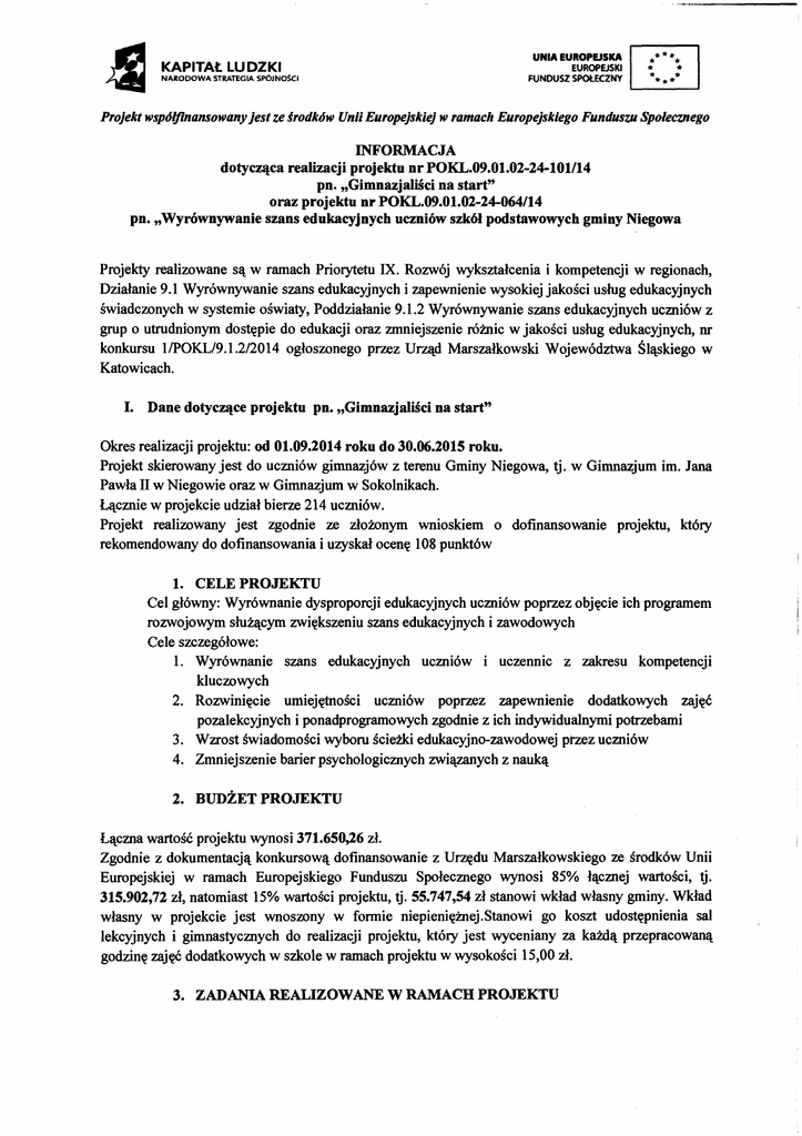 KAPITAt LUDZKI NARODOWA sTRA- rtc IA VC:INCA° UNIA EUROPEJSKA EUROPEJSKI FUNDUSZ SPOLECZNY Projekt wspolfinansowany jest ze Srodkow Unii Europejskiej w ramach Europejskiego Funduszu Spolecznego INFORMACJA dotyczqca realizacji projektu nr POKL.09.01.02-24-101/14 pn. „Gimnazjaliici na start" oraz projektu nr POKL.09.01.02-24-064/14 pn. „Wyrownywanie szans edukacyjnych uczniow szkol podstawowych gminy Niegowa Projekty realizowane sq w ramach Priorytetu IX. RozwOj wyksztalcenia i kompetencji w regionach, Dzialanie 9.1 Wyrownywanie szans edukacyjnych i zapewnienie wysokiej jakoki uslug edukacyjnych gwiadczonych w systemie o§wiaty, Poddzialanie 9.1.2 Wyrownywanie szans edukacyjnych uczniow z grup o utrudnionym dostcpie do edukacji oraz zmniejszenie roknic w jakoki uslug edukacyjnych, nr konkursu 1/POKL/9.1.2/2014 ogloszonego przez Urzqd Marszalkowski Wojewodztwa 514skiego w Katowicach. I. Dane dotyczqce projektu pn. „Gimnazjaliici na start" Okres realizacji projektu: od 01.09.2014 roku do 30.06.2015 roku. Projekt skierowany jest do uczniow gimnazjow z terenu Gminy Niegowa, tj. w Gimnazjum im. Jana Pawla II w Niegowie oraz w Gimnazjum w Sokolnikach. Lqcznie w projekcie udzial bierze 214 uczniow. Projekt realizowany jest zgodnie ze zlotonym wnioskiem o dofinansowanie projektu, ktory rekomendowany do dofinansowania i uzyskal ocene 108 punkt6w 1. CELE PROJEKTU Cel glowny: Wyrownanie dysproporcji edukacyjnych uczniow poprzez objccie ich programem rozwojowym slutkcym zwickszeniu szans edukacyjnych i zawodowych Cele szczegolowe: 1. Wyrownanie szans edukacyjnych uczniow i uczennic z zakresu kompetencji kluczowych 2. Rozwiniccie umiejctnoki uczniow poprzez zapewnienie dodatkowych zajco pozalekcyjnych i ponadprogramowych zgodnie z ich indywidualnymi potrzebami 3. Wzrost gwiadomoki wyboru gcietki edukacyjno-zawodowej przez uczniow 4. Zmniejszenie barier psychologicznych zvvi4zanych z nauk4 2. BUDZET PROJEKTU Laczna wartoge projektu wynosi 371.650,26 zl. Zgodnie z dokumentacj4 konkursowk dofinansowanie z Urzcdu Marszalkowskiego ze grodkow Unii Europejskiej w ramach Europejskiego Funduszu Spolecznego wynosi 85% kcznej wartoki, tj. 315.902,72 zl, natomiast 15% wartoki projektu, tj. 55.747,54 zl stanowi wklad wlasny gminy. Wklad wlasny w projekcie jest wnoszony w formie niepienicknej.Stanowi go koszt udostepnienia sal lekcyjnych i gimnastycznych do realizacji projektu, ktory jest wyceniany za ka±c14 przepracowang godzinc zajco dodatkowych w szkole w ramach projektu w wysokoki 15,00 zl. 3. ZADANIA REALIZOWANE W RAMACH PROJEKTU KAP ITAt LLI DZKI NARODOWA STRATEGA SPOJNOtC1 UNIA EUROPEISKA EUROPEJSK1 FUNDUSZ SPO&ECZNY Projekt wspdifinansowany jest ze .frodkow Unii Europejskiej w ramach Europejskiego Funduszu Spolecznego W ramach projektu realizowane sa zaiecia dodatkowe dla ucznitow przez wymienionych nitei nauczycieli: Zadanie 1- Zajecia wyrownawcze i rozwijajqce w Gimnazjum w Niegowej Lp 1 Imie i nazwisko nauczyciela Rudkowska-Morawiec Bernadetta 2 Dorota Giec 3 Zbigniew Lenartowicz 4 5 6 Edyta Bacior Anna Nocuri Barbara Typel 7 Barbara Kasznia 8 Joanna Haladus 9 Irena Fogtman 10 Marzena Mazanek Rodzaj prowadzonych zajea Zajccia rozwijajkce z jczyka polskiego Zajccia wyrownawcze z jczyka polskiego Zajecia logopedyczne Zajecia rozwijajkce z jczyka polskiego Zajccia wyrownawcze z jczyka polskiego Zajccia artystyczne Zajecia rozwijajkce z jczyka polskiego Zajecia wyrownawcze z jezyka polskiego Zajccia artystyczne Zajccia rozwijajkce z jczyka angielskiego Zajccia wyrownawcze z jczyka angielskiego Zajecia rozwijajkce z jczyka niemieckiego Zajccia wyrownawcze z jczyka niemieckiego Zajccia rozwijajkce z geografii Zajecia wyrOwnawcze z geografii Zajecia rozwijajkce z biologii Zajccia wyrownawcze z biologii Zajccia rozwijajkce z fizyki Zajccia wyrownawcze z fizyki Zajccia rozwijajkce z historii Zajecia wyrOwnawcze z historii Zajecia rozwijajace z chemii Zajecia wyrownawcze z chemii Zajccia rozwijajkce z matematyki Zajccia wyr6wnawcze z matematyki Zajecia rozwijajkce z chemii Kolo mlodego technika Zajccia wyrownawcze z chemii Zajecia rozwijajkce z matematyki Zajccia wyrownawcze z matematyki Zajccia rozwijajace z matematyki Zajccia wyrownawcze z matematyki Zajccia sportowe Zajecia sportowe Zajccia przedsicbiorczoki Liczba godzin tygodniowo 1 1 3 2 2 1 1 1 1 2 2 2 2 2 2 2 2 2 2 2 11 ElZbieta Lesiecka 1 1 1 2 12 Ewa Baryla 2 2 13 Malgorzata Marecka 2 2 1 1 14 Joanna Chwastek 1 4 15 Artur Kolacz 2 16 Miroslaw Uzar 9 godzin w 17 Leszek Kawecki miesikcu Dyiur pedagoga szkolnego 18 Jolanta Urgacz 3 Zajecia Szkolnego Ogrodka Kariery SZOK 10 19 Agnieszka Kurek Ogolem 72 godziny tygodniowo plus 9 godzin miesigcznie zajecia przedsicbiorczoki KAPITAt LU DZ K I NARODOWA STRATEGIA SPENNOtC1 UMit EUROPEJSKA EUROPEISKI FUNDUSZ SPOLECZNY Projekt wspolfinansowany jest ze irodlaw Unii Europejskiej w ramach Europejskiego Funduszu Spolecznego Zadanie 2- zakcia wyrownawcze i rozwijaj4ce w Gimnazjum w Sokolnikach Lp 'ink i nazwisko Rodzaj prowadzonych zajgo Liczba godzin nauczyciela tygodniowo 1 Marta Motyl Zajecia logopedyczne 1 2 Malgorzata Polak Zajecia rozwijajqce z informatyki 1 3 Sylwia Pado Zajecia wyrownawcze z jezyka polskiego 2 Zajccia rozwijajqce z jezyka polskiego 2 4 Ewa Szewczyk Zajccia wyr6wnawcze z historii i WOS-u 2 5 Barbara Kasznia Zajecia wyrownawcze z geografii 1 6 Irena Fogtman Zajccia wyrownawcze z fizyki 2 7 Tomasz Goluchowski Zajecia wyrownawcze z chemii 2 8 Gryl Urszula Zajccia wyrownawcze z biologii 2 9 Jolanta Widawska Zajccia wyrownawcze z matematyki 2 Zajccia rozwijajgce z matematyki 2 10 Magdalena Raczek zajccia wyr6wnawcze z jczyka angielskiego zajccia rozwijajqce z jczyka angielskiego 1 11 Barbara Legniewska Zajccia sportowe 1 12 Irena Gabryel Zajecia sportowe 1 13 Barbara Typel Zajccia wyr6wnawcze z jezyka niemieckiego 1 Zajecia wyrownawcze z jezyka niemieckiego 1 14 Renata Bariska Zajccia- dyzur pedagoga szkolnego 1 Zajecia artystyczne 2 15 Aneta Zmuda zajqcia przedsiebiorczoki 3 godz w miesiacu za