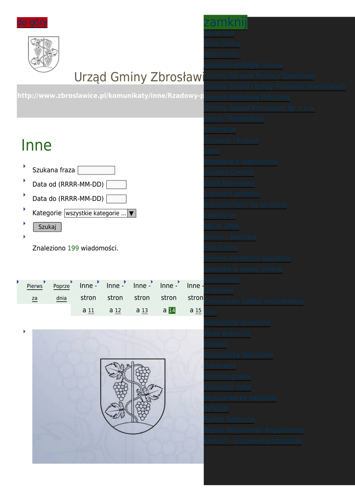 zamknij do góry Samorząd Rada Gminy Wójt Gminy Jednostki podległe Gminie Gminny Ośrodek Pomocy Społecznej Urząd Gminy Zbrosławice Gminny Zespół Obsługi Placówek Oświatowych http://www.zbroslawice.pl/komunikaty/inne/Rzadowy-program-wspierania-osob-pobierajacyc Gminna Biblioteka Publiczna Gminny Zakład Komunalny/printpdf/st:14 Sp. z o.o. Szkoły i Przedszkola Informacje Inne Edukacja i Kultura Sport Współpraca zagraniczna Szukana fraza Gazetka Gminna Data od (RRRR-MM-DD) Sztab Kryzysowy 1 procent podatku Data do (RRRR-MM-DD) Nieruchomości na sprzedaż Kategorie wszystkie kategorie ... ▼ Inwestycje AKCJA ZIMA Szukaj Gmina i Sołectwa Plan Gminy Znaleziono 199 wiadomości. Gminna ewidencja zabytków Sołectwa w naszej Gminie Pierws Poprze Inne - Inne - Inne - Inne - za dnia stron stron stron stron a 11 a 12 a 13 a 14 Komunikaty Inne - Inne - Inne - Następ Ostatni Urzędowe stron stron stron na a Komunikaty Sztabu kryzysowego a 15 Innea 16 a 17 Konsultacje społeczne Akcje wyborcze Kontakt Gospodarka Odpadami Deklaracja Harmonogramy Kalkulator opłat Wyszukiwarka odpadów MPSZOK Punkty Apteczne Rejestr Działalności Regulowanej Kontakt - Gospodarka odpadami 02 MAR 2012 Siłownie wiatrowe kategoria: Inne Elektrownie wiatrowe W chwili obecnej w trakcie opracowywania jest studium uwarunkowań i kierunków zagospodarowania Gminy. Jednym z proponowanych jego elementów jest określenie obszarów, na których w przyszłości będą mogły zostać umieszczone siłownie wiatrowe. Jesienią ubiegłego roku reprezentacja Rady Gminy wraz z Wójtem i Z-cą Wójta udała się z wizytą do Gminy Wolin, gdzie w chwili obecnej funkcjonują dwie farmy 24 LUT 2012 Informacja dotycząca zgłaszania szkód łowieckich kategoria: Inne Informacja dotycząca : zgłaszania szkód łowieckich przez właścicieli lub posiadaczy gruntów. Na podstawie § 1 ust. 1 i 2 Rozporządzenia Ministra Środowiska z dnia 8 marca 2010 r. w sprawie sposobu postępowania przy szacowaniu szkód łowieckich oraz wpłat odszkodowań za szkody w uprawach i płodach rolnych (Dz.U. z 2010 r. Nr 45, poz.272), Zarząd Koła Łowieckiego „Orzeł" Tarnowskie Góry jako dzierżawca obwodu łowieckiego 09 LUT 2012 kategoria: Wojewódzki Konkurs Grafiki Komputerowej Inne Zapraszamy uczniów szkół podstawowych, gimnazjalnych i ponadgimnazjalnych do wzięcia udziału w ciekawym Wojewódzkim Konkursie Grafiki Komputerowej „KIM JESTEM? - MOJE METAMORFOZY". Szczegóły tutaj. 19 STY 2012 Apel o pomoc - Denis Czmok 18 STY 2012 Ogólnopolski Konkurs Grantowy kategoria: Inne Polska Fundacja Dzieci i Młodzieży ogłasza Ogólnopolski Konkurs Grantowy w ramach Programu "Równać Szanse 2012" Polsko-Amerykańskiej Fundacji Wolności. Celem Programu jest wyrównywanie szans na dobry start w dorosłe życie młodzieży z terenów wiejskich i małych miast (do 20 000 mieszkańców) poprzez podnoszenie ich kompetencji i rozwój umiejętności społecznych. W Ogólnopolskim Konkursie Grantowym o dotacje do 40 000 zł na 16 STY 2012 Złote i Szmaragdowe Gody kategoria: Inne 11 stycznia w Centrum Usług Publicznych w Zbrosławicach odbyła się szczególna uroczystość. Przybyło na nią 19 par, obchodzących Złote Gody oraz 4 pary obchodzące Szmaragdowe Gody. Jubilaci zostali uhonorowani przez władze gminy. Wójt Wiesław Olszewski w towarzystwie wicewójt Katarzyny Sosady oraz Weroniki Kaczmarek z Urzędu Stanu Cywilnego wręczył przybyłym na uroczystość małżeństwom medale za długoletnie pożycie 13 STY 2012 kategoria: FESTIWAL GÓRSKI ZAPRASZA MŁODZIEŻ Inne W dniach 17-19.02.2012r. w Gliwicach odbędzie się Festiwal Górski. Jeśli zbierze się liczna grupa młodych entuzjastów tej tematyki, jest możliwość zorganizowania dowozu do Gliwic w dniu 17.02 w godzinach 11.00 - 15.00 W tym czasie program festiwalu przewiduje tzw. "część młodzieżową". Osoby zainteresowane prosimy o przesyłanie zgłoszeń na adres [email protected] 12 STY 2012 UWAGA ROLNICY WILKOWIC kategoria: Inne Dnia 14 stycznia (sobota), w godzinach od 11.00-13.00 będzie istniała możliwość opłacenia ubezpieczenia rolniczego tzw. „ogniówka" w DELIKATESACH KUBIK w Wilkowicach Sołtys Damian Nowara 10 STY 2012 kategoria: Zwrot podatku akcyzowego 2012 Inne NOWE TERMINY SKŁADANIA WNIOSKÓW O ZWROT PODATKU AKCYZOWEGO Na posiedzeniu w dniu 20 grudnia 2011 r. Rada Ministrów określiła stawkę zwrotu podatku akcyzowego na 2012 r. od oleju napędowego zużywanego do produkcji rolnej w wysokości 0,95 zł od 1 litra oleju. W 2012 r. producenci rolni będą mogli składać wnioski o zwrot podatku akcyzowego zawartego w cenie oleju napędowego wykorzystywanego do produkcji rolnej do wójta, burmistrza 10 STY 2012 Komunikat GOPS kategoria: Inne Komunikat w sprawie rządowego programu wspierania niektórych osób pobierających świadczenie pielęgnacyjne w okresie od stycznia do marca 2012 r. Rada Ministrów w dniu 27 grudnia 2011 r. przyjęła uchwałę w sprawie ustanowienia rządowego programu wspierania niektórych osób pobierających świadczenie pielęgnacyjne w okresie od stycznia do marca 2012 r. oraz rozporządzenie w sprawie szczegółowych warunków realizacji rządowego Pierws Poprze Inne - Inne - Inne - Inne - Inne - Inne - Inne - Następ Ostatni za dnia stron stron stron stron stron stron stron na a a 11 a 12 a 13 a a 15 a 16 a 17 14