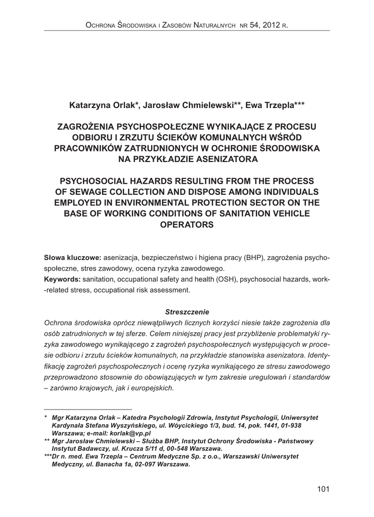Ochrona Środowiska i Zasobów Naturalnych nr 54, 2012 r. Katarzyna Orlak*, Jarosław Chmielewski**, Ewa Trzepla*** Zagrożenia psychospołeczne wynikające z procesu odbioru i zrzutu ścieków komunalnych wśród pracowników zatrudnionych w ochronie środowiska na przykładzie asenizatora Psychosocial hazards resulting from the process of sewage collection and dispose among individuals employed in environmental protection sector on the base of working conditions of sanitation vehicle operators Słowa kluczowe: asenizacja, bezpieczeństwo i higiena pracy (BHP), zagrożenia psychospołeczne, stres zawodowy, ocena ryzyka zawodowego. Keywords: sanitation, occupational safety and health (OSH), psychosocial hazards, work-related stress, occupational risk assessment. Streszczenie Ochrona środowiska oprócz niewątpliwych licznych korzyści niesie także zagrożenia dla osób zatrudnionych w tej sferze. Celem niniejszej pracy jest przybliżenie problematyki ryzyka zawodowego wynikającego z zagrożeń psychospołecznych występujących w procesie odbioru i zrzutu ścieków komunalnych, na przykładzie stanowiska asenizatora. Identyfikację zagrożeń psychospołecznych i ocenę ryzyka wynikającego ze stresu zawodowego przeprowadzono stosownie do obowiązujących w tym zakresie uregulowań i standardów – zarówno krajowych, jak i europejskich. * Mgr Katarzyna Orlak – Katedra Psychologii Zdrowia, Instytut Psychologii, Uniwersytet Kardynała Stefana Wyszyńskiego, ul. Wóycickiego 1/3, bud. 14, pok. 1441, 01-938 Warszawa; e-mail: [email protected] ** Mgr Jarosław Chmielewski – Służba BHP, Instytut Ochrony Środowiska - Państwowy Instytut Badawczy, ul. Krucza 5/11 d, 00-548 Warszawa. ***Dr n. med. Ewa Trzepla – Centrum Medyczne Sp. z o.o., Warszawski Uniwersytet Medyczny, ul. Banacha 1a, 02-097 Warszawa. 101 Katarzyna Orlak, Jarosław Chmielewski, Ewa Trzepla Summary In spite of plenty meaningful advantages raising from the environmental protection, it also brings some hazards which individuals employed in this area are exposed to. The purpose of the paper is to highlight problem of occupational risk related to psychosocial hazards connected with the process of sewage collection and dispose based on working conditions of sanitation vehicle operators. Identification of the hazards and risk assessment resulting from work-related stress presented here has been made with respect to all regulations and standards–applicable to this area, both national and European. 1. WPROWADZENIE Dane o infrastrukturze wodno – ściekowej w Polsce wskazują, że w 2010 r. dostępu do oczyszczalni ścieków nie miało aż 35,8% mieszkańców Polski, w 2011 r. zaś 34,8%. Na obszarach nieskanalizowanych wciąż dominuje gromadzenie ścieków w zbiornikach bezodpływowych, skąd są one okresowo wywożone do oczyszczalni ścieków. W roku 2010 jedynie 3,4% nieskanalizowanych nieruchomości mieszkalnych w Polsce posiadało przydomowe oczyszczalnie ścieków. Zatem przeszło 1/3 mieszkańców kraju potrzebuje usług asenizacyjnych. I choć infrastruktura wodno-kanalizacyjna poprawia się z każdym rokiem [Infrakstruktura… 2010; Mały rocznik… 2012], wydaje się, że zapotrzebowanie na usługi asenizacyjne będzie istnieć w Polsce jeszcze dość długo, choć niewątpliwie z tendencją spadkową. Unia Europejska w 2002 r. przyjęła tzw. Strategię Goeteborską, gdzie w ramach europejskiej strategii zrównoważonego rozwoju: „Europa dla lepszego świata”, zaliczyła do głównych jej zadań: integrację problematyki zdrowia ludzi z polityką środowiskową. Celem polityki środowiskowo-zdrowotnej Unii Europejskiej, jest osiągnięcie takiej jakości środowiska, żeby poziom zanieczyszczeń pochodzących z działalności człowieka, w tym również kwestie związane z oczyszczaniem ścieków komunalnych, nie wpływały znacząco na zdrowie ludzi ani nie powodowały zagrożenia dla zdrowia ludzkiego. Odnosząc wymienione cele ukierunkowane na ochronę zasobów naturalnych wody do sytuacji infrastrukturalnej w Polsce wymagającej aktywności zawodowej osób realizujących zadania związane z odbiorem ścieków komunalnych z szamb przydomowych, uznać należy, że pełna realizacja wymagań zawartych w krajowych i wspólnotowych regulacjach dotyczących bezpieczeństwa i higieny pracy, w tym dotyczących oceny i dokumentowania ryzyka zawodowego związanego z wykonywaną pracą, może być traktowana jako element realizacji polityki środowiskowo-zdrowotnej. Ograniczenie objętości niniejszej pracy nie pozwala na przedstawienie choćby wyciągu ze wszystkich obowiązujących w zakresie oceny ryzyka zawodowego przepisów, niemniej wskazać należy dwie istotne wynikające z tych regulacji kwestie, a mianowicie: 1) proces oceny ryzyka zawodowego jest obowiązkowy dla wszystkich stanowisk pracy 102 Zagrożenia psychospołeczne wynikające z procesu odbioru i zrzutu ścieków komunalnych... w zakładach pracy1, 2) w procesie oceny ryzyka zawodowego należy uwzględniać wszystkie zagrożenia na stanowisku pracy, w tym także tzw. zagrożenia nowopowstające, do których zalicza się m.in. stres związany z pracą. Celem niniejszej pracy jest zatem przybliżenie problematyki ryzyka zawodowego wynikającego z zagrożeń psychospołecznych występujących w procesie odbioru i zrzutu ścieków komunalnych na przykładzie stanowiska asenizatora. 2. Metoda oceny ryzyka zawodowego wynikającego z zagrożeń psychospołecznych na stanowisku asenizatora Podstawowym celem oceny ryzyka zawodowego jest ochrona osób wykonujących zadania zawodowe przed negatywnymi konsekwencjami zdrowotnymi, jakie mogą powstać w wyniku narażenia na niekorzystne warunki pracy. Do niekorzystnych skutków zdrowotnych związanych z warunkami pracy może dojść w dwojaki sposób: na skutek bezpośredniego oddziaływania warunków pracy na organizm człowieka, albo też za pośrednictwem mechanizmu stresu psychofizjologicznego. Stan st
