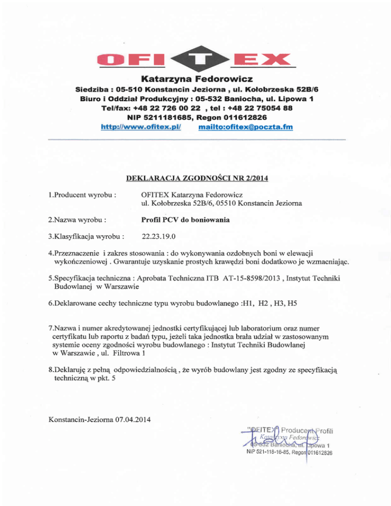 E>< FI Katarzyna Fedorowicz Siedziba : 05-51O Konstancin Jeziorna , ul. Kolobrzeska'528/6 Biuro i Oddzial Produkcyjny: O5-532 Baniocha, ul. Lipowa I Tel/fax: +48 22 726 OO 22 , tel r +48 22 75054 88 NIP 5211'181685, Regon 011612826 mai lto:[email protected] DEKLARACJ A ZGODNOSfl NR 2/2014 l.Producent wyrobu 2.Nazwa wyrobu : OFITEX Katarzyna Fedorowicz ul. Kolobrz eska 528 I 6.'0 5 5 I 0 Konstancin J eziorna Profil PCV do boniowania : 3.Klasyfikacja wyrobu : 22.23.19.0 4.Przeznaczenie i zakres stosowania : do wykonywania ozdobnych boni w elewacji wykoriczeniowej . Gwarantuje uzyskanie prostych krawEdzi boni dodatkowo je wzmacniajqc. 5.Specyfikacja techniczna i Aprobata Techniczna Budowlanej w Warszawie ITB AT-15-859812013, Instytut Techniki 6.Deklarowane cechy techniczne typu wyrobu budowlanego :H1, H2 ,H3,H5 T.Nazwa i numer akredytowanej jednostki certyfikuj4cej lub laboratorium oraz numer certyfikatu lub raportu zbadafitypu, jezeli taka jednostkabraNatdziaN w zastosowanym systemie oceny zgodnoSci wyrobu budowlanego : Instytut Techniki Budowlanej w Warszawie , ul. Filtrowa 1 8.DeklarujE z pelnq odpowiedzialnoSciq , 2e wyr6b budowlany jest zgodny ze specyfikacj4 technicznqw pkt. 5 Konstancin -J ezioma 07 .0 4.20 I 4 :11-84') Prociuce rofili KclJt[Ht'nfl f:edor, NtP 521-1 1 8-1 6-85, Regonl0l 1 61 2826
