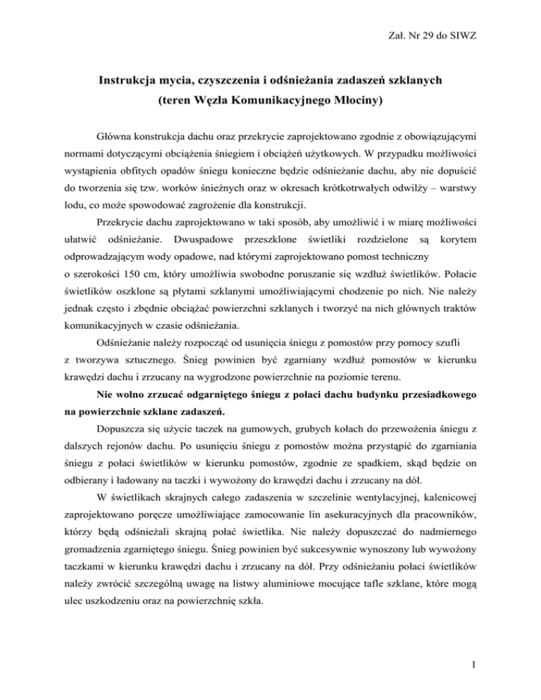 Zał. Nr 29 do SIWZ Instrukcja mycia, czyszczenia i odśnieżania zadaszeń szklanych (teren Węzła Komunikacyjnego Młociny) Główna konstrukcja dachu oraz przekrycie zaprojektowano zgodnie z obowiązującymi normami dotyczącymi obciążenia śniegiem i obciążeń użytkowych. W przypadku możliwości wystąpienia obfitych opadów śniegu konieczne będzie odśnieżanie dachu, aby nie dopuścić do tworzenia się tzw. worków śnieżnych oraz w okresach krótkotrwałych odwilży – warstwy lodu, co może spowodować zagrożenie dla konstrukcji. Przekrycie dachu zaprojektowano w taki sposób, aby umożliwić i w miarę możliwości ułatwić odśnieżanie. Dwuspadowe przeszklone świetliki rozdzielone są korytem odprowadzającym wody opadowe, nad którymi zaprojektowano pomost techniczny o szerokości 150 cm, który umożliwia swobodne poruszanie się wzdłuż świetlików. Połacie świetlików oszklone są płytami szklanymi umożliwiającymi chodzenie po nich. Nie należy jednak często i zbędnie obciążać powierzchni szklanych i tworzyć na nich głównych traktów komunikacyjnych w czasie odśnieżania. Odśnieżanie należy rozpocząć od usunięcia śniegu z pomostów przy pomocy szufli z tworzywa sztucznego. Śnieg powinien być zgarniany wzdłuż pomostów w kierunku krawędzi dachu i zrzucany na wygrodzone powierzchnie na poziomie terenu. Nie wolno zrzucać odgarniętego śniegu z połaci dachu budynku przesiadkowego na powierzchnie szklane zadaszeń. Dopuszcza się użycie taczek na gumowych, grubych kołach do przewożenia śniegu z dalszych rejonów dachu. Po usunięciu śniegu z pomostów można przystąpić do zgarniania śniegu z połaci świetlików w kierunku pomostów, zgodnie ze spadkiem, skąd będzie on odbierany i ładowany na taczki i wywożony do krawędzi dachu i zrzucany na dół. W świetlikach skrajnych całego zadaszenia w szczelinie wentylacyjnej, kalenicowej zaprojektowano poręcze umożliwiające zamocowanie lin asekuracyjnych dla pracowników, którzy będą odśnieżali skrajną połać świetlika. Nie należy dopuszczać do nadmiernego gromadzenia zgarniętego śniegu. Śnieg powinien być sukcesywnie wynoszony lub wywożony taczkami w kierunku krawędzi dachu i zrzucany na dół. Przy odśnieżaniu połaci świetlików należy zwrócić szczególną uwagę na listwy aluminiowe mocujące tafle szklane, które mogą ulec uszkodzeniu oraz na powierzchnię szkła. 1 Zał. Nr 29 do SIWZ Do odśnieżania należy używać narzędzi bez ostrych i twardych krawędzi, czyli: - szufle z tworzywa sztucznego, - szczotki do zamiatania z włosiem z tworzywa sztucznego, - taczki jednokołowe ze skrzynią z tworzywa sztucznego (koło z oponą gumową), - wózki dwukołowe ze skrzynia z tworzywa sztucznego (koła z oponą gumową). Pracownicy wchodzący na dach muszą być wyposażeni w buty na miękkich gumowych podeszwach bez metalowych okuć. Podczas odśnieżania połaci świetlików zabronione jest skuwanie oraz skrobanie oblodzeń, usuwany powinien być tylko śnieg. Oblodzenia należy pozostawić do naturalnego rozpuszczenia. Pomosty techniczne zaprojektowano w taki sposób, aby możliwe było zdejmowanie krat pomostowych, co pozwoli na czyszczenie i konserwacje koryt odwadniających w okresach letnich. Z pomostów technicznych będzie można spłukiwać i myć połacie świetlików. 2