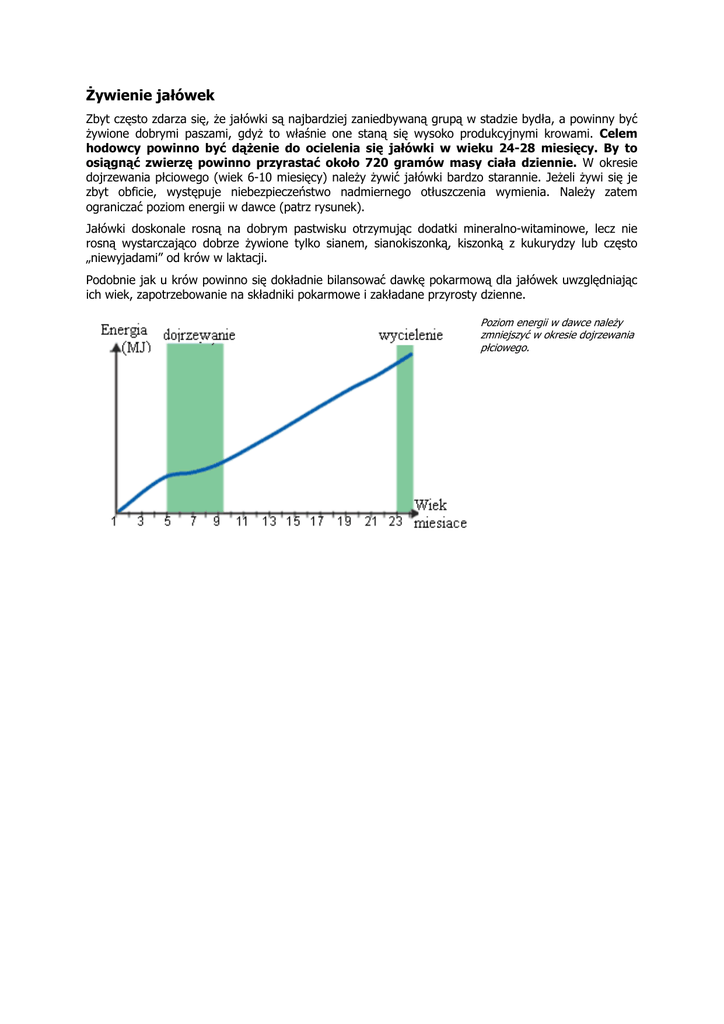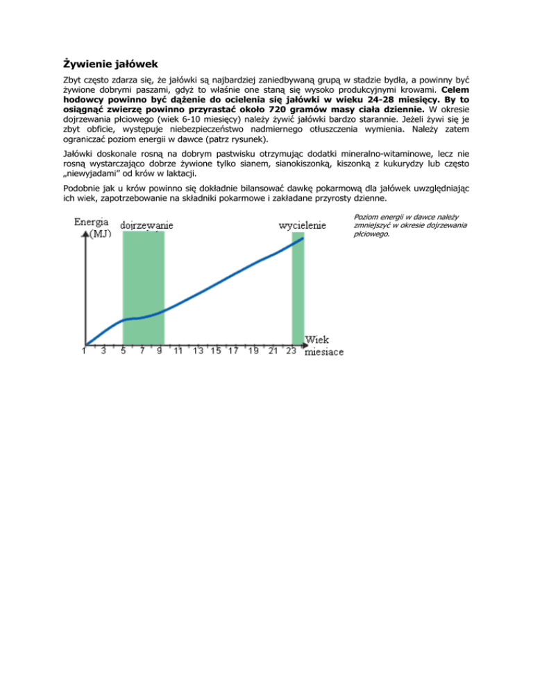 Żywienie jałówek Zbyt często zdarza się, że jałówki są najbardziej zaniedbywaną grupą w stadzie bydła, a powinny być żywione dobrymi paszami, gdyż to właśnie one staną się wysoko produkcyjnymi krowami. Celem hodowcy powinno być dążenie do ocielenia się jałówki w wieku 24-28 miesięcy. By to osiągnąć zwierzę powinno przyrastać około 720 gramów masy ciała dziennie. W okresie dojrzewania płciowego (wiek 6-10 miesięcy) należy żywić jałówki bardzo starannie. Jeżeli żywi się je zbyt obficie, występuje niebezpieczeństwo nadmiernego otłuszczenia wymienia. Należy zatem ograniczać poziom energii w dawce (patrz rysunek). Jałówki doskonale rosną na dobrym pastwisku otrzymując dodatki mineralno-witaminowe, lecz nie rosną wystarczająco dobrze żywione tylko sianem, sianokiszonką, kiszonką z kukurydzy lub często „niewyjadami” od krów w laktacji. Podobnie jak u krów powinno się dokładnie bilansować dawkę pokarmową dla jałówek uwzględniając ich wiek, zapotrzebowanie na składniki pokarmowe i zakładane przyrosty dzienne. Poziom energii w dawce należy zmniejszyć w okresie dojrzewania płciowego.