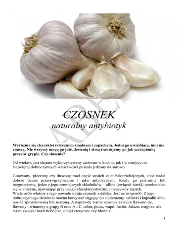 CZOSNEK naturalny antybiotyk Wyróżnia się charakterystycznym smakiem i zapachem. Jedni go uwielbiają, inni nie znoszą. Nie wszyscy mogą go jeść. Jesienią i zimą traktujemy go jak szczepionkę przeciw grypie. Czy słusznie? Od wieków jest chętnie wykorzystywany zarówno w kuchni, jak i w medycynie. Najwięcej dobroczynnych właściwości posiada jedzony na surowo. Gotowany, pieczony czy duszony traci część swoich zalet bakteriobójczych, choć nadal dobrze działa przeciwgrzybicznie i jako antyoksydant. Kiedy go pokroimy lub rozgnieciemy, jeden z jego cenniejszych składników – allina (związek siarki) przekształca się w allicynę, ujawniając przy okazji charakterystyczny, intensywny zapach. Wiele osób właśnie z tego powodu omija czosnek z daleka. Jest na to sposób. Z jego dobroczynnego działania można korzystać sięgając po suplementy: tabletki i kapsułki albo postać sproszkowaną lub suszoną. A naprawdę warto: czosnek zawiera flawonoidy, flawony i witaminy z grupy B oraz A i C, selen, potas, wapń, fosfor, żelazo, magnez, ale także związki bakteriobójcze, olejki eteryczne czy błonnik. 1 Uniwersalne lekarstwo Należy do tych roślin, które w naturalny sposób wzmacniają układ immunologiczny. Polega to na aktywizacji białych krwinek (leukocytów) do obrony przed zarazkami. Dlatego, gdy pojawiają się pierwsze symptomy przeziębienia lub kaszel, dobrze wspomóc się właśnie czosnkiem, bo wykazuje działanie antyseptyczne, wykrztuśne i napotne. Działa jak naturalny antybiotyk: zwalcza bakterie chorobotwórcze w układzie oddechowym, ale także pokarmowym. Warto też wymienić jego korzystne działanie polegające na wspomaganiu metabolizmu tłuszczów, działaniu żółciopędnym i regulującym trawienie. Bywa pomocy przy różnego rodzaju nieżytach żołądka, zwłaszcza związanych z upośledzeniem wytwarzania żółci. Dodatkowo czosnek przeciwdziała pasożytom przewodu pokarmowego i oczyszcza drogi moczowe. Dzieje się tak, bo potrafi niszczyć bakterie oporne na antybiotyki. Stosowany jest również w przypadkach występowania owsików, zwłaszcza u dzieci. Najskuteczniejsze są wtedy lewatywy z sokiem lub wyciągiem z czosnku. Pogromca złego cholesterolu Szczególnie ceniony jest jednak za obniżanie złego poziomu cholesterolu (LDL) we krwi, przy jednoczesnym podwyższaniu poziomu tego dobrego (HDL). Ten zły cholesterol jest produkowany w nadmiarze w wątrobie, na skutek zaburzeń trawienia i niezdrowej diety i jest odpowiedzialny za tworzenie się złogów, które czopują naczynia krwionośnie, tworzą płytki miażdżycowe i mogą prowadzić do choroby niedokrwiennej serca. Systematycznie spożywany czosnek, może według różnych szacunków badaczy, obniżyć poziom cholesterolu o ok. 10 proc. Czosnek korzystnie wpływa zatem na serce, ale także na cały układ krwionośny. Poprawia krążenie krwi i sprzyja rozszerzeniu naczyń krwionośnych, a więc obniża ciśnienie krwi. Ma również wpływ na niższy poziom trójglicerydów, których zbyt duże stężenie we krwi zwiększa ryzyko zawału serca. Naukowcy twierdzą, że za te wszystkie dobroczynne właściwości odpowiedzialna jest allina. To związek siarki, który podczas miażdżenia ząbków czosnku, przekształca się w allicynę, która ochrania serce i działa jak antybiotyk. Czosnek może działać podobnie jak aspiryna i hamować proces tworzenia się zakrzepów. Z obserwacji wynika, że w krajach, gdzie odnotowano wysokie spożycie czosnku, występuje mniej problemów z chorobami serca. 2 Na co jeszcze jest dobry? Warto wymienić też ochronę organizmu przed działaniem szkodliwych substancji, jakimi są wolne rodniki, czyli produkty uboczne procesu utleniania. To właśnie one w znacznym stopniu są odpowiedzialne za szybsze starzenie się komórek naszego ciała. Pojawiają się także prace sugerujące, że czosnek potrafi hamować zmiany komórkowe prowadzące do rozwoju nowotworu lub nawet niszczyć wykształcone komórki rakowe. Jego zastosowanie badane jest również w przypadku reumatoidalnego zapalenia stawów. Chyba rzadziej niż kiedyś, stosuje się czosnek także zewnętrznie, w takich przypadkach, jak leczenie trudno gojących się ran czy wystąpienia grzybicy stóp. Ile ząbków na ząb? W celach zdrowotnych zaleca się spożywać jeden duży ząbek czosnku dziennie. Można go wtedy traktować jako aromatyczną przyprawę, która poprawia i zaostrza smak potraw. Wystarczy go posiekać i dodać do kanapek, rozetrzeć jako składnik sosu do sałaty, udusić czy upiec razem z mięsem. Można też przyrządzić napój ze zmiażdżonego ząbka czosnku, mleka oraz miodu. A dla tych, którzy z trudem tolerują jego aromat, dobra rada - aby zneutralizować nieprzyjemny zapach, można dodać do jedzenia świeżą natkę pietruszki, tymianek czy miętę. Inne sprawdzone sposoby, to jedzenie czosnku lub łykanie go pod postacią olejowego wyciągu w kapsułkach tuż przed snem. Profilaktycznie polecana dzienna dawka wynosi: 350 mg dla dzieci i 500 mg dla dorosłych. Ale kiedy dorośli przyjmują czosnek podczas kuracji, dawka wzrasta do 10005000 mg. Nie dla każdego Pamiętajmy jednak, że rośliny mogą również bardzo silnie działać. I nawet wówczas, gdy wykazują działania prozdrowotne i lecznicze, mogą też uczulać, wchodzić w złe interakcje z innymi farmaceutykami czy podrażniać. Czosnek odznacza się właśnie takim silnym smakiem i działaniem. Dlatego nie powinny go jeść osoby cierpiące na ostre nieżyty żołądka i jelit, z niskim ciśnieniem krwi (obniża ciśnienie krwi) oraz kobiety karmiące piersią. Trzeba także pamiętać, że czosnek może nasilać działanie leków przeciwzakrzepowych. Do znanych właściwości czosnku należy również obniżanie stężenia cukru we krwi. Z tego powodu jego spożywanie powinny kontrolować osoby ze skłonnością do hipoglikemii (czyli niedocukrzenia, gdy poziom glukozy we krwi spada poniż