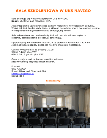 SALA SZKOLENIOWA W UKS NAVIGO Sala znajduje się w klubie żeglarskim UKS NAVIGO, Sopot, ul. Bitwy pod Płowcami 67A. Jest przepięknie usytuowana nad samym morzem w nowoczesnym budynku. Wokół sali jest bardzo duży taras, z którego do wyboru może być osobne wejście. W bezpośrednim sąsiedztwie klubu znajdują się hotele. Sala szkoleniowa ma powierzchnię 116 m2 oraz dodatkowo zaplecze (szatnia, pomieszczenie do obsługi cateringu). Dysponujemy 80 krzesłami typu ISO i 16 stołami o wymiarach 180 x 80. Jest możliwość podziału dużej sali na dwie mniejsze niezależne. Cennik wynajmu sali do godziny 21.00. 900 zł / dzień plus VAT 450 zł / do 5 godzin plus VAT Ceny wynajmu sali na imprezy okolicznościowe, zabawy według indywidualnych ustaleń. Kontakt: UKS NAVIGO Sopot, Bitwy pod Płowcami 67A [email protected] 503114384 Zapraszamy!