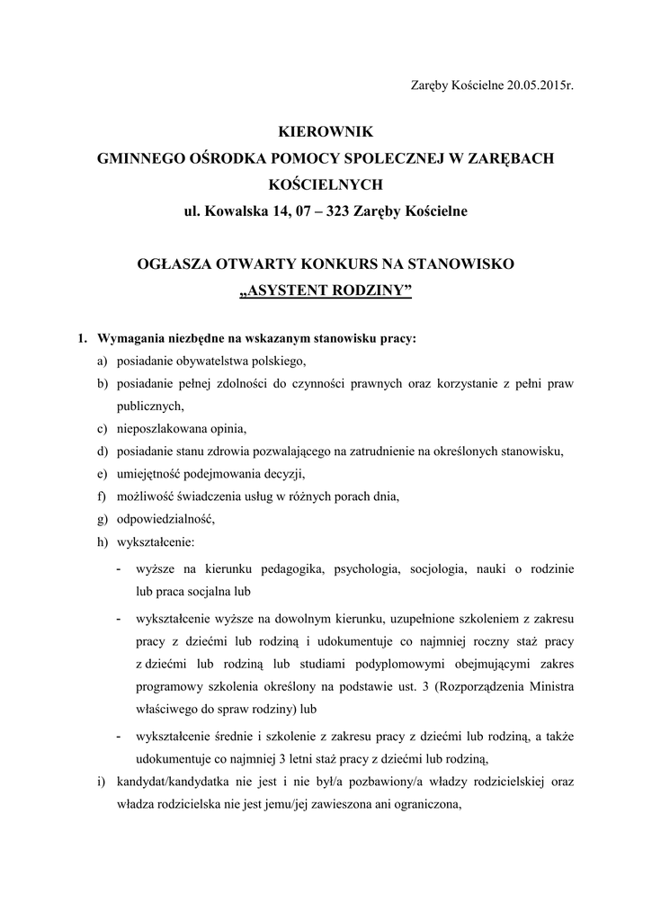 Zaręby Kościelne 20.05.2015r. KIEROWNIK GMINNEGO OŚRODKA POMOCY SPOLECZNEJ W ZARĘBACH KOŚCIELNYCH ul. Kowalska 14, 07 – 323 Zaręby Kościelne OGŁASZA OTWARTY KONKURS NA STANOWISKO „ASYSTENT RODZINY” 1. Wymagania niezbędne na wskazanym stanowisku pracy: a) posiadanie obywatelstwa polskiego, b) posiadanie pełnej zdolności do czynności prawnych oraz korzystanie z pełni praw publicznych, c) nieposzlakowana opinia, d) posiadanie stanu zdrowia pozwalającego na zatrudnienie na określonych stanowisku, e) umiejętność podejmowania decyzji, f) możliwość świadczenia usług w różnych porach dnia, g) odpowiedzialność, h) wykształcenie: - wyższe na kierunku pedagogika, psychologia, socjologia, nauki o rodzinie lub praca socjalna lub - wykształcenie wyższe na dowolnym kierunku, uzupełnione szkoleniem z zakresu pracy z dziećmi lub rodziną i udokumentuje co najmniej roczny staż pracy z dziećmi lub rodziną lub studiami podyplomowymi obejmującymi zakres programowy szkolenia określony na podstawie ust. 3 (Rozporządzenia Ministra właściwego do spraw rodziny) lub - wykształcenie średnie i szkolenie z zakresu pracy z dziećmi lub rodziną, a także udokumentuje co najmniej 3 letni staż pracy z dziećmi lub rodziną, i) kandydat/kandydatka nie jest i nie był/a pozbawiony/a władzy rodzicielskiej oraz władza rodzicielska nie jest jemu/jej zawieszona ani ograniczona, j) kandydat/kandydatka wypełnia obowiązek alimentacyjny – w przypadku gdy taki obowiązek w stosunku do niej wynika z tytułu egzekucyjnego, k) kandydat/kandydatka nie był/a skazana prawomocnym wyrokiem za umyślne przestępstwo lub umyślne przestępstwo skarbowe. 2. Wymagania dodatkowe: a) mile widziany ukończony kurs – „Asystent rodziny”, b) znajomości obsługi komputera i programów biurowych, c) wiedza i doświadczenie w zakresie prawidłowego funkcjonowania rodziny, d) znajomość lokalnego środowiska oraz umiejętności nawiązywania współpracy z jednostkami i instytucjami pomocy społecznej, e) samodzielność w działaniu oraz wykazywanie własnej inicjatywy, f) komunikatywność, empatia, zaangażowanie, asertywność, g) umiejętność pracy w zespole, h) umiejętność pracy z rodziną, w szczególności z rodziną trudną, i) doświadczenie w sprawach opiekuńczo – wychowawczych i prowadzenia gospodarstwa domowego, j) odporność na sytuacje stresowe, k) umiejętność zachowania bezstronności w kontakcie z rodziną, l) prawo jazdy kat. „B” i posiadanie własnego środka transportu, m) znajomość przepisów ustawy z dnia 12 marca 2004 r. o pomocy społecznej, ustawy z dnia 9 czerwca 2011r. o wspieraniu rodziny i systemie pieczy zastępczej i innych aktów normatywnych związanych z pomocą społeczną. 3. Zakres wykonywanych zadań i obowiązków na wskazanym stanowisku pracy: Zadaniem asystenta rodziny będzie pomoc rodzinie we wdrażaniu prawidłowych postaw życiowych wszystkich jej członków. Asystent rodzinny współdziała z rodziną przy realizacji zawartego kontraktu socjalnego. Usługa asystenta prowadzona będzie w celu zdobycia przez rodziny kompetencji w zakresie pełnienia ról społecznych. Asystent rodziny będzie świadczył pomoc rodzinie w zakresie prawidłowego prowadzenia gospodarstwa domowego, opieki nad dzieckiem/dziećmi, gospodarowania budżetem domowym, załatwiania spraw urzędowych, wsparcia i aktywizacji rodzin zagrożonych wykluczeniem społecznym oraz kierowanie procesem zmiany postaw życiowych członków rodziny. Asystent rodziny odpowiedzialny będzie za systematyczną indywidualną pracę z rodzinami wskazanymi przez Ośrodek, udzielanie im kompleksowej pomocy i wsparcia w wypełnianiu swoich zadań. W tym celu asystent rodziny będzie: - współpracował z instytucjami takimi jak szkoła, przedszkole, sąd, urząd pracy, urząd gminy, itp., - pomagał w wypełnianiu zadań opiekuńczo – wychowawczych, - pomagał i uczył oszczędnego zarządzania budżetem domowym, - merytorycznie pomagał w prowadzeniu gospodarstwa domowego, - pomagał w rozwiązywaniu podstawowych problemów socjalnych rodziny, wspierał jej aktywność społeczną, - motywował do podnoszenia kwalifikacji zawodowych przez poszczególnych członków rodziny. Asystent rodziny świadczyć będzie usługi w miejscu zamieszkania rodziny między godziną 800 a 2100, może również towarzyszyć rodzinie poza miejscem zamieszkania między godziną 800 a 2100 w dni robocze oraz w dni wolne od pracy, również w weekendy w wymiarze nieprzekraczającym 40 godzin tygodniowo – zgodnie z harmonogramem usług ustalonym wspólnie z pracownikiem socjalnym w porozumieniu z rodziną. 4. Wymagane dokumenty: a) CV, b) list motywacyjny, c) kopie dokumentów potwierdzających wykształcenie, d) kopie dokumentów poświadczających posiadanie kwalifikacji zawodowych (certyfikaty, uprawnienia, zaświadczenia o ukończeniu kursów i szkoleń, dyplomy), e) kopie świadectw pracy, ewentualnie referencje z zakładów pracy, f) zaświadczenie o stanie zdrowia pozwalającym na zatrudnienie na danym stanowisku, g) oświadczenie kandydata/kandydatki o korzystaniu z pełni praw publicznych, h) oświadczenie o niekaralności za przestępstwo popełnione umyślnie lub umyślnie przestępstwo skarbowe (w przypadku podpisania umowy kandydat/kandydatka zostanie zobowiązany/zobowiązana do dostarczenia zaświadczenia z Krajowego Rejestru Karnego), i) oświadczenie, że kandydat nie jest i nie był pozbawiony władzy rodzicielskiej oraz władza rodzicielska nie została mu zawieszona ani ograniczona, j) oświadczenie, że kandydat wypełnia obowiązek alimentacyjny, w przypadku, gdy taki obowiązek został nałożony na podstawie tytułu wykonawczego pochodzącego lub zatwierdzonego przez sąd, k) pisemne oświadczenie o przystąpieniu do konkursu z klauzulą o treści: „Wyrażam zgodę na przetwarzanie moich danych osobowych zawartych w ofercie pracy dla potrzeb niezbędnych do realizacji pr