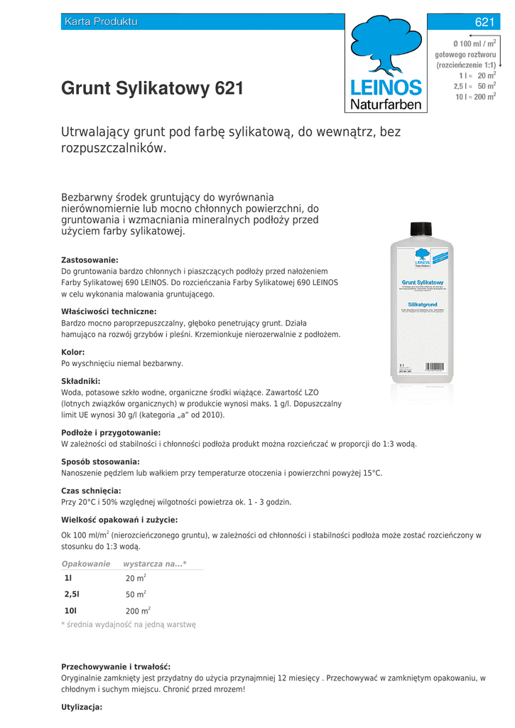 621 Grunt Sylikatowy 621 Utrwalający grunt pod farbę sylikatową, do wewnątrz, bez rozpuszczalników. Bezbarwny środek gruntujący do wyrównania nierównomiernie lub mocno chłonnych powierzchni, do gruntowania i wzmacniania mineralnych podłoży przed użyciem farby sylikatowej. Zastosowanie: Do gruntowania bardzo chłonnych i piaszczących podłoży przed nałożeniem Farby Sylikatowej 690 LEINOS. Do rozcieńczania Farby Sylikatowej 690 LEINOS w celu wykonania malowania gruntującego. Właściwości techniczne: Bardzo mocno paroprzepuszczalny, głęboko penetrujący grunt. Działa hamująco na rozwój grzybów i pleśni. Krzemionkuje nierozerwalnie z podłożem. Kolor: Po wyschnięciu niemal bezbarwny. Składniki: Woda, potasowe szkło wodne, organiczne środki wiążące. Zawartość LZO (lotnych związków organicznych) w produkcie wynosi maks. 1 g/l. Dopuszczalny limit UE wynosi 30 g/l (kategoria „a” od 2010). Podłoże i przygotowanie: W zależności od stabilności i chłonności podłoża produkt można rozcieńczać w proporcji do 1:3 wodą. Sposó b stosowania: Nanoszenie pędzlem lub wałkiem przy temperaturze otoczenia i powierzchni powyżej 15°C. Czas schnięcia: Przy 20°C i 50% względnej wilgotności powietrza ok. 1 - 3 godzin. Wielkość opakowań i zużycie: Ok 100 ml/m2 (nierozcieńczonego gruntu), w zależności od chłonności i stabilności podłoża może zostać rozcieńczony w stosunku do 1:3 wodą. Opakowanie wystarcza na...* 1l 20 m2 2,5l 50 m2 10l 200 m2 * średnia wydajność na jedną warstwę Przechowywanie i trwałość: Oryginalnie zamknięty jest przydatny do użycia przynajmniej 12 miesięcy . Przechowywać w zamkniętym opakowaniu, w chłodnym i suchym miejscu. Chronić przed mrozem! Utylizacja: Zgodnie z lokalnymi, urzędowymi przepisami. Europejski kod odpadu EWC: 08 01 03. Środki rozcieńczające i czyszczące: Produkt jest już gotowy do użycia. Czyszczenie wodą i Mydłem Roślinnym 930 LEINOS. GISCODE: M-SK01 Zwroty wskazujące środki ostrożności: Karta Charakterystyki dostępna na życzenie. Chronić przed dziećmi. Unikać uwolnienia do środowiska. Zawartość/pojemnik usuwać zgodnie z lokalnymi przepisami. Aby osiągnąć optymalne wyniki należy przestrzegać zaleceń Kart Produktów wszystkich stosowanych produktów. Informacje opierają się na aktualnym stanie naszej wiedzy i doświadczeń. Nie stanowią jednak zapewnienia o właściwościach produktu i nie mają skutku prawnego umowy. Wraz z ukazaniem się tej Karty Produktu wszystkie poprzednie informacje tracą swoją ważność. Stan: 03.03.2017 Dystrybutor: AMBIENTE • Tomasz Szczepański • ul. Reymonta 12 • 48-370 Paczków tel./faks: +48(0)77/43175 23 • [email protected] • www.LEINOS.pl Producent: LEINOS • Reincke Naturfarben GmbH • Rudolf-Diesel-Straße 4 • 21614 Buxtehude, Germany Tel. +49 (0) 41 61 - 99 45 40 • www.LEINOS.de • [email protected]