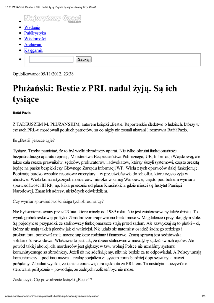 13.11.2012 Płużański: Bestie z PRL nadal ży ją. Są ich ty siące - Najwy ższy Czas! Wydanie Publicystyka Wiadomości Archiwum Księgarnia Szukaj Opublikowano: 05/11/2012, 23:38 Płużański: Bestie z PRL nadal żyją. Są ich tysiące Rafal Pazio Z TADEUSZEM M. PŁUŻAŃSKIM, autorem książki „Bestie. Reporterskie śledztwo o ludziach, którzy w czasach PRL-u mordowali polskich patriotów, za co nigdy nie zostali ukarani”, rozmawia Rafał Pazio. Ile „Bestii” jeszcze żyje? Tysiące. Trzeba pamiętać, że to był wielki zbrodniczy aparat. Nie tylko okrutni funkcjonariusze bezpośredniego aparatu represji, Ministerstwa Bezpieczeństwa Publicznego, UB, Informacji Wojskowej, ale także cała rzesza prawników, sędziów, prokuratorów i adwokatów, którzy służyli systemowi, często zresztą będąc na pasku bezpieki czy Głównego Zarządu Informacji WP. Wielu z tych oprawców dalej funkcjonuje. Pobierają bardzo wysokie resortowe emerytury – w przeciwieństwie do ich ofiar, które często żyją w ubóstwie. Wielu komunistycznych morderców mieszka w samej Warszawie, często pod bokiem wymiaru sprawiedliwości III RP, np. kilka przecznic od placu Krasińskich, gdzie mieści się Instytut Pamięci Narodowej. Znam ich adresy, niektórych odwiedziłem. Czy wymiar sprawiedliwości ściga tych zbrodniarzy? Nie był zainteresowany przez 23 lata, które minęły od 1989 roku. Nie jest zainteresowany także dzisiaj. To wynik grubokreskowej polityki. Zbrodniarzom zapewniono bezkarność w Magdalence i przy okrągłym stole. Są pojedyncze przypadki, że stalinowscy funkcjonariusze stają przed sądem. Ale zazwyczaj są to płotki – ci, którzy nie mają takich pleców jak ci ważniejsi. Nie udało się natomiast osądzić żadnego sędziego i prokuratora, ponieważ mają mocne zaplecze rodzinne i finansowe. Znaną sprawą jest sędziowska solidarność zawodowa. Właściwie to jest tak, że dzieci stalinowców musiałyby sądzić swoich ojców. Ale powód takiej abolicji dla morderców jest głębszy: w tzw. wolnej Polsce nie uznaliśmy systemu komunistycznego za zbrodniczy. Jeżeli zła nie zdefiniujemy, nikt nie będzie za to odpowiadał. A Polacy uznają komunizm czy – pod inną nazwą – realny socjalizm za system coraz bardziej dopuszczalny, a nawet pożądany. Z badań wynika, że istnieje coraz większa tęsknota za PRL-em. Ta nostalgia – oczywiście sterowana politycznie – powoduje, że żadnych rozliczeń być nie może. Zaskoczyło Cię powodzenie książki „Bestie”? nczas.com/wiadomosci/polska/pluzanski-bestie-z-prl-nadal-zy ja-sa-ich-ty siace/ 1/5 13.11.2012 Płużański: Bestie z PRL nadal ży ją. Są ich ty siące - Najwy ższy Czas! Sukces jest pojęciem względnym, ale nie spodziewałem się, że ta książka znajdzie aż tylu czytelników. W tej chwili sprzedało się około 10 tys. egzemplarzy. Co jak na polski rynek jest pewnym osiągnięciem, szczególnie że tematyka jest dosyć hermetyczna. Wiadomo, że historia, przynajmniej w obiegowej opinii, nie sprzedaje się najlepiej. Podobno Polacy mają dosyć mówienia o przeszłości, mają patrzeć w przyszłość. Okazuje się jednak, że to nieprawda, że zainteresowanie przeszłością istnieje. Historia powojenna jest nieznana i ludzie mają potrzebę wiedzy. A wielu przystępnie napisanych pozycji na ten temat nie ma. Dodatkowo „Bestie” nie są książką tylko historyczną, bo opisywane tu sprawy mają ogromny związek z dzisiejszymi czasami. Często na spotkaniach autorskich pada pytanie, czemu nie zajmę się czasami bardziej współczesnymi, późniejszym PRL-em. Odpowiadam wtedy, że lata 1944-1945 to geneza tego, co mieliśmy przez kolejne ponad 40 lat komuny, i tego, co mamy dziś. To książka, w której próbuję dać odpowiedź, dlaczego III RP jest kontynuacją PRL-u. Czy „Bestie” to próba walki o świadomość historyczną Polaków? Zacznijmy od tego, że „Bestie” nie stanowią zbioru dokumentów z komentarzem, ale to są tzw. żywe historie. Książka jest reporterską opowieścią o ludziach stojących po dwóch stronach barykady. Z jednej strony mamy polskich patriotów, którzy mieli w sercu wolność i niepodległość, a z drugiej tych, którzy tę niepodległość chcieli zlikwidować. Czyli właśnie bestie służące imperium Stalina. Pokazuję historię ich życia, tłumaczę, skąd ci ludzie się wzięli, jakie cele im przyświecały, co robili po stalinowskim okresie „błędów i wypaczeń” i jak okrągły stół zapewnił im miękkie lądowanie w dzisiejszej Polsce. W „Bestiach” mamy jasny podział na dobro i zło. A jeśli pytasz o walkę o świadomość, to oczywiście biorę w niej udział, ale nie oznacza to zaangażowania partyjnego po którejś ze stron dzisiejszego sporu. Dlatego, mimo oczywistych dla mnie sympatii politycznych, nie można mówić, że prezentuję historię prawicową czy pisowską. Bo historia nie ma dla mnie barwy politycznej. W naszym podziemiu niepodległościowym znajdowali się ludzie o różnych poglądach: piłsudczycy, endecy, chadecy, socjaliści, ludowcy. Historia powinna być przede wszystkim prawdziwa. Książka „Bestie” jest dostępna tutaj w wersji papierowej oraz tutaj jako ebook (plik PDF) (ok. 8 mb). Książka została nominowana do tegorocznej Nagrody Józefa Mackiewicza. Przeczytaj koniecznie: Stalinowskie bestie z Wronek: „W więzieniu nie ma Boga. Bogami jesteśmy my!” Poleć 13 Tw eetnij 1 0 nczas.com/wiadomosci/polska/pluzanski-bestie-z-prl-nadal-zy ja-sa-ich-ty siace/ 2/5