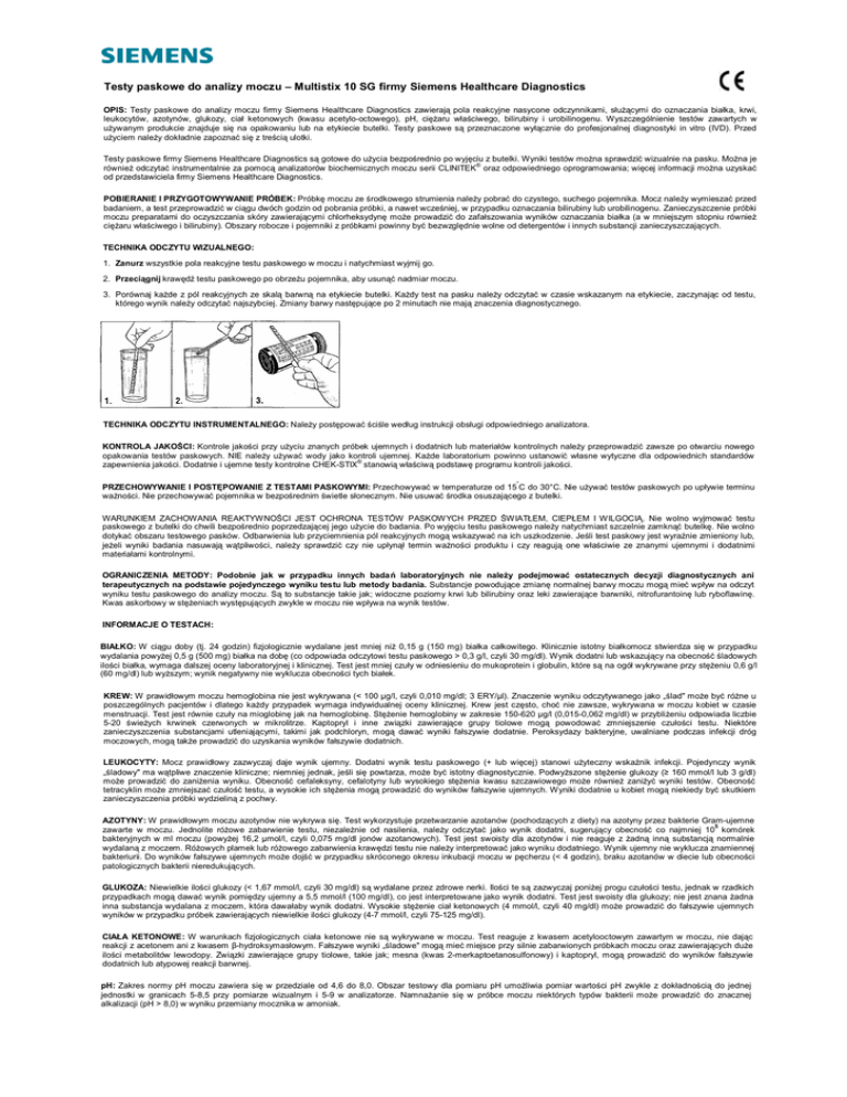 Testy paskowe do analizy moczu – Multistix 10 SG firmy Siemens Healthcare Diagnostics OPIS: Testy paskowe do analizy moczu firmy Siemens Healthcare Diagnostics zawierają pola reakcyjne nasycone odczynnikami, służącymi do oznaczania białka, krwi, leukocytów, azotynów, glukozy, ciał ketonowych (kwasu acetylo-octowego), pH, ciężaru właściwego, bilirubiny i urobilinogenu. Wyszczególnienie testów zawartych w używanym produkcie znajduje się na opakowaniu lub na etykiecie butelki. Testy paskowe są przeznaczone wyłącznie do profesjonalnej diagnostyki in vitro (IVD). Przed użyciem należy dokładnie zapoznać się z treścią ulotki. Testy paskowe firmy Siemens Healthcare Diagnostics są gotowe do użycia bezpośrednio po wyjęciu z butelki. Wyniki testów można sprawdzić wizualnie na pasku. Można je ® również odczytać instrumentalnie za pomocą analizatorów biochemicznych moczu serii CLINITEK oraz odpowiedniego oprogramowania; więcej informacji można uzyskać od przedstawiciela firmy Siemens Healthcare Diagnostics. POBIERANIE I PRZYGOTOWYWANIE PRÓBEK: Próbkę moczu ze środkowego strumienia należy pobrać do czystego, suchego pojemnika. Mocz należy wymieszać przed badaniem, a test przeprowadzić w ciągu dwóch godzin od pobrania próbki, a nawet wcześniej, w przypadku oznaczania bilirubiny lub urobilinogenu. Zanieczyszczenie próbki moczu preparatami do oczyszczania skóry zawierającymi chlorheksydynę może prowadzić do zafałszowania wyników oznaczania białka (a w mniejszym stopniu również ciężaru właściwego i bilirubiny). Obszary robocze i pojemniki z próbkami powinny być bezwzględnie wolne od detergentów i innych substancji zanieczyszczających. TECHNIKA ODCZYTU WIZUALNEGO: 1. Zanurz wszystkie pola reakcyjne testu paskowego w moczu i natychmiast wyjmij go. 2. Przeciągnij krawędź testu paskowego po obrzeżu pojemnika, aby usunąć nadmiar moczu. 3. Porównaj każde z pól reakcyjnych ze skalą barwną na etykiecie butelki. Każdy test na pasku należy odczytać w czasie wskazanym na etykiecie, zaczynając od testu, którego wynik należy odczytać najszybciej. Zmiany barwy następujące po 2 minutach nie mają znaczenia diagnostycznego. TECHNIKA ODCZYTU INSTRUMENTALNEGO: Należy postępować ściśle według instrukcji obsługi odpowiedniego analizatora. KONTROLA JAKOŚCI: Kontrole jakości przy użyciu znanych próbek ujemnych i dodatnich lub materiałów kontrolnych należy przeprowadzić zawsze po otwarciu nowego opakowania testów paskowych. NIE należy używać wody jako kontroli ujemnej. Każde laboratorium powinno ustanowić własne wytyczne dla odpowiednich standardów ® zapewnienia jakości. Dodatnie i ujemne testy kontrolne CHEK-STIX stanowią właściwą podstawę programu kontroli jakości. ° PRZECHOWYWANIE I POSTĘPOWANIE Z TESTAMI PASKOWYMI: Przechowywać w temperaturze od 15 C do 30°C. Nie używać testów paskowych po upływie terminu ważności. Nie przechowywać pojemnika w bezpośrednim świetle słonecznym. Nie usuwać środka osuszającego z butelki. WARUNKIEM ZACHOWANIA REAKTYWNOŚCI JEST OCHRONA TESTÓW PASKOWYCH PRZED ŚWIATŁEM, CIEPŁEM I WILGOCIĄ. Nie wolno wyjmować testu paskowego z butelki do chwili bezpośrednio poprzedzającej jego użycie do badania. Po wyjęciu testu paskowego należy natychmiast szczelnie zamknąć butelkę. Nie wolno dotykać obszaru testowego pasków. Odbarwienia lub przyciemnienia pól reakcyjnych mogą wskazywać na ich uszkodzenie. Jeśli test paskowy jest wyraźnie zmieniony lub, jeżeli wyniki badania nasuwają wątpliwości, należy sprawdzić czy nie upłynął termin ważności produktu i czy reagują one właściwie ze znanymi ujemnymi i dodatnimi materiałami kontrolnymi. OGRANICZENIA METODY: Podobnie jak w przypadku innych badań laboratoryjnych nie należy podejmować ostatecznych decyzji diagnostycznych ani terapeutycznych na podstawie pojedynczego wyniku testu lub metody badania. Substancje powodujące zmianę normalnej barwy moczu mogą mieć wpływ na odczyt wyniku testu paskowego do analizy moczu. Są to substancje takie jak; widoczne poziomy krwi lub bilirubiny oraz leki zawierające barwniki, nitrofurantoinę lub ryboflawinę. Kwas askorbowy w stężeniach występujących zwykle w moczu nie wpływa na wynik testów. INFORMACJE O TESTACH: BIAŁKO: W ciągu doby (tj. 24 godzin) fizjologicznie wydalane jest mniej niż 0,15 g (150 mg) białka całkowitego. Klinicznie istotny białkomocz stwierdza się w przypadku wydalania powyżej 0,5 g (500 mg) białka na dobę (co odpowiada odczytowi testu paskowego > 0,3 g/l, czyli 30 mg/dl). Wynik dodatni lub wskazujący na obecność śladowych ilości białka, wymaga dalszej oceny laboratoryjnej i klinicznej. Test jest mniej czuły w odniesieniu do mukoprotein i globulin, które są na ogół wykrywane przy stężeniu 0,6 g/l (60 mg/dl) lub wyższym; wynik negatywny nie wyklucza obecności tych białek. KREW: W prawidłowym moczu hemoglobina nie jest wykrywana (< 100 µg/l, czyli 0,010 mg/dl; 3 ERY/µl). Znaczenie wyniku odczytywanego jako „ślad" może być różne u poszczególnych pacjentów i dlatego każdy przypadek wymaga indywidualnej oceny klinicznej. Krew jest często, choć nie zawsze, wykrywana w moczu kobiet w czasie menstruacji. Test jest równie czuły na mioglobinę jak na hemoglobinę. Stężenie hemoglobiny w zakresie 150-620 µg/l (0,015-0,062 mg/dl) w przybliżeniu odpowiada liczbie 5-20 świeżych krwinek czerwonych w mikrolitrze. Kaptopryl i inne związki zawierające grupy tiolowe mogą powodować zmniejszenie czułości testu. Niektóre zanieczyszczenia substancjami utleniającymi, takimi jak podchloryn, mogą dawać wyniki fałszywie dodatnie. Peroksydazy bakteryjne, uwalniane podczas infekcji dróg moczowych, mogą także prowadzić do uzyskania wyników fałszywie dodatnich. LEUKOCYTY: Mocz prawidłowy zazwyczaj daje wynik ujemny. Dodatni wynik testu paskowego (+ lub więcej) stanowi użyteczny wsk