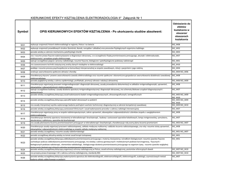 KIERUNKOWE EFEKTY KSZTAŁCENIA ELEKTRORADIOLOGIA II° Załącznik Nr 1 Symbol OPIS KIERUNKOWYCH EFEKTÓW KSZTAŁCENIA - Po ukończeniu studiów absolwent: Odniesienie do efektów kształcenia w obszarze/ obaszarach kształcenia W01 wykazuje znajomość historii elektroradiologii w regionie, Polsce i na świecie M2_W08 W02 wykazuje znajomość prawidłowych struktur (komórek, tkanek, narządów i układów) oraz procesów fizjologicznych organizmu ludzkiego. M2_W02 W03 posiada wiedzę w zakresie mechanizmu patofizjologii chorób M2_W03 M2_W07 W05 zna i rozumie prawa fizyczne wykorzystywane w diagnostyce obrazowej, a w szczególności fizykę promieniowania jonizującego, akustyki i elektroakustyki, elektryczności i przepływu prądu elektrycznego opisuje szczegółowo pojęcia i procesy radiobiologii, rozumie fizyczne, biologiczne i patofizjologiczne podstawy radioterapii W06 zna zaawansowane techniki statystycznej analizy danych niezbędne w elektroradiologii M2_W10 W07 poddaje i rozumie procesy psychospołeczne w komunikacji interpersonalnej w zespole zawodowym, relacji z pacjentem i jego rodziną M2_W04 W08 analizuje uwarunkowania społeczne zdrowia i choroby M2_W04 M2_W06 W04 W09 W10 W11 W12 M2_W01 charakteryzuj etyczne i prawne uwarunkowania zawodu elektroradiologa oraz rozumie społeczne i ekonomiczno-gospodarcze uwarunkowania działalności zawodowej M2_W08 elektroeradiologa posiada pogłębioną wiedzę z zakresu epidemiologii, profilaktyki, promocji zdrowia i edukacji zdrowotnej M2_W06 M2_W09 charakteryzuje organizację pracowni rentgenodiagnostyki i diagnostyki obrazowej, zasady prowadzenia dokumentacji w zakładzie rentgenodiagnostyki, uprawnień, obowiązków i odpowiedzialności elektroradiologa opisuje szczegółowo budowę i zasady działania aparatury rentgenodiagnostycznej i diagnostyki obrazowej, zna schematy blokowe urządzeń diagnostycznych i pomocniczych posiada wiedzę szczegółową dotyczącą zasad wykonywania badań rentgenodiagnostycznych, ultrasonograficznych, tomograficznych M2_W08 M2_W07 W15 zna zasady interpretacji wyniku wykonanego badania pod kątem wartości technicznej i diagnostycznej w zakresie kompetencji zawodowej M2_W05 M2_W09 M2_W10 M2_W05 M2_W09 M2_W10 M2_W09 M2_W10 W16 posiada wiedzę szczegółową dotyczącą zastosowań klinicznych i zasad wykonywania procedur z zakresu radiologii interwencyjnej M2_W07 charakteryzuje organizację pracy w zespole radioterapeutycznym, zakres uprawnień, obowiązków i odpowiedzialności członków zespołu z uwzględnieniem elektroradiologów charakteryzuje elementy aparatury stosowanej w teleradioterapii i brachyterapii, budowy i zastosowań aparatów kobaltowych, lampy rentgenowskiej, symulatora, akceleratora i cyklotronu, aparatów do brachyterapii zna zasady planowania leczenia promieniowaniem jonizującym w teleradioterapii i brachyterapii, charakteryzuje rolę oceny planu leczenia promieniami M2_W08 M2_W08 W21 charakteryzuje zasady organizacji pracowni radioizotopowej, zakładu medycyny nuklearnej i oddziału leczenia radioizotopowego, zna rolę i rozumie istotę uprawnień, obowiązków i odpowiedzialności elektroradiologa w zespole zakładu medycyny nuklearnej posiada wiedzę szczegółową i rozumie zasady radiofarmakologii W22 posiada szczegółową aktualną wiedzę na temat zasad terapii izotopowej M2_W01 M2_W01 W24 posiada wiedzę szczegółową dotyczącą oddziaływania promieniowania jonizującego z materią nieożywioną i ośrodkiem biologicznym: rozumie zjawiska fizyczne zachodzące podczas oddziaływania promieniowania jonizującego, ma wiedzę z zakresu genetycznych i molekularnych podstaw karcinogenezy, fizycznych i biologicznych podstaw radioterapii, elementów radiobiologii, biologicznego działania promieniowania jonizującego na organizm żywy; rozumie zjawisko względnej skuteczności biologicznej różnych rodzajów promieniowania jonizującego posiada wiedzę szczegółową dotyczącą organizacji ochrony radiologicznej w Polsce, zasad ochrony radiologicznej, poziomów referncyjnych dawek W25 zna przepisy prawa krajowego i UE z zakresu ochrony radiologicznej, standardy BSS M2_W07 M2_W10 W26 posiada wiedzę szczegółową dotyczącą wykorzystania aparatury do elektrokardiografii, elektroencefalografii, elektromiografii, audiologii, czynnościowych metod badania układu oddechowego w pediatrii M2_W07 W13 W14 W17 W18 W19 W20 W23 posiada wiedzę szczegółową dotyczącą specyfiki badań obrazowych w pediatrii M2_W07 M2_W03 M2_W07 M2_W01 M2_W07 M2_W07 M2_W10 W27 zna schematy blokowe i elementy składowe urządzeń wykorzystywanych w badaniach elektromedycznych M2_W07 W28 posiada wiedzę szczegółową dotyczącą aktów prawnych, norm i zaleceń krajowych oraz międzynarodowych w zakresie zapewnienia jakości w elektroradiologii M2_W08 M2_W07 M2_W10 W30 posiada wiedzę dotyczącą systemów zarządzania jakością, zasad audytów klinicznych w rentgenodiagnostyce, radioterapii i medycynie nuklearnej oraz testów kontroli jakości w cyfrowej rentgenodiagnostyce, mammografii, radioterapii i medycynie nuklearnej. zasad pomiarów i analizy błędów w elektroradiologii zna zasady dostosowania postępowania diagnostyczne do indywidualnego problemu pacjenta w systuacjach nietypowych W31 zna rolę elektroradiologii w ramach organizacji systemu ochrony zdrowia w Polsce M2_W09 M2_W10 W32 posiada szczegółową wiedzę o możliwości wystąpienia powikłań po radioterapii i odczynów popromiennych M2_W03 M2_W09 W33 zna zaawansowaną terminologię medyczna niezbędną do wykonywania badań i zabiegów z użyciem promieniowania jonizującego M2_W10 W34 rozumie zasady ochrony własności przemysłowej i ochrony praw autorskich M2_W11 W35 zna zasady efektywnej dezynfekcji urządzeń medycznych M2_W09 W36 zna zasady serwisowania urządzeń medycznych M2_W07 W37 zna zasady przygotowania dokumentacji w procesie zamówień publicznych M2_W07 W38 posiada szczegółową wiedzę w zakresie tworzenia, 