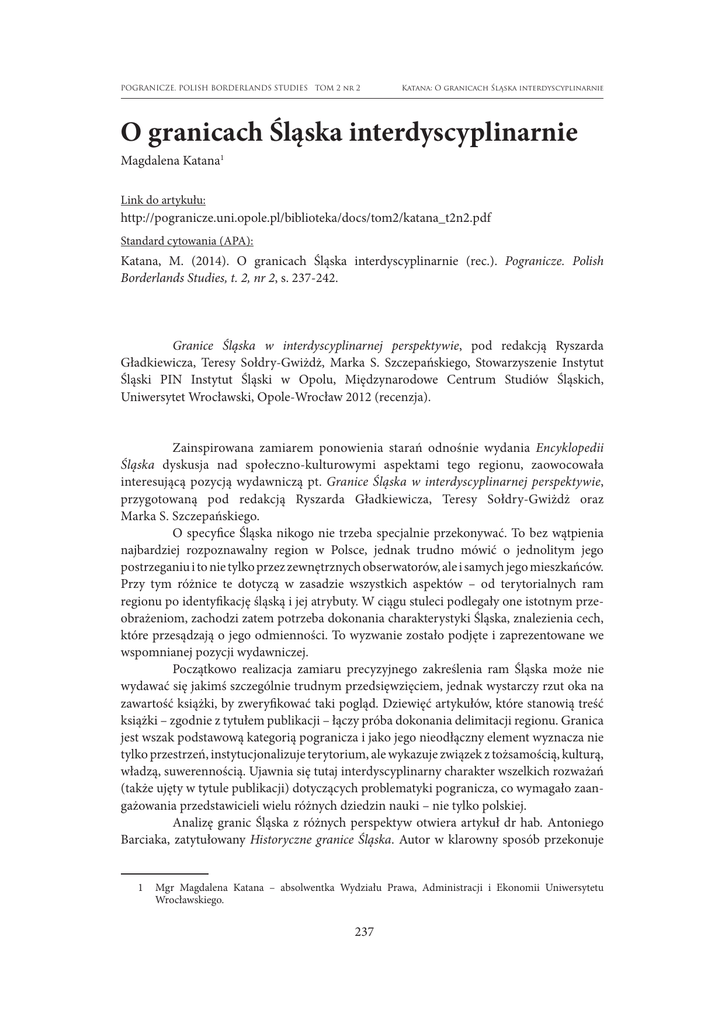 POGRANICZE. POLISH BORDERLANDS STUDIES TOM 2 nr 2 Katana: O granicach Śląska interdyscyplinarnie O granicach Śląska interdyscyplinarnie Magdalena Katana1 Link do artykułu: http://pogranicze.uni.opole.pl/biblioteka/docs/tom2/katana_t2n2.pdf Standard cytowania (APA): Katana, M. (2014). O granicach Śląska interdyscyplinarnie (rec.). Pogranicze. Polish Borderlands Studies, t. 2, nr 2, s. 237-242. Granice Śląska w interdyscyplinarnej perspektywie, pod redakcją Ryszarda Gładkiewicza, Teresy Sołdry-Gwiżdż, Marka S. Szczepańskiego, Stowarzyszenie Instytut Śląski PIN Instytut Śląski w Opolu, Międzynarodowe Centrum Studiów Śląskich, Uniwersytet Wrocławski, Opole-Wrocław 2012 (recenzja). Zainspirowana zamiarem ponowienia starań odnośnie wydania Encyklopedii Śląska dyskusja nad społeczno-kulturowymi aspektami tego regionu, zaowocowała interesującą pozycją wydawniczą pt. Granice Śląska w interdyscyplinarnej perspektywie, przygotowaną pod redakcją Ryszarda Gładkiewicza, Teresy Sołdry-Gwiżdż oraz Marka S. Szczepańskiego. O specyfice Śląska nikogo nie trzeba specjalnie przekonywać. To bez wątpienia najbardziej rozpoznawalny region w Polsce, jednak trudno mówić o jednolitym jego postrzeganiu i to nie tylko przez zewnętrznych obserwatorów, ale i samych jego mieszkańców. Przy tym różnice te dotyczą w zasadzie wszystkich aspektów – od terytorialnych ram regionu po identyfikację śląską i jej atrybuty. W ciągu stuleci podlegały one istotnym przeobrażeniom, zachodzi zatem potrzeba dokonania charakterystyki Śląska, znalezienia cech, które przesądzają o jego odmienności. To wyzwanie zostało podjęte i zaprezentowane we wspomnianej pozycji wydawniczej. Początkowo realizacja zamiaru precyzyjnego zakreślenia ram Śląska może nie wydawać się jakimś szczególnie trudnym przedsięwzięciem, jednak wystarczy rzut oka na zawartość książki, by zweryfikować taki pogląd. Dziewięć artykułów, które stanowią treść książki – zgodnie z tytułem publikacji – łączy próba dokonania delimitacji regionu. Granica jest wszak podstawową kategorią pogranicza i jako jego nieodłączny element wyznacza nie tylko przestrzeń, instytucjonalizuje terytorium, ale wykazuje związek z tożsamością, kulturą, władzą, suwerennością. Ujawnia się tutaj interdyscyplinarny charakter wszelkich rozważań (także ujęty w tytule publikacji) dotyczących problematyki pogranicza, co wymagało zaangażowania przedstawicieli wielu różnych dziedzin nauki – nie tylko polskiej. Analizę granic Śląska z różnych perspektyw otwiera artykuł dr hab. Antoniego Barciaka, zatytułowany Historyczne granice Śląska. Autor w klarowny sposób przekonuje 1 Mgr Magdalena Katana – absolwentka Wydziału Prawa, Administracji i Ekonomii Uniwersytetu Wrocławskiego. 237 POGRANICZE. POLISH BORDERLANDS STUDIES TOM 2 nr 2 Katana: O granicach Śląska interdyscyplinarnie czytelnika, że terytorialne postrzeganie regionu wymaga udziału przedstawicieli różnych dyscyplin, przy czym pierwszeństwo należy się jednak uwarunkowaniom historycznym opartym głównie na zmianach politycznej przynależności uznawanych za śląskie ziem. Antoni Barciak wiąże ustalenia historyczne (świadom braku jakichkolwiek informacji dotyczących pierwotnych granic Śląska) m.in. z geograficznymi, przyrodniczymi czy kościelno-wyznaniowymi determinantami delimitacji regionu. Podejmuje też próbę wytyczenia granicy w każdym z jej odcinków w oparciu o różnego rodzaju źródła, wskazując jednocześnie na trudności w jednoznacznym określeniu ich przebiegu oraz ich źródła. W rezultacie nakreślona struktura jawi się jako niezwykle złożona, niestabilna, niemożliwa do wyznaczenia w oparciu tylko i wyłącznie o jedno kryterium. Chodzi też nie tylko o odgraniczenie Śląska od sąsiednich państw ale i jego delimitację wewnętrzną. Brak jest, zdaniem autora, przesłanek pozwalających na stwierdzenie, że Śląsk to jedna jednostka administracyjna. Uświadamia on także czytelnikowi, że błędem byłoby oparcie rozważań na obecnym podziale administracyjnym kraju, który nie uwzględnia całkowicie Śląska. Różne jego historyczne części znajdują się w różnych krajach, a w samej Polsce ziemie uznawane za przynależne do regionu znajdują się także poza wyodrębnionymi województwami, zaś w obrębie śląskich województw znajdują się ziemie o odmiennych niż Śląsk tradycjach. Ustalenie granic Śląska poprzez badanie historycznego ich kontekstu, chociaż jest jak najbardziej uzasadnione, nie może być dokonywane bezkrytycznie z pominięciem wszelkich mających w przeszłości miejsce politycznych przeobrażeń kształtujących nie tylko ramy terytorialne regionu, ale i świadomość wyraźnej odrębności jego mieszkańców (i zróżnicowanie tej identyfikacji także wewnątrz Śląska). Autor czyni także niezwykle ważną i celną uwagę w kwestii postrzegania Śląska, mianowicie wskazuje, iż w powszechnej świadomości kojarzy się on z częścią historycznego Górnego Śląska i z aglomeracją górnośląską. Wspomniany artykuł nieprzypadkowo został zamieszczony jako pierwszy – kolejne stanowią rozwinięcie zawartych w nim myśli. Na zagadnieniu granic historycznych Śląska, a konkretnie tych znajdujących się na południu regionu, koncentrują się reprezentujący Uniwersytet w Opawie prof. Irena Korbelářová i prof. Rudolf Žáček w artykule Południowe granice Śląska. Z problematyki ewolucji przynależności krajowej czesko-śląskiego i morawsko-śląskiego pogranicza. Autorzy poddają analizie zmiany przynależności politycznej konkretnych obszarów na styku polsko-czeskim i morawskim, jak Ziemia Kłodzka, przedpola Bramy Morawskiej, okolice Opawy i Karniowa, morawskie enklawy na Śląsku, a także zmienne losy niektórych miast, takich jak: Cieszyn, Ostrawa, FrýdekMístek. Podobnie jak Antoni Barciak, Irena Korbelářov