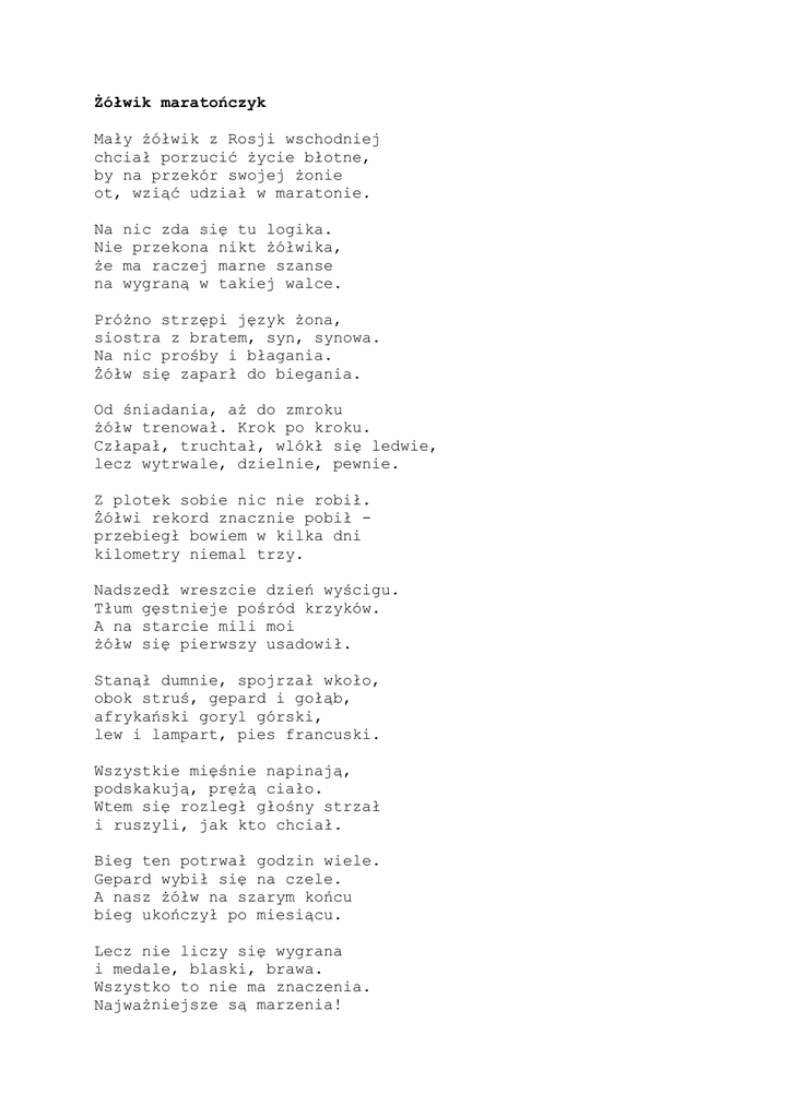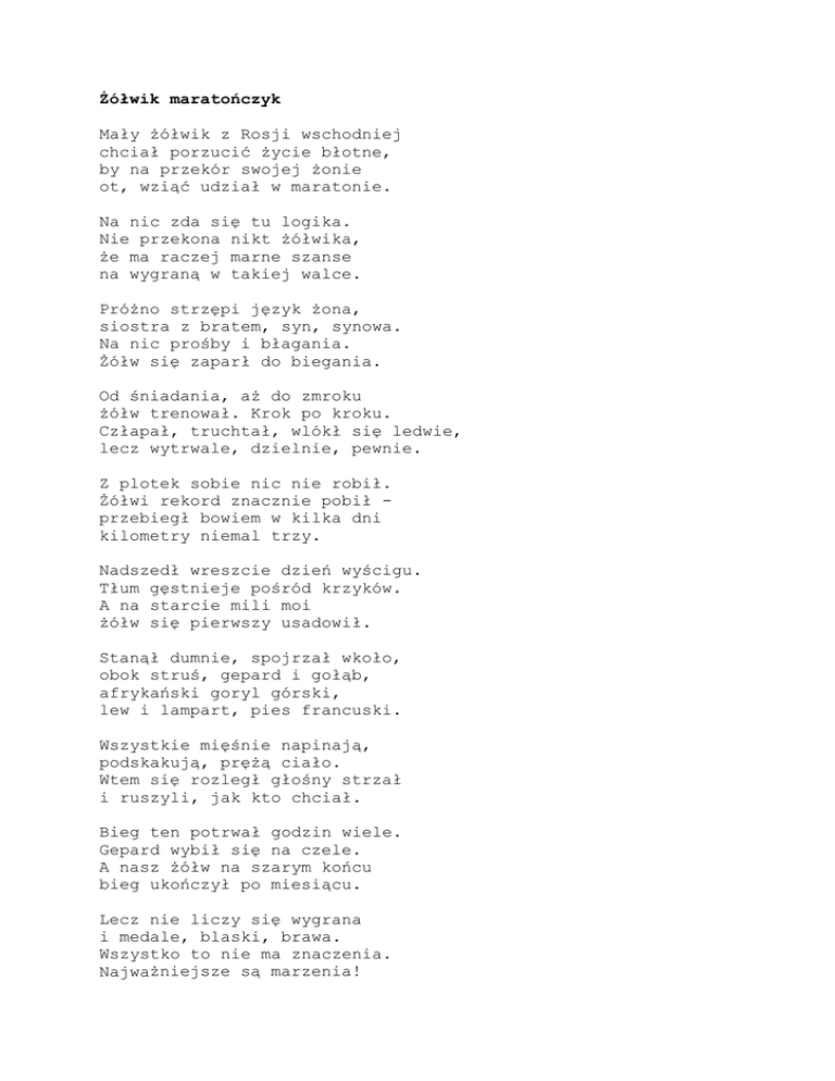 Żółwik maratończyk Mały żółwik z Rosji wschodniej chciał porzucić życie błotne, by na przekór swojej żonie ot, wziąć udział w maratonie. Na nic zda się tu logika. Nie przekona nikt żółwika, że ma raczej marne szanse na wygraną w takiej walce. Próżno strzępi język żona, siostra z bratem, syn, synowa. Na nic prośby i błagania. Żółw się zaparł do biegania. Od śniadania, aż do zmroku żółw trenował. Krok po kroku. Człapał, truchtał, wlókł się ledwie, lecz wytrwale, dzielnie, pewnie. Z plotek sobie nic nie robił. Żółwi rekord znacznie pobił przebiegł bowiem w kilka dni kilometry niemal trzy. Nadszedł wreszcie dzień wyścigu. Tłum gęstnieje pośród krzyków. A na starcie mili moi żółw się pierwszy usadowił. Stanął dumnie, spojrzał wkoło, obok struś, gepard i gołąb, afrykański goryl górski, lew i lampart, pies francuski. Wszystkie mięśnie napinają, podskakują, prężą ciało. Wtem się rozległ głośny strzał i ruszyli, jak kto chciał. Bieg ten potrwał godzin wiele. Gepard wybił się na czele. A nasz żółw na szarym końcu bieg ukończył po miesiącu. Lecz nie liczy się wygrana i medale, blaski, brawa. Wszystko to nie ma znaczenia. Najważniejsze są marzenia!