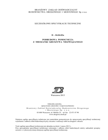 BRANŻOWY ZAKŁAD DOŚWIADCZALNY BUDOWNICTWA DROGOWEGO I MOSTOWEGO Sp. z o.o. SZCZEGÓŁOWE SPECYFIKACJE TECHNICZNE D – 04.04.02a PODBUDOWA POMOCNICZA Z MIESZANKI KRUSZYWA NIEZWIĄZANEGO Warszawa 2013 Jednostka autorska, opracowanie edytorskie i rozpowszechnienie: Branżowy Zakład Doświadczalny Budownictwa Drogowego i Mostowego Sp. z o.o. 03-808 Warszawa, ul. Mińska 25, tel./fax 22 871 87 90 www.drogowa.strefa.pl Niniejsza ogólna specyfikacja techniczna jest materiałem pomocniczym do opracowania specyfikacji technicznej wykonania i odbioru robót budowlanych przy zlecaniu i realizacji robót na drogach i ulicach. Treść ogólnej specyfikacji technicznej jest aktualna na dzień 1 marca 2013 r. Przy sporządzaniu specyfikacji technicznej wykonania i odbioru robót budowlanych należy uaktualnić przepisy zawarte w wykorzystywanej niniejszej ogólnej specyfikacji technicznej. 1. WSTĘP 1.1. Przedmiot SST Przedmiotem niniejszej szczegółowej specyfikacji technicznej (SST) są wymagania dotyczące wykonania i odbioru robót związanych z wykonaniem podbudowy pomocniczej z mieszanki kruszywa niezwiązanego. 1.2. Zakres stosowania SST Szczegółowa specyfikacja techniczna (SST) stosowana jest jako dokument przetargowy i kontraktowy przy zlecaniu i realizacji robót na drogach krajowych i wojewódzkich. Należy wykorzystać SST przy zlecaniu robót na drogach miejskich i gminnych. 1.3. Zakres robót objętych SST Ustalenia zawarte w niniejszej specyfikacji dotyczą zasad prowadzenia robót związanych z wykonaniem i odbiorem podbudowy pomocniczej z mieszanki kruszywa niezwiązanego, tj. ziarnistego materiału o określonym składzie, w procesie technologicznym, polegającym na odpowiednim zagęszczeniu przy optymalnej wilgotności mieszanki. Mieszanka niezwiązana może być wytworzona z kruszyw naturalnych, sztucznych, kruszyw z recyklingu oraz mieszanin tych kruszyw w określonych proporcjach. Podbudowa pomocnicza, stanowiąca dolną część konstrukcji nawierzchni drogowej, zapewnia przenoszenie obciążeń z podbudowy zasadniczej na podłoże. Podbudowa pomocnicza z mieszanki kruszywa niezwiązanego może być wykonywana w konstrukcji drogi obciążonej ruchem kategorii KR1÷KR6. Na zakres robót objętych SST składają się wszelkie elementy ujęte w dokumentacji przetargowej dla w/w zadania (na którą składają się: dokumentacją projektowa, kosztorysowa (całość lub etap zadania jeśli tak zapisano), wymagania i zapisy w SWIZ Zamawiającego, wymagania i zapisy w SST, ewentualnie projekty docelowej organizacji ruchu, operaty wodnoprawne i wszelkie inne dokumenty załączone do przetargu dla przedmiotowego zadania). 1.4. Określenia podstawowe 1.4.1. Mieszanka niezwiązana – ziarnisty materiał, zazwyczaj o określonym składzie ziarnowym (od d=0 do D), który jest stosowany do wykonania ulepszonego podłoża gruntowego oraz warstw konstrukcji nawierzchni dróg. Mieszanka niezwiązana może być wytworzona z kruszyw naturalnych, sztucznych, z recyklingu lub mieszaniny tych kruszyw w określonych proporcjach. 1.4.2. Kategoria – charakterystyczny poziom właściwości kruszywa lub mieszanki niezwiązanej, wyrażony, jako przedział wartości lub wartość graniczna. Nie ma zależności pomiędzy kategoriami różnych właściwości. 1.4.3. Kruszywo – materiał ziarnisty stosowany w budownictwie, który może być naturalny, sztuczny lub z recyklingu. 1.4.4. Kruszywo naturalne – kruszywo ze złóż naturalnych pochodzenia mineralnego, które może być poddane wyłącznie obróbce mechanicznej. Kruszywo naturalne jest uzyskiwane z mineralnych surowców naturalnych występujących w przyrodzie, jak żwir, piasek, żwir kruszony, kruszywo z mechanicznie rozdrobnionych skał, nadziarna żwirowego lub otoczaków. 1.4.5. Kruszywo sztuczne – kruszywo pochodzenia mineralnego, uzyskiwane w wyniku procesu przemysłowego obejmującego obróbkę termiczną lub inną modyfikację. Do kruszywa sztucznego zalicza się w szczególności kruszywo z żużli: wielkopiecowych, stalowniczych i pomiedziowych. 1.4.6. Kruszywo z recyklingu – kruszywo powstałe w wyniku przeróbki materiału zastosowanego uprzednio w budownictwie. 1.4.7. Kruszywo kamienne – kruszywo z mineralnych surowców jak żwir kruszony, mechanicznie rozdrobnione skały, nadziarno żwirowe. 1.4.8. Kruszywo żużlowe z żużla wielkopiecowego – kruszywo składające się głównie ze skrystalizowanych krzemianów lub glinokrzemianów wapnia i magnezu uzyskanych przez powolne schładzanie powietrzem ciekłego żużla wielkopiecowego. Proces chłodzenia może odbywać się przy kontrolowanym dodawaniu wody. Chłodzony powietrzem żużel wielkopiecowy twardnieje dzięki reakcji hydraulicznej lub karbonatyzacji. 1.4.9. Kruszywo żużlowe z żużla stalowniczego – kruszywo składające się głównie ze skrystalizowanego krzemianu wapnia i ferrytu zawierającego CaO, SiO2, MgO oraz tlenek żelaza. Kruszywo otrzymuje się przez powolne schładzanie powietrzem ciekłego żużla stalowniczego. Proces chłodzenia może odbywać się przy kontrolowanym dodawaniu wody. 1.4.10. Kategoria ruchu (KR1 ÷ KR6) – obciążenie drogi ruchem samochodowym, wyrażone w osiach obliczeniowych (100 kN) według „Katalogu typowych konstrukcji nawierzchni podatnych i półsztywnych”. Generalna Dyrekcja Dróg Publicznych – Instytut Badawczy Dróg i Mostów, Warszawa 1997 [26]. 1.4.11. Kruszywo grube (wg PN-EN 13242) – oznaczenie kruszywa o wymiarach ziaren d (dolnego) równym lub większym niż 1 mm oraz D (górnego) większym niż 2 mm. 1.4.12. Kruszywo drobne (wg PN-EN 13242) – oznaczenie kruszywa o wymiarach ziaren d równym 0 oraz D równym 6,3 mm lub mniejszym. 1.4.13. Kruszywo o ciągłym uziarnieniu (wg PN-EN 13242) – kruszywo stanowiące mieszankę kruszyw grubych i drobnych, w której D jest większe niż 6,3 mm. 1.4.14. Destrukt asfaltowy – materiał drogowy pochodzący z frezowania istniejących warstw z mieszanek 