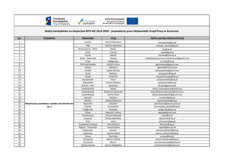 Wykaz kandydatów na ekspertów RPO WZ 2014-2020 - prowadzony przez Wojewódzki Urząd Pracy w Szczecinie Lp. Dziedzina Nazwisko Imię Adres poczty elektronicznej [email protected] [email protected] 1 Anacka Kamila Katarzyna 2 3 4 5 6 7 8 9 10 11 12 13 14 15 16 17 18 19 20 21 22 23 24 25 26 27 28 29 30 31 32 33 34 35 Bąk Broniszewska - Mróz Cisek Derski Doluk - Świerczek Firlej Firlej-Bylinowska Głasek Grabek Grześ Haupa Kaczorowski Kukielińska Kuźniar - Pelc Lewandowska Lewandowska Lewandowski Matysik Mortka Napierała Pawlak Podgrudny Połap Poniatowska Posyniak Proć Puckowska- Pociask Rogoza - Chojnacka Rutkowski Sadowska Sarwa Stempniak Szcześniak Świętoniowska Monika Agnieszka Beata Tomasz Marek Mirella Małgorzata Grażyna Anna Arkadiusz Sylwia Monika Barbara Krzysztof Artur Paulina Barbara Agnieszka Marta Katarzyna Agnieszka Dorian Karol Barbara Joanna Katarzyna Jarosław Przemysław Radosław Wojciech Tobiasz Urszula Katarzyna Dorota Agnieszka Artur Ilona Barbara Joanna Sylwia Dariusz Joanna Halina Ewa Anna Marcin, Michał Marcin Joanna Magdalena Aktywizacja zawodowa i opieka nad dziećmi do lat 3 [email protected] [email protected] [email protected] [email protected] [email protected] [email protected] [email protected] [email protected] [email protected] [email protected] [email protected] [email protected] [email protected] [email protected] [email protected] [email protected] [email protected] [email protected] [email protected] [email protected] [email protected] [email protected] [email protected] [email protected] [email protected] [email protected] [email protected] [email protected] [email protected] [email protected] [email protected] [email protected] [email protected] [email protected] 36 37 38 39 40 41 42 43 1 2 3 4 5 6 7 8 9 10 11 12 13 14 15 16 17 18 19 20 21 22 23 24 25 26 27 28 29 30 31 32 33 34 35 36 Aktywna integracja i usługi społeczne Tyc Urbański Węgrzyńska Wiankowski Lewińska Wróbel Wysocka Zwarzany Bąk Bileńki-Świsterska Broniszewska - Mróz Chabiera Cisek Czarnecka Derski Doluk - Świerczek Firlej Firlej-Bylinowska Glock Głasek Głowacki Grześ Idryjan Kaszycki Kordys Kucharska Kuźniar - Pelc Lewandowska Lewandowska Lewandowski Łukomska - Dziedzic Markowska Matysik Miela Milewska Mortka Mucha Napierała Oleksiak Połap Poniatowska Proć Puckowska- Pociask Rogoza - Chojnacka Andrzej Jan Wiktor Jan Joanna Rafał Wojciech Kamilla Maria Tomasz Wojciech Magdalena Katarzyna Elżbieta Monika Agnieszka Anna Patrycja Beata Stefan Tomasz Justyna Maria Marek Mirella Małgorzata Grażyna Anna Mariusz Arkadiusz Radosław Grzegorz Barbara Karolina Marta Zbigniew Marzena Karolina Agnieszka Marta Katarzyna Agnieszka Dorian Karol Anna Florentyna Justyna Ewa Barbara Joanna Maria Maria Joanna Katarzyna Karolina Anna Jarosław Dariusz Wojciech Tobiasz Urszula Katarzyna Artur Ilona Barbara Joanna Sylwia [email protected] [email protected] [email protected] [email protected] [email protected] [email protected] [email protected] [email protected] [email protected] [email protected] , [email protected] [email protected] [email protected] [email protected] [email protected] [email protected] [email protected] [email protected] [email protected] [email protected] [email protected] [email protected] [email protected] [email protected] [email protected] [email protected] [email protected] [email protected] [email protected] [email protected] [email protected] [email protected] [email protected] [email protected] [email protected] [email protected] [email protected] [email protected] [email protected] [email protected] [email protected] [email protected] [email protected] [email protected] [email protected] [email protected] 37 38 39 40 41 42 43 44 45 46 47 48 1 2 3 4 5 6 7 8 9 10 11 12 13 14 15 16 17 18 19 20 21 22 23 24 25 26 27 28 29 30 31 32 Sadowska Sarwa Seńków Stempniak Szcześniak Urbański Węgrzyńska Wiankowski Lewińska Wolska Zientarska Zwarzany Arcimowicz Bąk Bileńki-Świsterska Brząkalik Chabiera Chlebińska Chmiel Cisek Ciszewska Ciupa Dąbrowski Derski Firlej-Bylinowska Furgoł Głasek Grześ Jasińska Kamińska Katlewska - Kościecha Kempa - Paplińska Komorkiewicz Kordys Kowalska Kozioł Kuć Kukielińska Kuźniar - Pelc Kwiatkowska - Ciotucha Leder Leśniak Lewandowska Lewandowska Joanna Halina Ewa Anna Małgorzata Marcin, Michał Marcin Wiktor Jan Joanna Rafał Wojciech Kamilla Maria Teresa Katarzyna Anna Katarzyna Elżbieta Anna Małgorzata Monika Agnieszka Anna Patrycja Krystyna Jolanta Stefan Grażyna Zofia Alicja Barbara Tomasz Agnieszka Rafał Piotr Arkadiusz Marek Grażyna Anna Sabina Joanna Arkadiusz Barbara Jolanta Małgorzata Alicja Inga Natalia Anna Michał Marian Marzena Elżbieta Katarzyna Jacek Paulina Barbara Agnieszka Dorota Anna Beata Zofia Marek Marta Józefa Marta [email protected] [email protected] [email protected] [email protected] [email protected] [email protected] [email protected] [email protected] [email protected] [email protected] [email protected] [email protected] [email protected] [email protected] [email protected] , [email protected] [email protected] [email protected] [email protected] [email protected] [email protected] [email protected] [email protected] [email protected] [email protected] [email protected] [email protected] [email protected] [email protected] [email protected] [email protected] [email protected] [email protected] [email protected] [email protected] [email protected] [email protected] [email protected] [email protected] [email protected] [email protected] [email protected] [email protected] [email protected] [email protected] 33 34 35 36 37 38 39 40 41 42 43 44 45 46 47 48 49 50 51 52 53 54 55 56 57 58 59 60 61 62 63 64 65 66 67 68 69 70 71 72 73 74 75 76 Edukacja Lewandowska Lewandowski Ludwikowska Łuczak Matysik Mortka Napierała Nosowicz Pawlak Pipier Pliżga Połap Poniatowska Posyniak Proć Przybył Przystalska Pyrczak Rastawicki Ratajczyk Rutkowski Rybak Rychlik - Łukasiewic