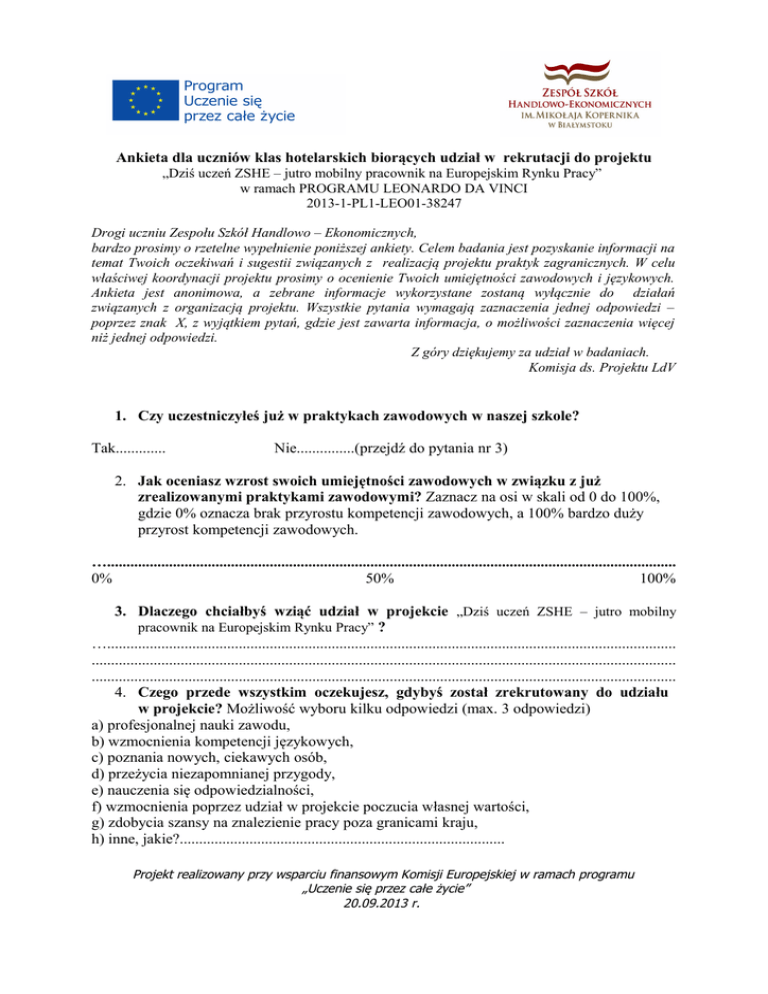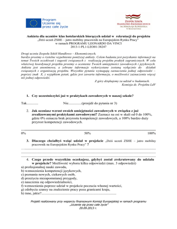 Ankieta dla uczniów klas hotelarskich biorących udział w rekrutacji do projektu „Dziś uczeń ZSHE – jutro mobilny pracownik na Europejskim Rynku Pracy” w ramach PROGRAMU LEONARDO DA VINCI 2013-1-PL1-LEO01-38247 Drogi uczniu Zespołu Szkół Handlowo – Ekonomicznych, bardzo prosimy o rzetelne wypełnienie poniższej ankiety. Celem badania jest pozyskanie informacji na temat Twoich oczekiwań i sugestii związanych z realizacją projektu praktyk zagranicznych. W celu właściwej koordynacji projektu prosimy o ocenienie Twoich umiejętności zawodowych i językowych. Ankieta jest anonimowa, a zebrane informacje wykorzystane zostaną wyłącznie do działań związanych z organizacją projektu. Wszystkie pytania wymagają zaznaczenia jednej odpowiedzi – poprzez znak X, z wyjątkiem pytań, gdzie jest zawarta informacja, o możliwości zaznaczenia więcej niż jednej odpowiedzi. Z góry dziękujemy za udział w badaniach. Komisja ds. Projektu LdV 1. Czy uczestniczyłeś już w praktykach zawodowych w naszej szkole? Tak............. Nie...............(przejdź do pytania nr 3) 2. Jak oceniasz wzrost swoich umiejętności zawodowych w związku z już zrealizowanymi praktykami zawodowymi? Zaznacz na osi w skali od 0 do 100%, gdzie 0% oznacza brak przyrostu kompetencji zawodowych, a 100% bardzo duży przyrost kompetencji zawodowych. …................................................................................................................................................... 0% 50% 100% 3. Dlaczego chciałbyś wziąć udział w projekcie „Dziś uczeń ZSHE – jutro mobilny pracownik na Europejskim Rynku Pracy” ? …................................................................................................................................................... ....................................................................................................................................................... ....................................................................................................................................................... 4. Czego przede wszystkim oczekujesz, gdybyś został zrekrutowany do udziału w projekcie? Możliwość wyboru kilku odpowiedzi (max. 3 odpowiedzi) a) profesjonalnej nauki zawodu, b) wzmocnienia kompetencji językowych, c) poznania nowych, ciekawych osób, d) przeżycia niezapomnianej przygody, e) nauczenia się odpowiedzialności, f) wzmocnienia poprzez udział w projekcie poczucia własnej wartości, g) zdobycia szansy na znalezienie pracy poza granicami kraju, h) inne, jakie?.................................................................................... Projekt realizowany przy wsparciu finansowym Komisji Europejskiej w ramach programu „Uczenie się przez całe życie” 20.09.2013 r. 5. Jakie zadania realizowane przez szkołę Twoim zdaniem najlepiej przygotowują młodzież do wejścia na rynek pracy? ( max. 3 odpowiedzi) a) obowiązkowe praktyki zawodowe, b) wycieczki zawodoznawcze, c) praktyki zagraniczne, d) zajęcia wyrównawcze z przedmiotów zawodowych, e) dodatkowe kursy językowe, f) warsztaty kształtujące umiejętności miękkie tj, np. asertywność, umiejętność pracy w grupie, g) spotkania z przedstawicielami lokalnego biznesu h) inne, jakie?.................................................................................... 6. Jak oceniasz swoje obecne kompetencje zawodowe – hotelarskie ? a) uważam, że są na bardzo dobrym poziomie, b) uważam, że są na dobrym poziomie, c) trudno mi określić moje kompetencje zawodowe, są ani dobre ani złe, d) uważam, że są na niskim poziomie, e) uważam, że są na bardzo niskim poziomie, f) uważam, iż nie posiadam żadnych kompetencji zawodowych. 7. Jak oceniasz swoje obecne umiejętności językowe – język angielski komunikatywność? a) bardzo dobrze, b) dobrze, c) ani dobrze ani źle, d) źle e) bardzo źle. Metryczka: Klasa: druga................ trzecia .......... Płeć: kobieta.............. mężczyzna......... Miejsce zamieszkania: - wieś ............. - miasto do 50000 mieszkańców ............. - miasto pow. 50000 mieszkańców …......... Projekt realizowany przy wsparciu finansowym Komisji Europejskiej w ramach programu „Uczenie się przez całe życie” 20.09.2013 r.