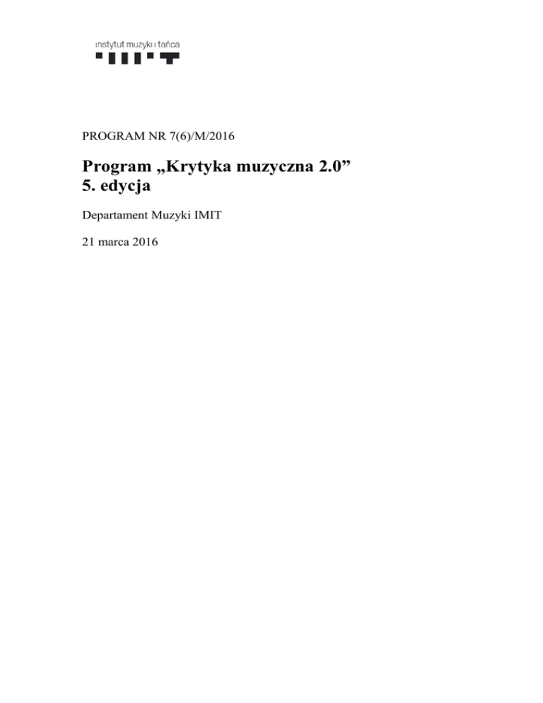 PROGRAM NR 7(6)/M/2016 Program „Krytyka muzyczna 2.0” 5. edycja Departament Muzyki IMIT 21 marca 2016 1. Cel programu: Rozwój polskiej krytyki muzycznej 2. Skrótowy opis: Program jest adresowany do polskich muzykologów, teoretyków muzyki, recenzentów, krytyków i osób reprezentujących szeroko rozumianą humanistykę, które zamierzają poznać zasady krytyki muzycznej lub podnieść jej jakość. 3. Szczegółowy opis: Realizacja programu odbywać się będzie poprzez zorganizowanie wykładów i warsztatów z dziedziny krytyki muzycznej, w efekcie których powstaną teksty przewidziane do publikacji. Kursy obejmować będą kształcenie uczestników w trzech obszarach: 1. krytyki muzyki współczesnej 2. krytyki muzyki estradowej (sal koncertowych prezentujących żelazny repertuar, w tym związany także z muzyką dawną, tradycyjną, jazzową, filmową); 3. krytyki operowej i baletowej. Instytut zorganizuje warsztaty składające się z trzech elementów: wykładów, warsztatów i publikacji tekstów. Regulamin programu: 1. Program „Krytyka muzyczna 2.0” adresowany jest do polskich muzykologów, teoretyków muzyki, dziennikarzy, recenzentów, krytyków i osób reprezentujących szeroko rozumianą humanistykę, które prowadzą lub planują prowadzenie działalności w obszarze krytyki muzycznej i recenzowania życia muzycznego. 2. W programie mogą wziąć udział osoby posiadające tytuł magistra, osoby posiadające licencjat oraz studenci od 3. roku studiów. 3. Zgłoszenie udziału w programie składa do Instytutu bezpośrednio osoba zainteresowana programem, przedkładając życiorys i list motywacyjny oraz opublikowany w dowolnej formie tekst poświęcony muzyce filmowej. W przypadku studentów lub osób posiadających licencjat konieczne jest dostarczenie pisemnej opinii promotora licencjatu. 4. Realizacja programu polega na uczestnictwie w wykładach, warsztatach oraz wskazanym przez Instytut wydarzeniu muzycznych oraz napisaniu tekstu na wskazany temat związany z wydarzeniem muzycznym. 5. Efekt pracy w formie wydruku lub zapisu elektronicznego musi zostać złożony do Instytutu nie później niż w ciągu 30 dni od daty wydarzenia muzycznego. 6. Instytut pokrywa koszt honorariów wykładowców i prowadzących warsztaty, koszty noclegów podczas wykładów i warsztatów oraz podróży związanych z realizacją programu, a także zapewnia uczestnikom bilety lub zaproszenia na wskazane wydarzenia muzyczne. 7. Instytut i uczestnik programu będą stronami umowy, w której nastąpi określenie przedmiotu programu, terminu uczestnictwa w wykładzie, warsztatach i wydarzeniu muzycznym oraz wyników udziału w programie. 8. Instytut drogą powyższej umowy uzyska niewyłączną licencję do rozporządzania pisemnym efektem warsztatów na czas trwania majątkowych praw autorskich z jednorazowym wynagrodzeniem 500 złotych brutto. 9. Instytut zapewni rozpowszechnienie tekstów w formie publikacji internetowej lub drukowanej. 10. W ciągu jednej edycji programu może wziąć udział maksimum 5 uczestników. 11. O kwalifikacji uczestników do programu decyduje trzyosobowa komisja składająca się z przedstawiciela Instytutu lub organizatora wydarzenia muzycznego oraz wykładowców prowadzących wykłady i warsztaty, biorąc pod uwagę termin nadesłania zgłoszenia, poprawność aplikacji i zgodność z regulaminem, życiorys i list motywacyjny, opinię promotora licencjatu jeśli jest wymagana oraz przesłany tekst dotyczący muzyki filmowej. 12. Dyrektor Instytutu ogłasza terminy nadsyłania zgłoszeń, wzór formularza, skład komisji oraz listę wybranych wnioskodawców. 13. Czas trwania programu: Od 1 czerwca 2011 do odwołania 14. V edycja programu – 2016 r. Temat edycji: Krytyka muzyczna – muzyka filmowa 25 – 29. 05. 2016 r. Kraków Udział w programie obejmuje obligatoryjne uczestnictwo w warsztacie teoretycznym (autor wykładu – dr Mariusz Gradowski), warsztatach (prowadzący warsztaty – Kinga Wojciechowska), panelu dyskusyjnym poświęconym muzyce filmowej oraz w koncertach w ramach Festiwalu Muzyki Filmowej w Krakowie w dniach 25 – 29 maja 2016 r. Program koncertów: 25.05. 2016 – Scoring4Polański; Centrum Kongresowe ICE Kraków, Sala Audytoryjna, godz. 20.00 26.05. 2016 – Cinematic Piano; Centrum Kongresowe ICE Kraków, Sala S5, godz. 17.00 (do potwierdzenia, koncert poza karnetem) 26.05. 2016 – Wars i Kaper: Deconstruction; Centrum Kongresowe ICE Kraków, Sala Teatralna, godz. 20.00 27.05. 2016 – Gala alterFMF: Drone Sounds; Centrum Kongresowe ICE Kraków, Sala Audytoryjna, godz. 20.00 28.05. 2016 – Gala Muzyki Filmowej: Animacje; TAURON Arena Kraków, godz. 17.00 29.05. 2016 – Młodzi na poważnie: Animacje; Filharmonia im. Karola Szymanowskiego w Krakowie, godz. 20.00 29.05. 2016 – Indiana Jones: Poszukiwacze zaginionej Arki – film z muzyką na żywo, TAURON Arena Kraków, godz. 19.00 Zakończenie V edycji i przedstawienie tekstów: 30 czerwca 2016 r. Termin nadsyłania zgłoszeń do V edycji programu upływa w dniu 15 kwietnia 2016 r. Zgłoszenia należy przysyłać wyłącznie w wersji elektronicznej na adres: [email protected] [zeskanowany formularz aplikacyjny i opinia promotora licencjatu, pozostałe załączniki w formacie word]. Termin wyboru zgłoszeń przez komisję opiniującą upływa w dniu 18 kwietnia 2016 r. Po tym terminie lista zakwalifikowanych przez komisję wnioskodawców zostanie ogłoszona na stronie internetowej Instytutu. 15. Oczekiwane rezultaty: Poprawa jakości polskiej krytyki muzycznej, zwiększenie liczby krytyk i recenzji w mediach 16. Osoby odpowiedzialne: Andrzej Kosowski – Dyrektor Instytutu, Brygida Błaszczyk-Podhajska – Specjalista ds. programowych, tel. 22 829 20 15, [email protected] Informacje na temat programu „Krytyka muzyczna” i formularz zgłoszeniowy dostępne są na stronie IMiT: http://www.imit.org.pl