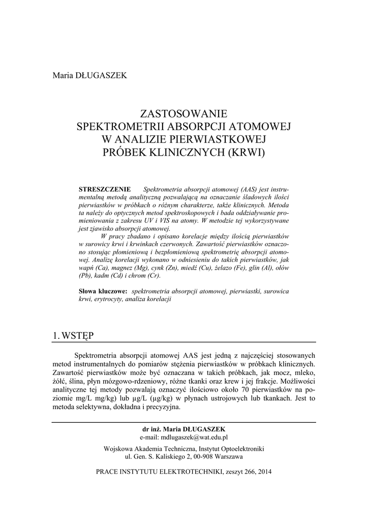 Maria DŁUGASZEK ZASTOSOWANIE SPEKTROMETRII ABSORPCJI ATOMOWEJ W ANALIZIE PIERWIASTKOWEJ PRÓBEK KLINICZNYCH (KRWI) STRESZCZENIE Spektrometria absorpcji atomowej (AAS) jest instrumentalną metodą analityczną pozwalającą na oznaczanie śladowych ilości pierwiastków w próbkach o różnym charakterze, także klinicznych. Metoda ta należy do optycznych metod spektroskopowych i bada oddziaływanie promieniowania z zakresu UV i VIS na atomy. W metodzie tej wykorzystywane jest zjawisko absorpcji atomowej. W pracy zbadano i opisano korelacje między ilością pierwiastków w surowicy krwi i krwinkach czerwonych. Zawartość pierwiastków oznaczono stosując płomieniową i bezpłomieniową spektrometrię absorpcji atomowej. Analizę korelacji wykonano w odniesieniu do takich pierwiastków, jak wapń (Ca), magnez (Mg), cynk (Zn), miedź (Cu), żelazo (Fe), glin (Al), ołów (Pb), kadm (Cd) i chrom (Cr). Słowa kluczowe: spektrometria absorpcji atomowej, pierwiastki, surowica krwi, erytrocyty, analiza korelacji 1. WSTĘP Spektrometria absorpcji atomowej AAS jest jedną z najczęściej stosowanych metod instrumentalnych do pomiarów stężenia pierwiastków w próbkach klinicznych. Zawartość pierwiastków może być oznaczana w takich próbkach, jak mocz, mleko, żółć, ślina, płyn mózgowo-rdzeniowy, różne tkanki oraz krew i jej frakcje. Możliwości analityczne tej metody pozwalają oznaczyć ilościowo około 70 pierwiastków na poziomie mg/L mg/kg) lub µg/L (µg/kg) w płynach ustrojowych lub tkankach. Jest to metoda selektywna, dokładna i precyzyjna. dr inż. Maria DŁUGASZEK e-mail: [email protected] Wojskowa Akademia Techniczna, Instytut Optoelektroniki ul. Gen. S. Kaliskiego 2, 00-908 Warszawa PRACE INSTYTUTU ELEKTROTECHNIKI, zeszyt 266, 2014 30 M. Długaszek Spektrometria absorpcji atomowej należy do metod spektroskopowych. Atomy oznaczanego pierwiastka znajdujące się w podstawowym stanie energetycznym absorbują promieniowanie optyczne charakterystyczne dla tego pierwiastka z zakresu od 193,7 nm (As) do 894,5 nm (Cs). Na podstawie ilości zaabsorbowanego promieniowania można oznaczyć ilość analitu w próbce. Podstawowe elementy spektrometru absorpcji atomowej to źródło światła emitujące promieniowanie elektromagnetyczne absorbowane przez wolne atomy analitu, atomizer w którym w wyniku dostarczonej energii termicznej następuje dysocjacja termiczna cząsteczek zawierających analit. Powstaje chmura wolnych atomów absorbujących promieniowanie emitowane przez lampę. W skład układu pomiarowego wchodzi monochromator wyodrębniający wiązkę promieniowania o odpowiedniej długości fali, detektor i rejestrator [2, 3, 9, 10, 12, 14, 15, 20]. Zawartość pierwiastków na potrzeby diagnostyki medycznej najczęściej oznaczana jest we krwi i jej frakcjach, tj. osoczu (płynna frakcja krwi), surowicy (osocze bez fibrynogenu i innych czynników krzepnięcia krwi, pozostałość po oddzieleniu skrzepu), krwinkach czerwonych i leukocytach. We krwi oznaczana jest zawartość przede wszystkim pierwiastków takich jak Ca, Mg, Zn, Cu i Fe. W zależności od potrzeb, w szczególnych przypadkach, np. podejrzeń zatrucia, oznacza się stężenie także innych pierwiastków, np. manganu (Mn), chromu (Cr), niklu (Ni), selenu (Se) i toksycznych, jak Pb, Cd, Al, rtęć (Hg), arsen (As), tal (Tl). Analiza stężenia pierwiastków we krwi pozwala określić, czy występują niedobory pierwiastka w organizmie lub też nadmiar np. metali ciężkich. Zawartość pierwiastków we krwi jest zmienna i uzależniona od wielu czynników, m.in. płci, wieku, stanu zdrowia, diety, bilansu wody w organizmie, przyjmowanych leków, indywidualnego zapotrzebowania na makro- i mikroelementy, przebiegających procesów homeostazy [1-3, 9, 10, 15, 17]. Krew pełna to przede wszystkim osocze zawierające 91-92% wody, krwinki czerwone, białe i płytkowe. Ilość wody w 1 l osocza określa stężenie zawartych w nim pierwiastków [1, 17]. Czerwone krwinki wykazują tendencję do kumulacji niektórych pierwiastków, np. Zn, Pb, Cd, Al i Cr [2, 3, 15, 17, 18]. Ilościowe zmiany pierwiastków w krwinkach obserwowano także w stanach chorobowych, np. Mg przy nadciśnieniu [15]. Pierwiastki – biopierwiastki i metale toksyczne oddziałują na siebie zarówno na etapie absorpcji jelitowej, przyswajania komórkowego, procesach biochemicznych, w których uczestniczą, jak i kumulacji w tkankach i narządach. Wzajemne interakcje mogą mieć charakter synergistyczny i antagonistyczny. Istotna jest więc nie tylko ilość pierwiastków, ale także wzajemne ilościowe proporcje między nimi. Znane są interakcje między takimi pierwiastkami, jak Cd i Zn, Fe, Ca, Se, Cu; Pb i Fe, Cu, Zn, Ca; Ca i Mg (synergistyczne i antagonistyczne) [2, 5-7]. Pierwiastki w płynach ustrojowych i tkankach występują w różnych ilościach. Wykonywane są komplementarne analizy krwi, moczu, włosów i, jeśli to konieczne, biopsji tkanek. Prowadzone badania zmierzają do opracowania metod pozwalających w jednoznaczny sposób ocenić zasoby mineralne organizmu. Celem niniejszej pracy jest analiza korelacji między zawartością pierwiastków: Ca, Mg, Zn, Cu, Fe, Al, Pb, Cd i Cr w surowicy krwi (płynie pozakomórkowym) i czerwonych krwinkach (komórkach). Zastosowanie spektrometrii absorpcji atomowej w analizie pierwiastkowej… 31 2. MATERIAŁ I METODYKA BADAŃ Zawartość pierwiastków oznaczono w 46 próbkach surowicy i krwinek czerwonych metodą spektrometrii absorpcji atomowej. Techniką płomieniową ilościowo oznaczono Ca, Mg, Zn, Cu i Fe, natomiast w piecu grafitowym – Al, Pb, Cd i Cr. Szczegóły dotyczące badanych próbek, metod ich przygotowania, warunków analizy instrumentalnej, walidacji procedur analitycznych zawarte są w naszej (Wojskowy Szpital Kliniczny z Polikliniką w Bydgoszczy) wcześniejszej publikacji [7]. Na potrzeby tej pracy wyniki ilościowych badań próbek krwi podzielono na cztery grupy. Ana