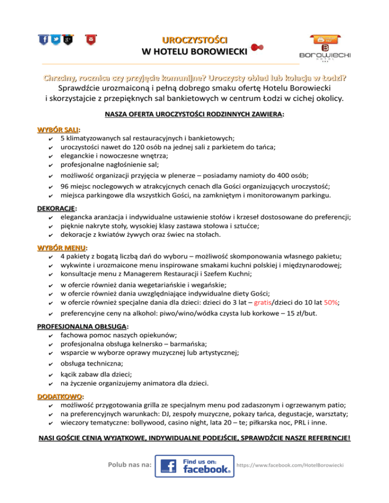 UROCZYSTOŚCI W HOTELU BOROWIECKI Chrzciny, rocznica czy przyjęcie komunijne? Uroczysty obiad lub kolacja w Łodzi? Sprawdźcie urozmaiconą i pełną dobrego smaku ofertę Hotelu Borowiecki i skorzystajcie z przepięknych sal bankietowych w centrum Łodzi w cichej okolicy. NASZA OFERTA UROCZYSTOŚCI RODZINNYCH ZAWIERA: WYBÓR SALI: ✔ 5 klimatyzowanych sal restauracyjnych i bankietowych; ✔ uroczystości nawet do 120 osób na jednej sali z parkietem do tańca; ✔ eleganckie i nowoczesne wnętrza; ✔ profesjonalne nagłośnienie sal; ✔ możliwość organizacji przyjęcia w plenerze – posiadamy namioty do 400 osób; ✔ 96 miejsc noclegowych w atrakcyjcnych cenach dla Gości organizujących uroczystość; miejsca parkingowe dla wszystkich Gości, na zamkniętym i monitorowanym parkingu. ✔ DEKORACJE: ✔ elegancka aranżacja i indywidualne ustawienie stołów i krzeseł dostosowane do preferencji; ✔ pięknie nakryte stoły, wysokiej klasy zastawa stołowa i sztućce; ✔ dekoracje z kwiatów żywych oraz świec na stołach. WYBÓR MENU: ✔ 4 pakiety z bogatą liczbą dań do wyboru – możliwość skomponowania własnego pakietu; ✔ wykwinte i urozmaicone menu inspirowane smakami kuchni polskiej i międzynarodowej; ✔ konsultacje menu z Managerem Restauracji i Szefem Kuchni; ✔ w ofercie również dania wegetariańskie i wegańskie; w ofercie również dania uwzględniające indywidualne diety Gości; w ofercie również specjalne dania dla dzieci: dzieci do 3 lat – gratis/dzieci do 10 lat 50%; ✔ preferencyjne ceny na alkohol: piwo/wino/wódka czysta lub korkowe – 15 zł/but. ✔ ✔ PROFESJONALNA OBŁSUGA: ✔ fachowa pomoc naszych opiekunów; ✔ profesjonalna obsługa kelnersko – barmańska; ✔ wsparcie w wyborze oprawy muzycznej lub artystycznej; ✔ obsługa techniczna; ✔ kącik zabaw dla dzieci; na życzenie organizujemy animatora dla dzieci. ✔ DODATKOWO: ✔ możliwość przygotowania grilla ze specjalnym menu pod zadaszonym i ogrzewanym patio; ✔ na preferencyjnych warunkach: DJ, zespoły muzyczne, pokazy tańca, degustacje, warsztaty; ✔ wieczory tematyczne: bollywood, casino night, lata 20 – te; piłkarska noc, PRL i inne. NASI GOŚCIE CENIĄ WYJĄTKOWE, INDYWIDUALNE PODEJŚCIE, SPRAWDŹCIE NASZE REFERENCJE! Polub nas na: https://www.facebook.com/HotelBorowiecki SALE: (wszystkie sale znajdują się na parterze, posiadają klimatyzację i dostęp do światła dziennego) Nazwa sali m2 Układ bankietowy Restauracyjna 110 90 osób Barowa 60 40 osób Restauracyjna + Barowa 170 120 osób Złota 46 26 osób Kremowa 40 22 osób Platynowa 40 22 osób PAKIET PODSTAWOWY: PAKIET 1. - 80 zł/os.; powyżej 30 osób 75 zł/os. Przystawka – serwowana do wyboru: • • • • • Pasztet „Borowieckiego” z konfiturą z cebuli Tatar ze śledzia podany na chrupiącej grzance Roladki z kurczaka na rukoli z sosem balsamicznym Pstrąg w bakłażanie Schab po Sztygarsku podany z konfiturą Zupa – serwowana do wyboru: • • • • • Esencjonalny bulion wołowy z makaronem Aksamitny krem z białych warzyw z chrustem z boczku Włoska zupa Minestrone Barszcz czerwony z krokietem mięsnym Hiszpański krem z parzonych pomidorów z grzanką, muśnięty kwaśną śmietaną; Danie główne – serwowane do wyboru: • • • • • Woda, soki (300 ml/os.) / kawa oraz herbata Pierś z kurczaka faszerowana szpinakiem i serem pleśniowym owinięta szynką dojrzewającą podana z maślanym puree i sałatką vinegre Schabowe kieszonki z pieczarkami i kapustą serwowane z puree ziemniaczanym i bukietem surówek Podudzie z kurczaka faszerowane żurawiną i orzechami włoskimi podane z pieczonymi ziemniakami oraz glazurowaną marchewką Smażona ryba w ziołowej kruszonce serwowana z ziemniakami au Gratin oraz surówką Colesław Kotlet po Szwajcarsku podany z ziołowymi, pieczonymi ziemniakami i bukietem surówek Deser – serwowany do wyboru: • • Panna cotta waniliowa z sosem malinowym; Szarlotka Polub nas na: https://www.facebook.com/HotelBorowiecki PAKIET 2. - 110 zł/os.; powyżej 30 osób 105 zł/os. Zupa – serwowana do wyboru: • • • • • Esencjonalny bulion wołowy z kołdunami mięsnymi Hiszpański krem z parzonych pomidorów z grzanką, muśnięty kwaśną śmietaną Krem z buraków z kleksem jogurtu greckiego Włoska zupa Minestrone Krem z dyni z imbirem Danie główne – serwowane do wyboru: • • • • • Polędwiczka wieprzowa ze strudlem ziemniaczanym, fasolką szparagową w boczku i snopkiem z marchwi Łosoś z pieca podany z pieczonymi ziemniakami w ziołach lub ryżem jaśminowym na kremowym szpinaku z sosem ogórkowo – szczypiorkowym Zrazy wieprzowe w sosie własnym serwowane z kapustą zasmażaną z pomidorami i koperkiem oraz kluskami gnocchi Pierś z kurczaka faszerowana suszonymi pomidorami, kaparami i oliwkami z serem mozzarella owinięta szynką dojrzewającą podana z maślanym puree oraz sałatką vinegrette Kotlet po szwajcarsku podany z ziołowymi pieczonymi ziemniakami i bukietem surówek Bufet zimnych przekąsek na paterach: • • • • • • • Mięsa pieczone przez Szefa Kuchni z dodatkiem marynat Śledź w oleju i śmietanie Roladki z pstrąga w bakłażanie Sałatka grecka Pasztet „Borowieckiego” z konfiturą z cebuli Sałatka z brokułów , sera feta i prażonych migdałów Pieczywo i masło Bufet słodki: • • • Patera ciast (szarlotka, ciasto czekoladowe z wiśniami, sernik) Patera owoców Mus owocowy Woda, soki (300 ml/os.) / kawa oraz herbata Deser – serwowany do wyboru: • • Tiramisu Panna Cotta z musem owocowym Polub nas na: https://www.facebook.com/HotelBorowiecki PAKIET 3. - 130zł/os.; powyżej 30 osób 120 zł/os. Zupa – serwowana do wyboru: • • • • • Esencjonalny bulion wołowy z kołdunami mięsnymi; Zupa gulaszowa Krem z białych warzyw z krewetką i chrustem ziemniaczanym Zupa włoska Minestrone Krem z buraków z kleksem jogurtu greckiego Danie główne – serwowan