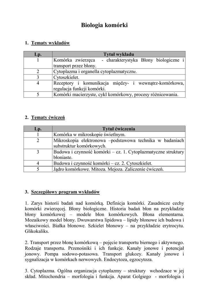 Biologia komórki 1. Tematy wykładów Lp. 1 2 3 4 5 Tytuł wykładu - charakterystyka Błony biologiczne i Komórka zwierzęca transport przez błony. Cytoplazma i organella cytoplazmatyczne. Cytoszkielet. Receptory i komunikacja między- i wewnątrz-komórkowa, regulacja funkcji komórki. Komórki macierzyste, cykl komórkowy, procesy różnicowania. 2. Tematy ćwiczeń Lp. 1 2 3 4 5 Tytuł ćwiczenia Komórka w mikroskopie świetlnym. Mikroskopia elektronowa –podstawowa technika w badaniach substruktur komórkowych. Budowa i czynność komórki – cz. 1. Cytoplazmatyczne struktury błoniaste. Budowa i czynność komórki – cz. 2. Cytoszkielet. Jądro komórkowe. Mitoza. Mejoza. Zaliczenie ćwiczeń. 3. Szczegółowy program wykładów 1. Zarys historii badań nad komórką. Definicja komórki. Zasadnicze cechy komórki zwierzęcej. Błony biologiczne. Historia badań błon na przykładzie błony komórkowej – modele błon komórkowych. Błona elementarna. Mozaikowy model błony. Dwuwarstwa lipidowa – lipidy błonowe ich budowa i własciwości. Białka błonowe. Szkielet błonowy – na przykładzie erytrocytu. Glikokaliks. 2. Transport przez błonę komórkową – pojęcie transportu biernego i aktywnego. Rodzaje transportu. Przenośniki i ich funkcje. Kanały jonowe i potencjał jonowy. Pompa sodowo-potasowa. Transport glukozy. Kanały jonowe i sygnalizacja w komórkach nerwowych. Endocytoza, egzocytoza. 3. Cytoplazma. Ogólna organizacja cytoplazmy – struktury wchodzace w jej skład. Mitochondria – morfologia i funkcja. Aparat Golgiego - morfologia i 2 funkcja. Pozostałe struktury błoniaste – morfologia i funkcja. Cytoszkielet – mikrotubule, mikrofilamenty, filamenty pośrednie. Białka towarzyszące elementom cytoszkieletu, udział w budowie struktur komórkowych. 4. Procesy zachodzace w cytoplazmie – transport, sortowanie, trawienie wewnątrzkomórkowe. Komunikacja międzykomórkowa. Receptory i ich klasyfikacja. Regulacja funkcji. 5. Cykl komórkowy. Różnicowanie komórek i ich rozwój. Procesy starzenia komórek. Apoptoza. Komórki macierzyste. 4. Szczegółowy program ćwiczeń Ćwicz.1. 1.Mikroskopia świetlna. Podstawowe pojęcia – powiększenie, zdolność rozdzielcza, rodzaje obiektywów. 2. Typy mikroskopów. 3. Technika mikroskopowania. 4. Klasyczne metody przygotowania preparatów. 5.Typy preparatów. 6. Współczesne metody wykorzystywane w badaniach nad komórką. Ćwicz.2. 1.Mikroskopia elektronowa – zasada działania, rodzaje mikroskopów. 2.Zasady przygotowania komórek do badań w mikroskopie elektronowym transmisyjnym i skaningowym. 3.Metody wykorzystywane do badań w mikroskopie elektronowym. 4.Technika obserwacji w mikroskopie elektronowym. Ćwicz.3. 1. Siateczka śródplazmatyczna – cechy morfologiczne, - rodzaje, rozmieszczenie w komórkach, - siateczka w mikroskopie świetlnym, - siateczka w mikroskopie elektronowym. 2. Funkcje siateczki. 3. Aparat Golgiego w mikroskopie świetlnym i elektronowym - morfologia i rozmieszczenie w komórkach. Uwarunkowania funkcjonalne rozwoju aparatu Golgiego w komórkach. Funkcje aparatu Golgiego. 4. Mitochondria – obserwacje w mikroskopie świetlnym i elektronowym - liczba mitochondriów w komórce, zależność między morfologią i funkcją. Ćwicz.4. 1.Struktury morfologiczne związane z procesem trawienia wewnątrzkomórkowego – lizosomy ich rodzaje i rozmieszczenie w komórkach – obserwacje w mikroskopie elektronowym. 3 2. Wtręty komórkowe – lipofuscyny, ziarnistości wydzielnicze, melanina, twory krystaliczne – obserwacje w mikroskopie świetlnym i elektronowym. 3. Cytoszkielet komórki – mikrofilamenty, filamenty pośrednie i mikrotubule – morfologia i funkcja w komórce- obserwacje w mikroskopie świetlnym i elektronowym. Ćwicz. 5. 1.Jądro komórkowe – w mikroskopie świetlnym i elektronowym – związek między funkcją a morfologią. 2.Cykl życiowy komórki i podstawowe mechanizmy regulujące. 3.Mitoza. 4. Kariotypy zwierząt. 5. Apoptoza i nekroza komórek.