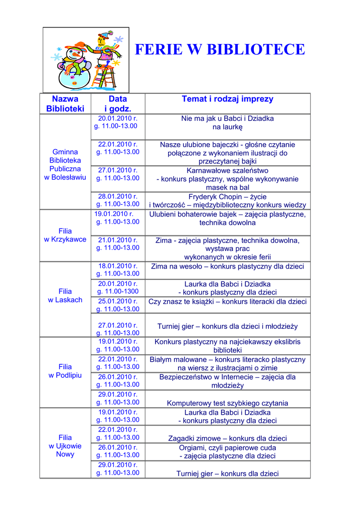 FERIE W BIBLIOTECE Nazwa Biblioteki Gminna Biblioteka Publiczna w Bolesławiu Data i godz. Temat i rodzaj imprezy 20.01.2010 r. g. 11.00-13.00 Nie ma jak u Babci i Dziadka na laurkę 22.01.2010 r. g. 11.00-13.00 27.01.2010 r. g. 11.00-13.00 28.01.2010 r. g. 11.00-13.00 19.01.2010 r. g. 11.00-13.00 Filia w Krzykawce Filia w Laskach 21.01.2010 r. g. 11.00-13.00 18.01.2010 r. g. 11.00-13.00 20.01.2010 r. g. 11.00-1300 25.01.2010 r. g. 11.00-13.00 27.01.2010 r. g. 11.00-13.00 19.01.2010 r. g. 11.00-13.00 Filia w Podlipiu Filia w Ujkowie Nowy 22.01.2010 r. g. 11.00-13.00 26.01.2010 r. g. 11.00-13.00 29.01.2010 r. g. 11.00-13.00 19.01.2010 r. g. 11.00-13.00 22.01.2010 r. g. 11.00-13.00 26.01.2010 r. g. 11.00-13.00 29.01.2010 r. g. 11.00-13.00 Nasze ulubione bajeczki - głośne czytanie połączone z wykonaniem ilustracji do przeczytanej bajki Karnawałowe szaleństwo - konkurs plastyczny, wspólne wykonywanie masek na bal Fryderyk Chopin – Ŝycie i twórczość – międzybiblioteczny konkurs wiedzy Ulubieni bohaterowie bajek – zajęcia plastyczne, technika dowolna Zima - zajęcia plastyczne, technika dowolna, wystawa prac wykonanych w okresie ferii Zima na wesoło – konkurs plastyczny dla dzieci Laurka dla Babci i Dziadka - konkurs plastyczny dla dzieci Czy znasz te ksiąŜki – konkurs literacki dla dzieci Turniej gier – konkurs dla dzieci i młodzieŜy Konkurs plastyczny na najciekawszy ekslibris biblioteki Białym malowane – konkurs literacko plastyczny na wiersz z ilustracjami o zimie Bezpieczeństwo w Internecie – zajęcia dla młodzieŜy Komputerowy test szybkiego czytania Laurka dla Babci i Dziadka - konkurs plastyczny dla dzieci Zagadki zimowe – konkurs dla dzieci Orgiami, czyli papierowe cuda - zajęcia plastyczne dla dzieci Turniej gier – konkurs dla dzieci