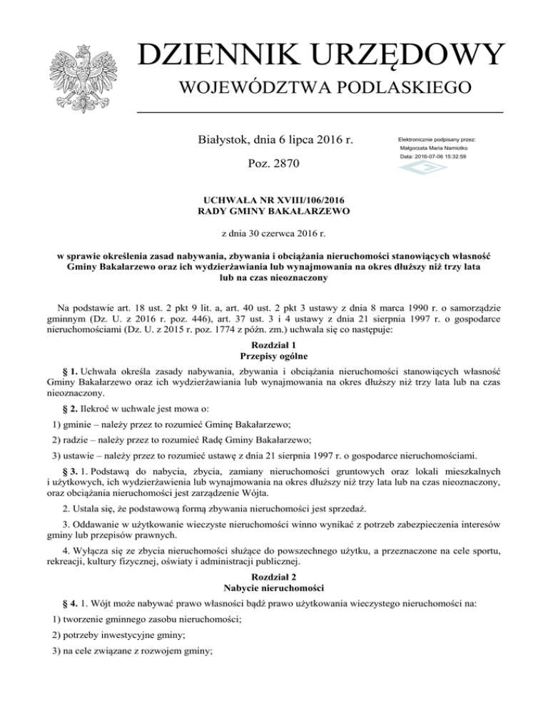 DZIENNIK URZĘDOWY WOJEWÓDZTWA PODLASKIEGO Białystok, dnia 6 lipca 2016 r. Elektronicznie podpisany przez: Małgorzata Maria Namiotko Poz. 2870 Data: 2016-07-06 15:32:59 UCHWAŁA NR XVIII/106/2016 RADY GMINY BAKAŁARZEWO z dnia 30 czerwca 2016 r. w sprawie określenia zasad nabywania, zbywania i obciążania nieruchomości stanowiących własność Gminy Bakałarzewo oraz ich wydzierżawiania lub wynajmowania na okres dłuższy niż trzy lata lub na czas nieoznaczony Na podstawie art. 18 ust. 2 pkt 9 lit. a, art. 40 ust. 2 pkt 3 ustawy z dnia 8 marca 1990 r. o samorządzie gminnym (Dz. U. z 2016 r. poz. 446), art. 37 ust. 3 i 4 ustawy z dnia 21 sierpnia 1997 r. o gospodarce nieruchomościami (Dz. U. z 2015 r. poz. 1774 z późn. zm.) uchwala się co następuje: Rozdział 1 Przepisy ogólne § 1. Uchwała określa zasady nabywania, zbywania i obciążania nieruchomości stanowiących własność Gminy Bakałarzewo oraz ich wydzierżawiania lub wynajmowania na okres dłuższy niż trzy lata lub na czas nieoznaczony. § 2. Ilekroć w uchwale jest mowa o: 1) gminie – należy przez to rozumieć Gminę Bakałarzewo; 2) radzie – należy przez to rozumieć Radę Gminy Bakałarzewo; 3) ustawie – należy przez to rozumieć ustawę z dnia 21 sierpnia 1997 r. o gospodarce nieruchomościami. § 3. 1. Podstawą do nabycia, zbycia, zamiany nieruchomości gruntowych oraz lokali mieszkalnych i użytkowych, ich wydzierżawienia lub wynajmowania na okres dłuższy niż trzy lata lub na czas nieoznaczony, oraz obciążania nieruchomości jest zarządzenie Wójta. 2. Ustala się, że podstawową formą zbywania nieruchomości jest sprzedaż. 3. Oddawanie w użytkowanie wieczyste nieruchomości winno wynikać z potrzeb zabezpieczenia interesów gminy lub przepisów prawnych. 4. Wyłącza się ze zbycia nieruchomości służące do powszechnego użytku, a przeznaczone na cele sportu, rekreacji, kultury fizycznej, oświaty i administracji publicznej. Rozdział 2 Nabycie nieruchomości § 4. 1. Wójt może nabywać prawo własności bądź prawo użytkowania wieczystego nieruchomości na: 1) tworzenie gminnego zasobu nieruchomości; 2) potrzeby inwestycyjne gminy; 3) na cele związane z rozwojem gminy; Dziennik Urzędowy Województwa Podlaskiego –2– Poz. 2870 4) cele związane z realizacją zadań własnych gminy; 5) realizację urządzeń infrastruktury technicznej; 6) realizację innych uzasadnionych celów publicznych. 2. Nabycie nieruchomości może nastąpić w drodze: 1) nieodpłatnego przekazania decyzją administracyjną; 2) zakupu nieruchomości; 3) przyjęcia darowizny, zrzeczenia się, zamiany, spadku lub zapisu; 4) wywłaszczenia; 5) podziałów oraz scaleń i podziałów. § 5. Zgoda rady wyrażona w formie uchwały wymagana jest przy nabyciu nieruchomości, której wartość przekracza 50 000 zł, z wyjątkiem przypadku określonego w § 4 ust. 2 pkt 1. § 6. 1. Odpłatne nabycie nieruchomości następuje po cenie ustalonej w wyniku negocjacji ze zbywcą, jednak nie wyższej niż wartość ustaloną przez rzeczoznawcę majątkowego, chyba że za nabyciem za wyższą cenę przemawiają szczególne okoliczności. 2. Uzgodnienie ceny i spisanie protokołu z przeprowadzonych negocjacji stanowi podstawę do zawarcia umowy w formie aktu notarialnego. Rozdział 3 Zbywanie nieruchomości i oddawanie w użytkowanie wieczyste § 7. 1. Wójt może zbywać i oddawać w użytkowanie wieczyste nieruchomości wchodzące w skład zasobu, jeżeli nieruchomości te są zbędne do realizacji zadań Gminy. 2. Zbycie nieruchomości może nastąpić w drodze: 1) sprzedaży nieruchomości; 2) wniesienia jako wkład niepieniężny (aport) do spółki; 3) innych czynności prawnych. § 8. Cenę zbycia lub wywoławczą Wójt określa w zarządzeniu o przeznaczeniu nieruchomości do zbycia, z zastrzeżeniem § 9 i § 10. § 9. Jeżeli wartość nieruchomości przekracza 50 000 zł, do jej zbycia lub oddania w użytkowanie wieczyste wymagana jest zgoda Rady wyrażona w formie uchwały. Zasada powyższa obowiązuje również przy zamianie nieruchomości. § 10. W przypadku zbycia nieruchomości w formie darowizny, wymagana jest każdorazowo zgoda rady wyrażona w formie uchwały. § 11. Zbycie nieruchomości i oddanie w użytkowanie wieczyste następuje według zasad określonych w ustawie oraz jej przepisach wykonawczych. § 12. Wójt może dokonywać zamiany nieruchomości w przypadku, gdy jest to uzasadnione potrzebami Gminy lub uzasadnionymi potrzebami innych osób prawnych lub fizycznych. § 13. Warunki zamiany nieruchomości uzgadnia się w drodze rokowań. Rozdział 4 Obciążanie nieruchomości ograniczonymi prawami rzeczowymi § 14. 1. Wójt może na nieruchomościach ustanawiać ograniczone prawa rzeczowe: 1) użytkowanie; 2) hipotekę; 3) służebność gruntową i osobistą; Dziennik Urzędowy Województwa Podlaskiego –3– Poz. 2870 4) służebność przesyłu na rzecz przedsiębiorcy, który zamierza wybudować lub którego własność stanowią urządzenia, o których mowa w art. 49 § 1 kodeksu cywilnego. 2. Opłatę za użytkowanie oraz ustanowienie służebności ustala Wójt w drodze zarządzenia. 3. Nieodpłatne obciążenie nieruchomości prawem użytkowania lub służebnością może nastąpić jedynie na rzecz Skarbu Państwa. 4. Oddanie w użytkowanie nieruchomości o wartości powyżej 50 000 zł, z wyjątkiem przypadków według których konieczność oddania nieruchomości w użytkowanie wynika z przepisów prawa, wymaga zgody rady. § 15. Nieruchomości stanowiące własność Gminy mogą zostać obciążone hipoteką o wartości powyżej 50 000 zł jedynie za zgodą rady. Rozdział 5 Wydzierżawianie i wynajmowanie nieruchomości § 16. Nieruchomości wchodzące w skład zasobu nieruchomości mogą być wydzierżawiane, wynajmowane jeżeli nie są zbędne do realizacji zadań Gminy. § 17. 1. Najemców i dzierżawców nieruchomości na czas oznaczony dłuższy niż trzy lata lub na cz