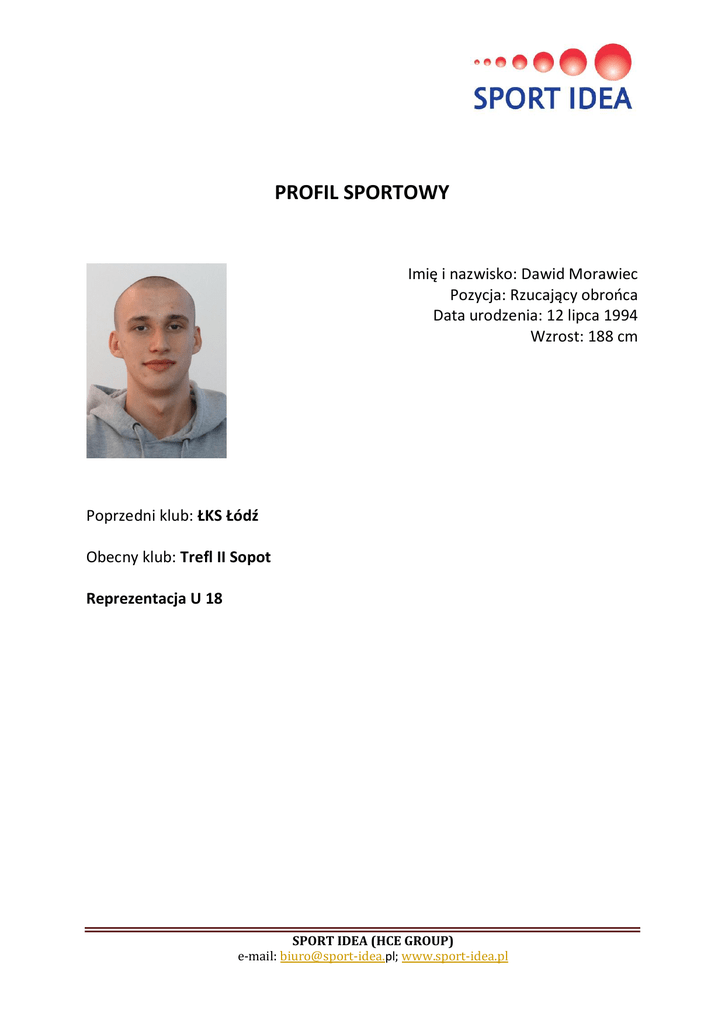 PROFIL SPORTOWY Imię i nazwisko: Dawid Morawiec Pozycja: Rzucający obrońca Data urodzenia: 12 lipca 1994 Wzrost: 188 cm Poprzedni klub: ŁKS Łódź Obecny klub: Trefl II Sopot Reprezentacja U 18 SPORT IDEA (HCE GROUP) e-mail: [email protected]; www.sport-idea.pl