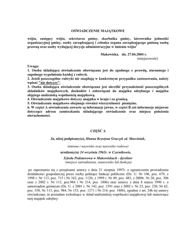 OŚWIADCZENIE MAJĄTKOWE wójta, zastępcy wójta, sekretarza gminy, skarbnika gminy, kierownika jednostki organizacyjnej gminy, osoby zarządzającej i członka organu zarządzającego gminną osobą prawną oraz osoby wydającej decyzje administracyjne w imieniu wójta1 Makowiska, dn. 27.04.2004 r. (miejscowość) Uwaga: 1. Osoba składająca oświadczenie obowiązana jest do zgodnego z prawdą, starannego i zupełnego wypełnienia każdej z rubryk. 2. Jeżeli poszczególne rubryki nie znajdują w konkretnym przypadku zastosowania, należy wpisać "nie dotyczy". 3. Osoba składająca oświadczenie obowiązana jest określić przynależność poszczególnych składników majątkowych, dochodów i zobowiązań do majątku odrębnego i majątku objętego małżeńską wspólnością majątkową. 4. Oświadczenie majątkowe dotyczy majątku w kraju i za granicą. 5. Oświadczenie majątkowe obejmuje również wierzytelności pieniężne. 6. W części A oświadczenia zawarte są informacje jawne, w części B zaś informacje niejawne dotyczące adresu zamieszkania składającego oświadczenie oraz miejsca położenia nieruchomości. CZĘŚĆ A Ja, niżej podpisany(a), Hanna Krystyna Graczyk zd. Marciniak, (imiona i nazwisko oraz nazwisko rodowe) urodzony(a) 24 września 1962r. w Czernikowie, Szkoła Podstawowa w Makowiskach - dyrektor (miejsce zatrudnienia, stanowisko lub funkcja) po zapoznaniu się z przepisami ustawy z dnia 21 sierpnia 1997r. o ograniczeniu prowadzenia działalności gospodarczej przez osoby pełniące funkcje publiczne (Dz. U. Nr 106, poz. 679, z 1998 r. Nr 113, poz. 715 i Nr 162, poz. 1126, z 1999 r. Nr 49, poz. 483, z 2000r. Nr 26, poz. 306 oraz z 2002 r. Nr 113, poz.984 i Nr 214, poz. 1806) oraz ustawy z dnia 8 marca 1990 r. o samorządzie gminnym (Dz. U. z 2001 r. Nr 142, poz. 1591 oraz z 2002 r. Nr 23, poz. 220, Nr 62, poz. 558, Nr 113, poz. 984, Nr 153, poz. 1271 i Nr 214, poz. 1806), zgodnie z art. 24h tej ustawy oświadczam, że posiadam wchodzące w skład małżeńskiej wspólności majątkowej lub stanowiące mój majątek odrębny: I. Zasoby pieniężne: - środki pieniężne zgromadzone w walucie polskiej: 37.000 zł – małżeńska wspólnota majątkowa; należność z Urzędu Skarbowego 13.914,19 zł- małżeńska wspólnota majątkowa - środki pieniężne zgromadzone w walucie obcej: nie dotyczy - papiery wartościowe: nie dotyczy na kwotę: ....................................................................................................................................... II. 1. Dom o powierzchni: 168 m2, o wartości: 250.000 zł tytuł prawny: małżeńska wspólnota majątkowa 2. Mieszkanie o powierzchni: nie dotyczy m2, o wartości: ………………………………….. tytuł prawny: ………………………………………………………………………………………... 3. Gospodarstwo rolne: nie dotyczy rodzaj gospodarstwa: ......................................., powierzchnia: .......................................................... o wartości: ........................................................................................................................................... rodzaj zabudowy: ................................................................................................................................ tytuł prawny: ....................................................................................................................................... Z tego tytułu osiągnąłem(łam) w roku ubiegłym przychód i dochód w wysokości: ............................................................................................................................................................. 4. Inne nieruchomości: powierzchnia: 0,16660 ha o wartości: 5.000 zł tytuł prawny: małżeńska wspólnota majątkowa III. Posiadam udziały w spółkach handlowych - należy podać liczbę i emitenta udziałów: nie dotyczy .............................................................................................................................................................. .............................................................................................................................................................. .............................................................................................................................................................. udziały te stanowią pakiet większy niż 10% udziałów w spółce: .............................................................................................................................................................. .............................................................................................................................................................. Z tego tytułu osiągnąłem(łam) w roku ubiegłym dochód w wysokości: .............................................................................................................................................................. .............................................................................................................................................................. IV. Posiadam akcje w spółkach handlowych - należy podać liczbę i emitenta akcji: nie dotyczy .............................................................................................................................................................. .............................................................................................................................................................. .............................................................................................................................................................. akcje te stanowią pakiet większy niż 10% akcji w spółce: ..................................................................................................................................