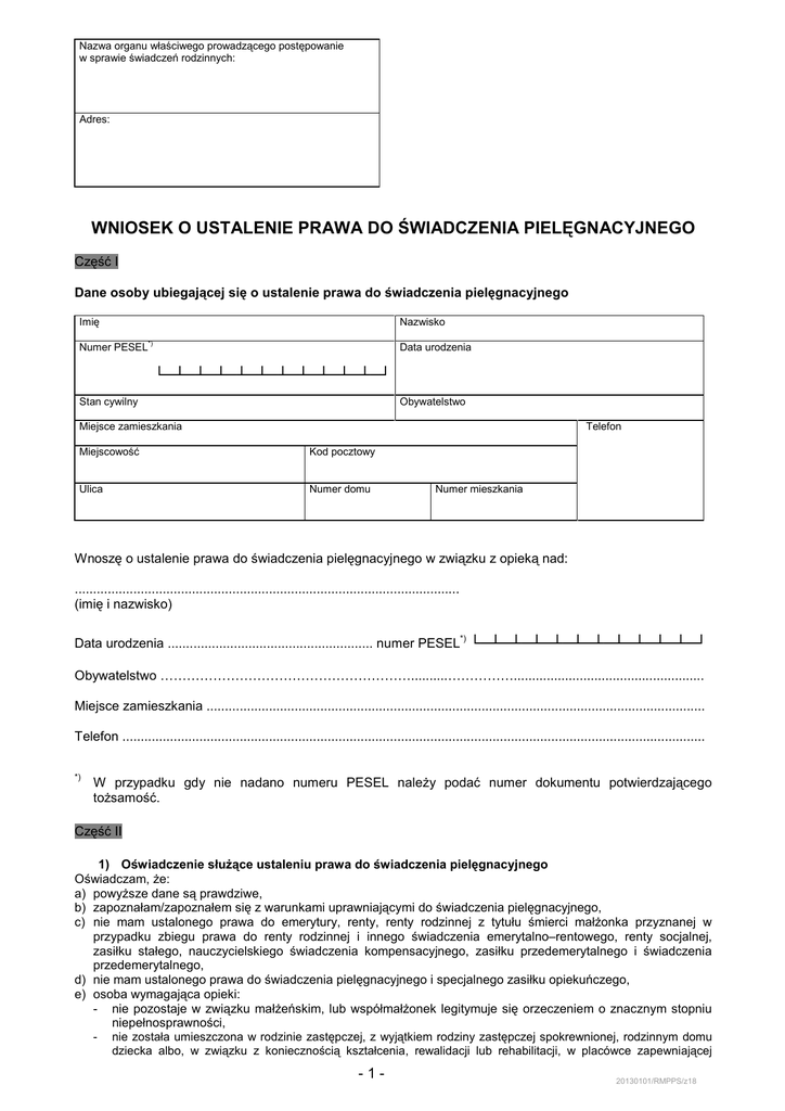 Nazwa organu właściwego prowadzącego postępowanie w sprawie świadczeń rodzinnych: Adres: WNIOSEK O USTALENIE PRAWA DO ŚWIADCZENIA PIELĘGNACYJNEGO Część I Dane osoby ubiegającej się o ustalenie prawa do świadczenia pielęgnacyjnego Imię Nazwisko Numer PESEL*) Data urodzenia └─┴─┴─┴─┴─┴─┴─┴─┴─┴─┴─┘ Stan cywilny Obywatelstwo Miejsce zamieszkania Telefon Miejscowość Kod pocztowy Ulica Numer domu Numer mieszkania Wnoszę o ustalenie prawa do świadczenia pielęgnacyjnego w związku z opieką nad: ......................................................................................................... (imię i nazwisko) *) Data urodzenia ........................................................ numer PESEL └─┴─┴─┴─┴─┴─┴─┴─┴─┴─┴─┘ Obywatelstwo …………………………………………………..........…………….................................................... Miejsce zamieszkania ........................................................................................................................................ Telefon ............................................................................................................................................................... *) W przypadku gdy nie nadano numeru PESEL należy podać numer dokumentu potwierdzającego tożsamość. Część II 1) Oświadczenie służące ustaleniu prawa do świadczenia pielęgnacyjnego Oświadczam, że: a) powyższe dane są prawdziwe, b) zapoznałam/zapoznałem się z warunkami uprawniającymi do świadczenia pielęgnacyjnego, c) nie mam ustalonego prawa do emerytury, renty, renty rodzinnej z tytułu śmierci małżonka przyznanej w przypadku zbiegu prawa do renty rodzinnej i innego świadczenia emerytalno–rentowego, renty socjalnej, zasiłku stałego, nauczycielskiego świadczenia kompensacyjnego, zasiłku przedemerytalnego i świadczenia przedemerytalnego, d) nie mam ustalonego prawa do świadczenia pielęgnacyjnego i specjalnego zasiłku opiekuńczego, e) osoba wymagająca opieki: - nie pozostaje w związku małżeńskim, lub współmałżonek legitymuje się orzeczeniem o znacznym stopniu niepełnosprawności, - nie została umieszczona w rodzinie zastępczej, z wyjątkiem rodziny zastępczej spokrewnionej, rodzinnym domu dziecka albo, w związku z koniecznością kształcenia, rewalidacji lub rehabilitacji, w placówce zapewniającej -1- 20130101/RMPPS/z18 f) g) h) i) j) całodobową opiekę, w tym w specjalnym ośrodku szkolno-wychowawczym, z wyjątkiem podmiotu wykonującego działalność leczniczą, lub nie korzysta w niej z całodobowej opieki przez więcej niż 5 dni w tygodniu, na osobę wymagającą opieki inna osoba nie ma ustalonego prawa do wcześniejszej emerytury, członek rodziny osoby sprawującej opiekę nie ma ustalonego prawa do dodatku do zasiłku rodzinnego, o którym mowa w art. 10 ustawy, specjalnego zasiłku opiekuńczego i świadczenia pielęgnacyjnego, na osobę wymagającą opieki nie jest ustalone prawo do dodatku do zasiłku rodzinnego, o którym mowa w art. 10 ustawy, prawo do specjalnego zasiłku opiekuńczego i prawo świadczenia pielęgnacyjnego, na osobę wymagającą opieki inna osoba nie jest uprawniona za granicą do świadczenia na pokrycie wydatków związanych z opieką, lub przepisy o koordynacji systemów zabezpieczenia społecznego lub dwustronne umowy o zabezpieczeniu społecznym stanowią, że przysługujące za granicą świadczenie na pokrycie wydatków związanych z opieką nie wyłącza prawa do takiego świadczenia na podstawie ustawy, nie jestem zatrudniony/zatrudniona ani nie wykonuję innej pracy zarobkowej (przez zatrudnienie lub wykonywanie innej pracy zarobkowej rozumie się: wykonywanie pracy na podstawie stosunku pracy, stosunku służbowego, umowy o pracę nakładczą oraz wykonywanie pracy lub świadczenie usług na podstawie umowy agencyjnej, umowy zlecenia, umowy o dzieło albo w okresie członkostwa w rolniczej spółdzielni produkcyjnej, spółdzielni kółek rolniczych lub spółdzielni usług rolniczych, a także prowadzenie pozarolniczej działalności gospodarczej). ............................................................................................. (data, podpis osoby ubiegającej się) 2) Oświadczenie dotyczące ustalenia prawa do świadczenia pielęgnacyjnego dla osoby, na której zgodnie z przepisami ustawy z dnia 25 lutego 1964 r. – Kodeks rodzinny i opiekuńczy (Dz. U. z 2012 r. poz. 788) ciąży obowiązek alimentacyjny, innej niż osoba spokrewniona w pierwszym stopniu, opiekun faktyczny dziecka lub osoba będąca rodziną zastępczą spokrewnioną, w rozumieniu ustawy z dnia 9 czerwca 2011 r. o wspieraniu rodziny i systemie pieczy zastępczej (Dz. U. Nr 149, poz. 887 i Nr 288, poz. 1690 oraz z 2012 r. poz. 579) Oświadczam, że: - rodzice osoby wymagającej opieki nie żyją, zostali pozbawieni praw rodzicielskich, są małoletni lub legitymują się orzeczeniem o znacznym stopniu niepełnosprawności, - nie ma innych osób spokrewnionych w pierwszym stopniu z osobą wymagającą opieki, są małoletnie lub legitymują się orzeczeniem o znacznym stopniu niepełnosprawności oraz - nie ma opiekuna faktycznego dziecka wymagającego opieki ani osoby będącej rodziną zastępczą spokrewnioną dla dziecka wymagającego opieki, w rozumieniu ustawy z dnia 9 czerwca 2011 r. o wspieraniu rodziny i systemie pieczy zastępczej lub legitymują się orzeczeniem o znacznym stopniu niepełnosprawności. ............................................................................................. (data, podpis osoby ubiegającej się) W przypadku zmian mających wpływ na prawo do świadczeń pielęgnacyjnych, w szczególności zaistnienia okoliczności wymienionych powyżej, osoba ubiegająca się jest zobowiązana niezwłocznie powiadomić o tych zmianach podmiot realizujący świadczenia rodzinne. Niepo