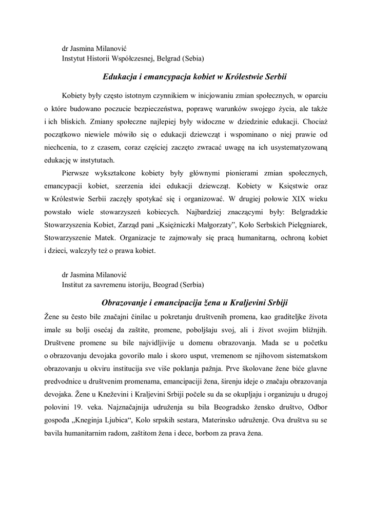 dr Jasmina Milanović Instytut Historii Współczesnej, Belgrad (Sebia) Edukacja i emancypacja kobiet w Królestwie Serbii Kobiety były często istotnym czynnikiem w inicjowaniu zmian społecznych, w oparciu o które budowano poczucie bezpieczeństwa, poprawę warunków swojego życia, ale także i ich bliskich. Zmiany społeczne najlepiej były widoczne w dziedzinie edukacji. Chociaż początkowo niewiele mówiło się o edukacji dziewcząt i wspominano o niej prawie od niechcenia, to z czasem, coraz częściej zaczęto zwracać uwagę na ich usystematyzowaną edukację w instytutach. Pierwsze wykształcone kobiety były głównymi pionierami zmian społecznych, emancypacji kobiet, szerzenia idei edukacji dziewcząt. Kobiety w Księstwie oraz w Królestwie Serbii zaczęły spotykać się i organizować. W drugiej połowie XIX wieku powstało wiele stowarzyszeń kobiecych. Najbardziej znaczącymi były: Belgradzkie Stowarzyszenia Kobiet, Zarząd pani „Księżniczki Małgorzaty”, Koło Serbskich Pielęgniarek, Stowarzyszenie Matek. Organizacje te zajmowały się pracą humanitarną, ochroną kobiet i dzieci, walczyły też o prawa kobiet. dr Jasmina Milanović Institut za savremenu istoriju, Beograd (Serbia) Obrazovanje i emancipacija žena u Kraljevini Srbiji Žene su često bile značajni činilac u pokretanju društvenih promena, kao graditeljke života imale su bolji osećaj da zaštite, promene, poboljšaju svoj, ali i život svojim bližnjih. Društvene promene su bile najvidljivije u domenu obrazovanja. Mada se u početku o obrazovanju devojaka govorilo malo i skoro usput, vremenom se njihovom sistematskom obrazovanju u okviru institucija sve više poklanja pažnja. Prve školovane žene biće glavne predvodnice u društvenim promenama, emancipaciji žena, širenju ideje o značaju obrazovanja devojaka. Žene u Kneževini i Kraljevini Srbiji počele su da se okupljaju i organizuju u drugoj polovini 19. veka. Najznačajnija udruženja su bila Beogradsko žensko društvo, Odbor gospođa „Kneginja Ljubica“, Kolo srpskih sestara, Materinsko udruženje. Ova društva su se bavila humanitarnim radom, zaštitom žena i dece, borbom za prava žena.