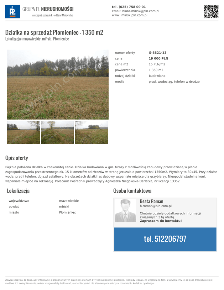 tel. (025) 758 00 01 email: [email protected] www: minsk.pln.com.pl Działka na sprzedaż Płomieniec - 1 350 m2 Lokalizacja: mazowieckie, miński, Płomieniec numer oferty G-8821-13 cena 19 000 PLN cena m2 15 PLN/m2 powierzchnia 1 350 m2 rodzaj działki budowlana media prad, wodociąg, telefon w drodze Opis oferty Pięknie położona działka w znakomitej cenie. Działka budowlana w gm. Mrozy z możliwością zabudowy przewidzianą w planie zagospodarowania przestrzennego ok. 15 kilometrów od Mrozów w stronę Jeruzala o powierzchni 1350m2. Wymiary to 30x45. Przy działce woda, prąd i telefon, dojazd asfaltowy. Na obrzeżach działki las dębowy wspaniałe miejsce dla grzybiarzy. Nieopodal stadnina koni, wspaniałe miejsce na rekraację. Polecam! Pośrednik prowadzący Agnieszka Niegowska-Derlatka, nr licencji 13352 Lokalizacja Osoba kontaktowa Beata Roman województwo mazowieckie powiat miński [email protected] miasto Płomieniec Chętnie udzielę dodatkowych informacji związanych z tą ofertą. Zapraszam do kontaktu! tel. 512206797 Zawsze dążymy do tego, aby informacje o proponowanych przez nas ofertach były jak najbardziej dokładne. Niekiedy jednak, ze względu na fakt, iż uzyskujemy je od osób trzecich nie jest możliwe ich zweryfikowanie, wobec czego należy traktować je orientacyjnie i nie stanowią one oferty w rozumieniu kodeksu cywilnego.